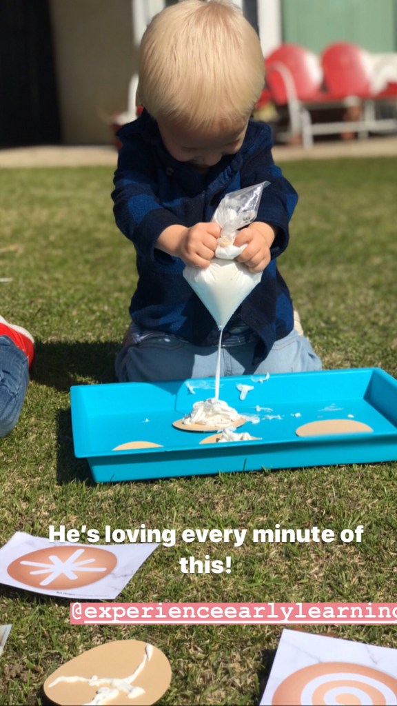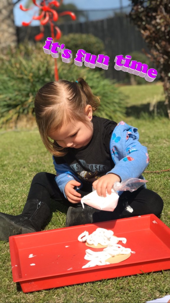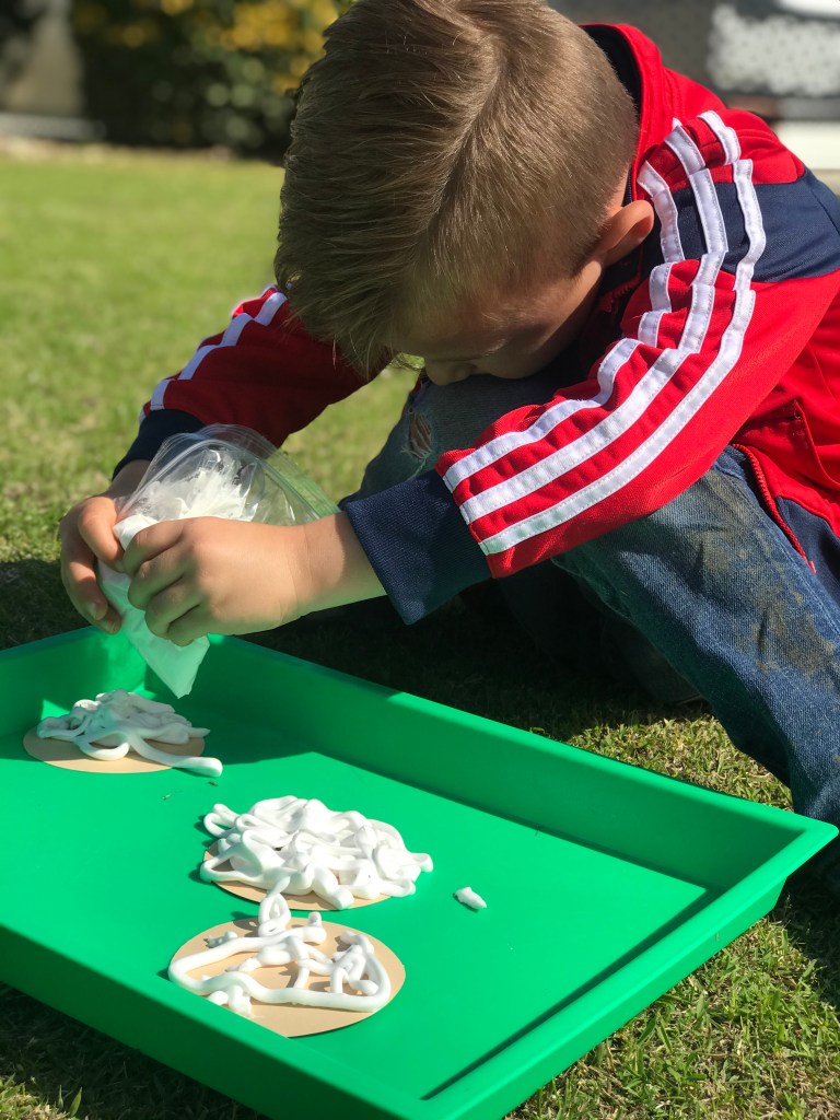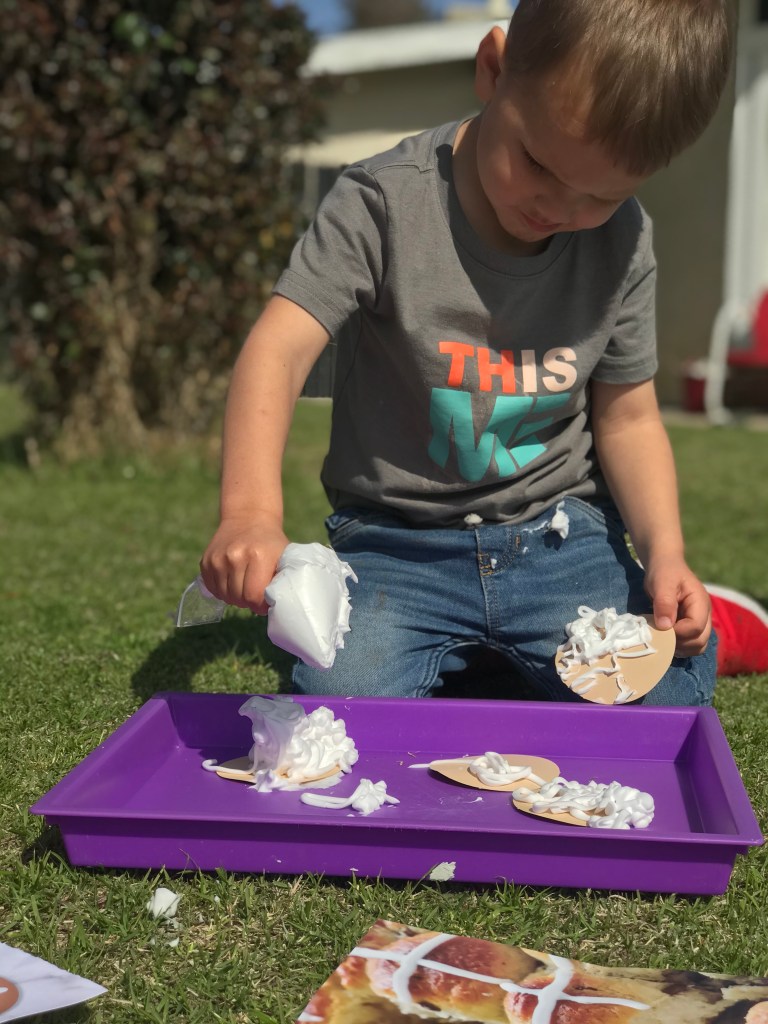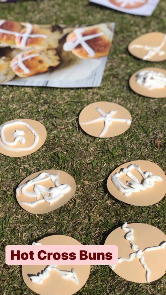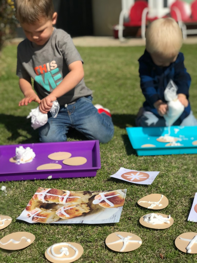 We enjoyed singing this rhyme while we were pretending to bake hot cross buns. They loved it! I mixed shaving creme and white paint, I then put it in the bags provided then we frosted. Their faces are priceless. My younger ones were convinced we could eat it because it looked so realistic.