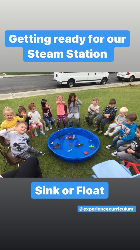 A pond is a body of water smaller than a lake. Ponds support a very wide range of wildlife: ducks, turtles, swans, small fish and frogs can live in a pond. Usually, in most ponds sunlight can reach to bottom. In some cases ponds do not last all year round. We enjoyed our STEAM Station watching how different items would sink or float in the pond. We talked about how a pond is different from a river or a stream because it does not have moving water and it differs from a lake because it has a small area and is no more than around 1.8m deep. Some ponds are formed naturally, filled either by an underwater spring, or by rainwater.