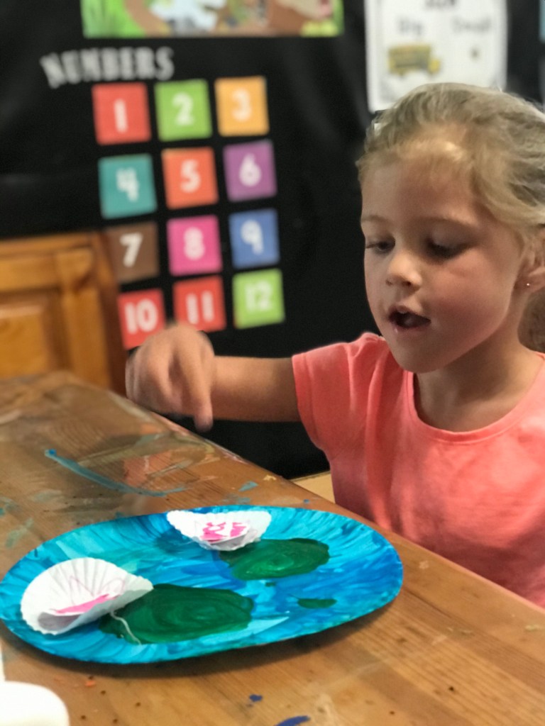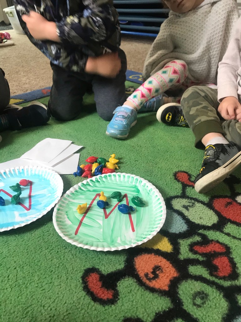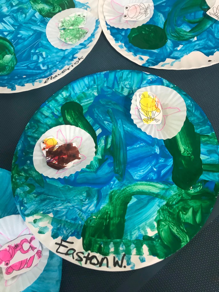 We made our own ponds on a plate using cupcake liners or the lill’y pads and then putting our little frogs on them. We talked about the frog life cycle and are excited to hopefully be getting tadpoles soon.