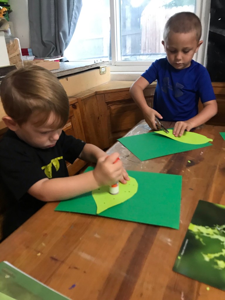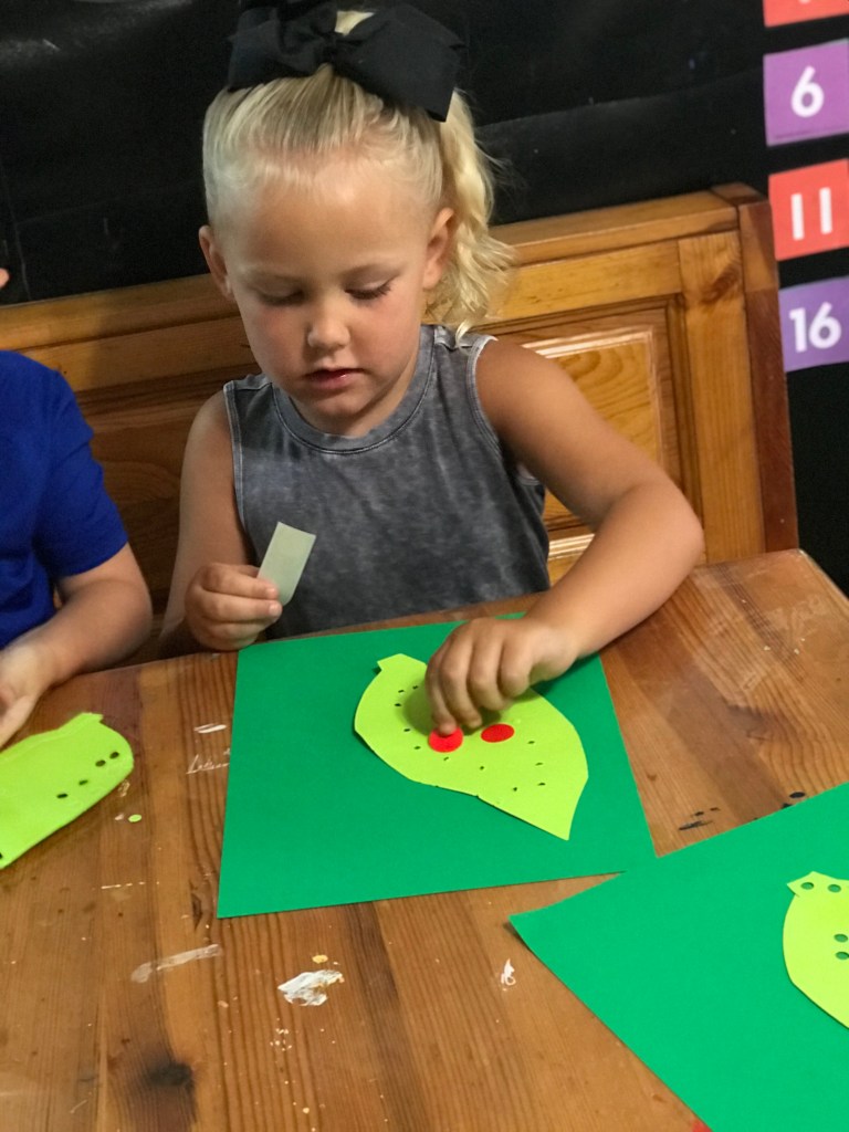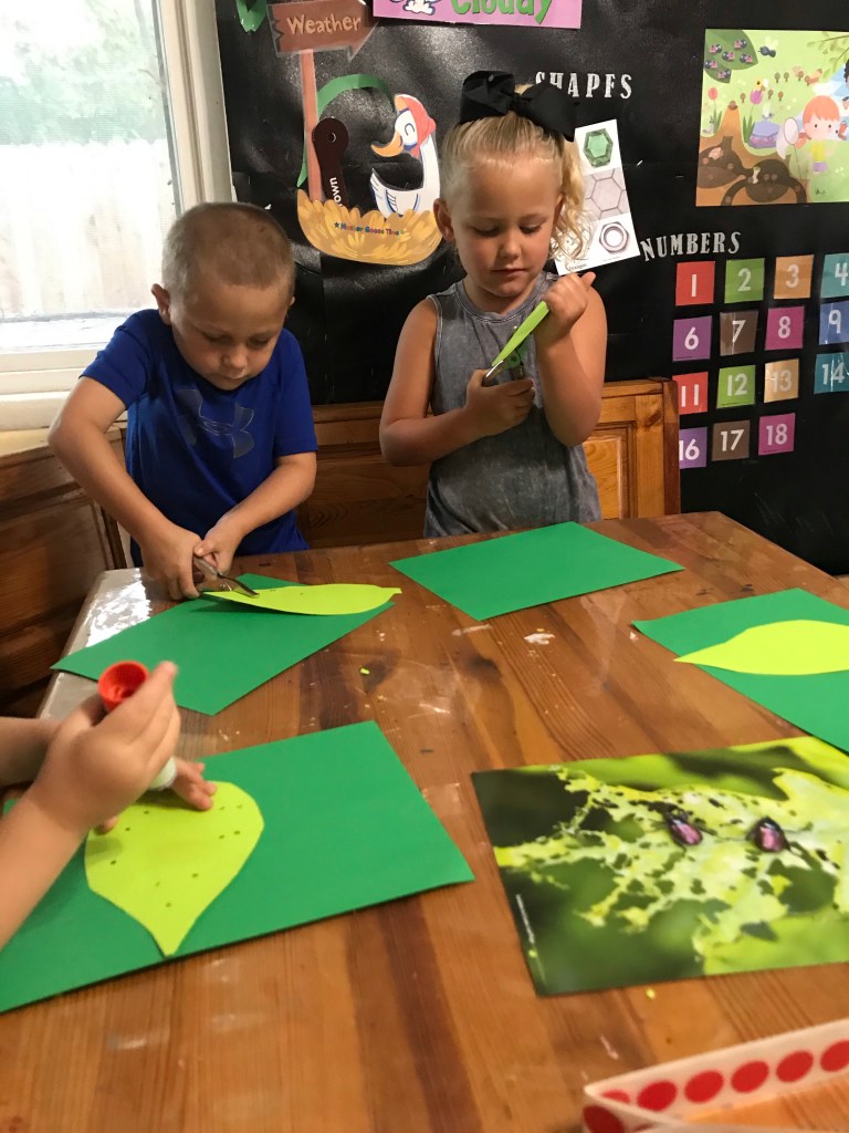 This week we learned about Leaf Cutter Bugs and that their are several types of bugs that cut leaf’s. We were fascinated with how fast they could change the look of the leaf. We used a hole puncher to make holes in the leaf and then glued them down. We then added our bugs and drew on legs to our red sticker making it look like a leaf cutter bug.