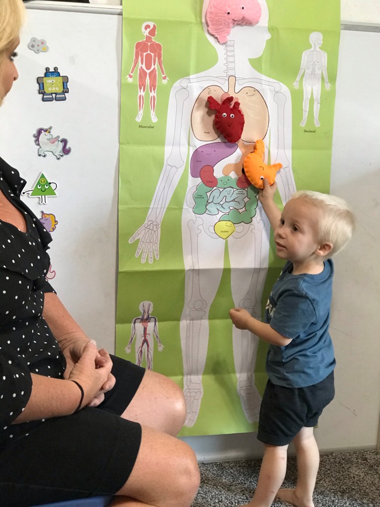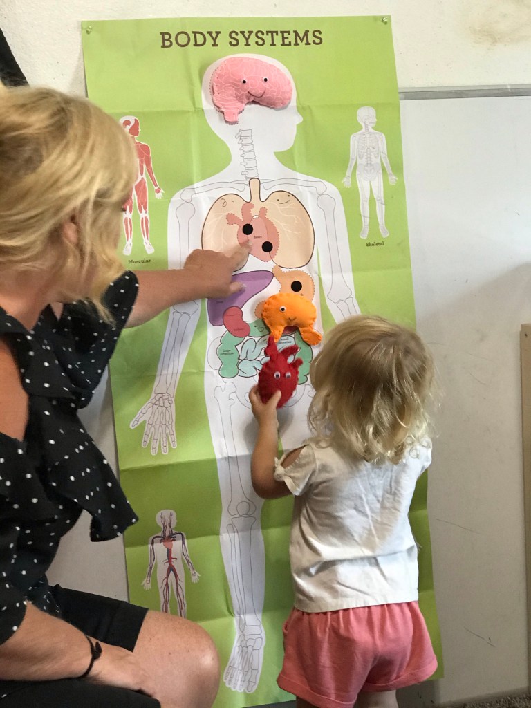 We also learned about our body system what is inside. We talked about how our skin protects our inside organs. The kids had a chance to match up the organs to where they belonged on the skeleton. Miss Brooke even showed where her veins were in her hand and explained how blood moved through her veins. They sat completely still and were very intrigued with putting the organs in the body.