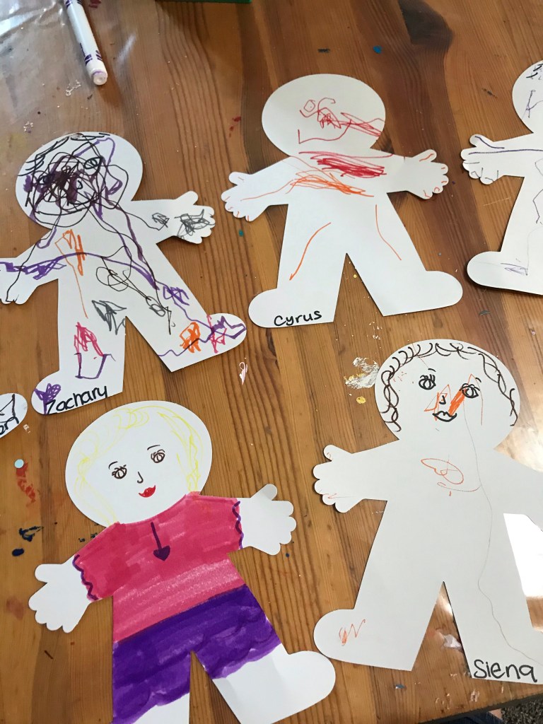 Our first lesson of the week started with a Community Challenge where in circle time we worked together to build or share something this helps them build a sense of belonging, we also make a self-portrait focusing on self-awareness. I really enjoy when we are able work together on projects.