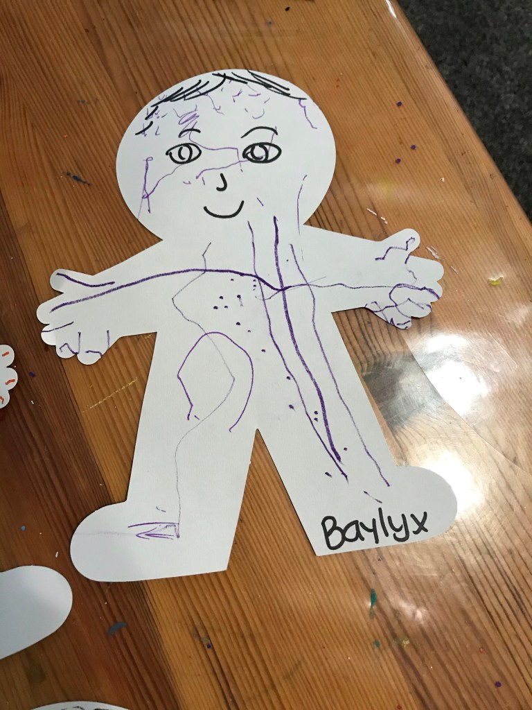 Our creative art activity for lesson three was alot of fun we discussed what they noticed about the x-ray photo? And how they could feel bones under their own skin. Some of my littles didn’t like the thought you could feel your own bones and said they didn’t have nay in their body.