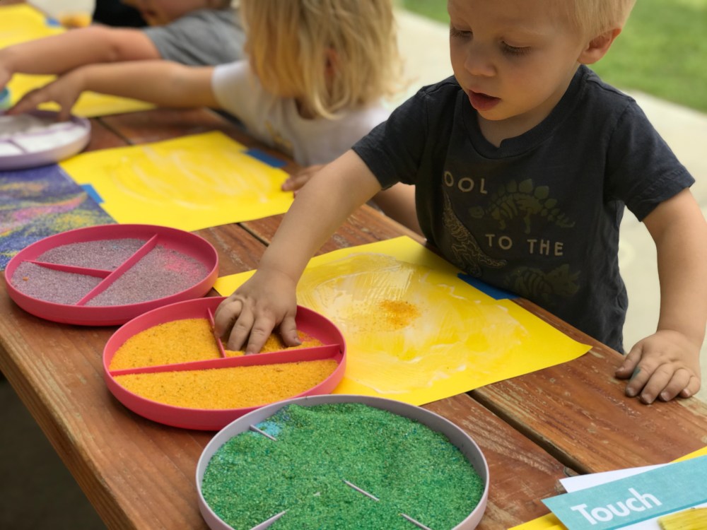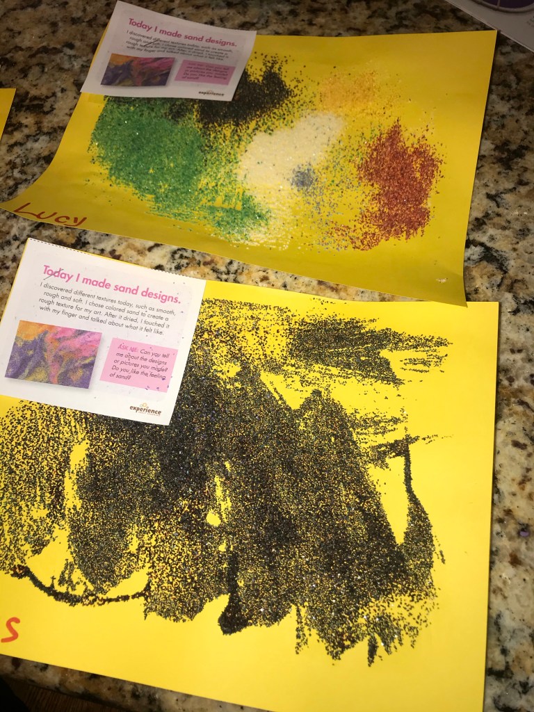 Sand designs helped us to learn about touch – we rubbed our hand across the paper when there was no glue or sand and then applied glue and allowed the kids to pour different colors of sand on their paper. When it had dried we showed the kids the difference of how the paper felt. They enjoyed this activity!