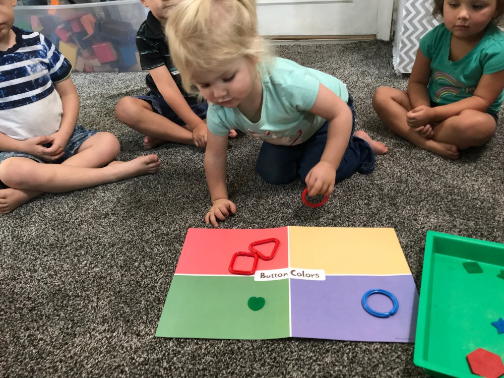 In our activity below they had to wait while their friend chose a shape or button to put in the matching square. We then counted as a team how many where in each square. We love our games from our Experience Early Learning Curriculum they are engaging and easy!