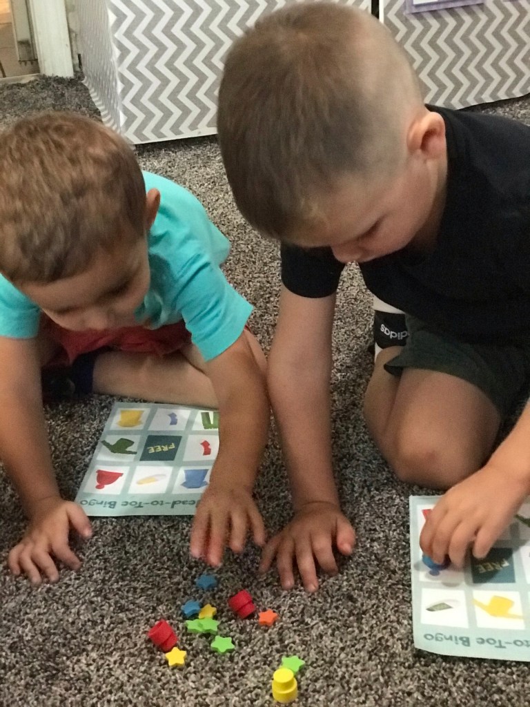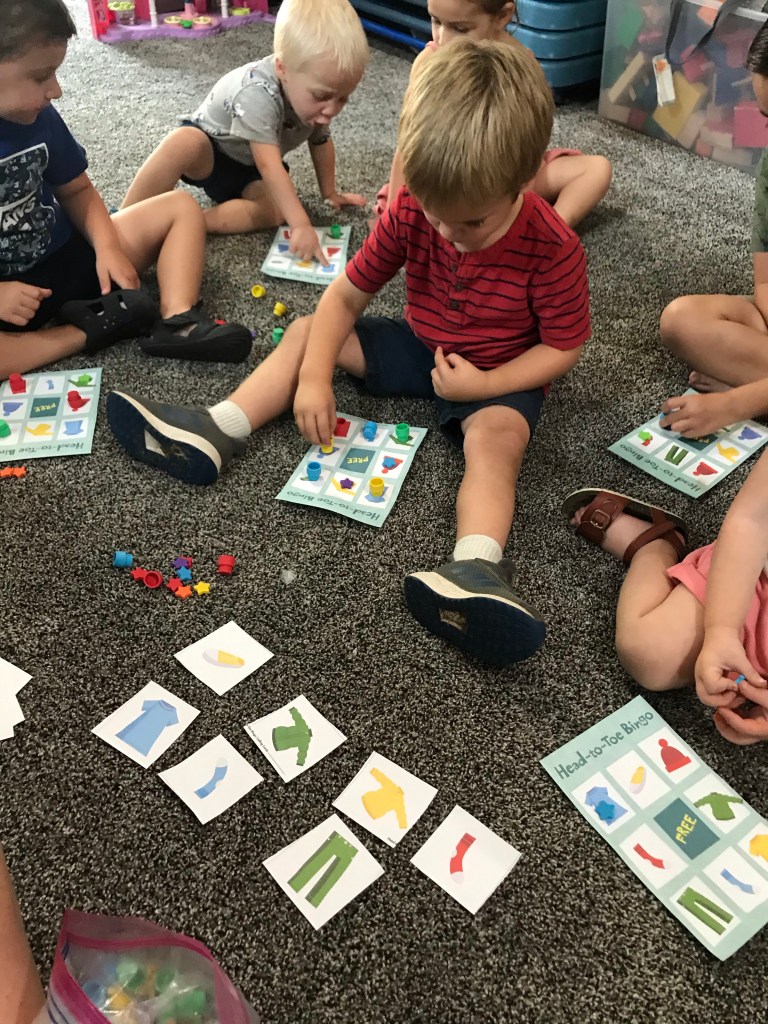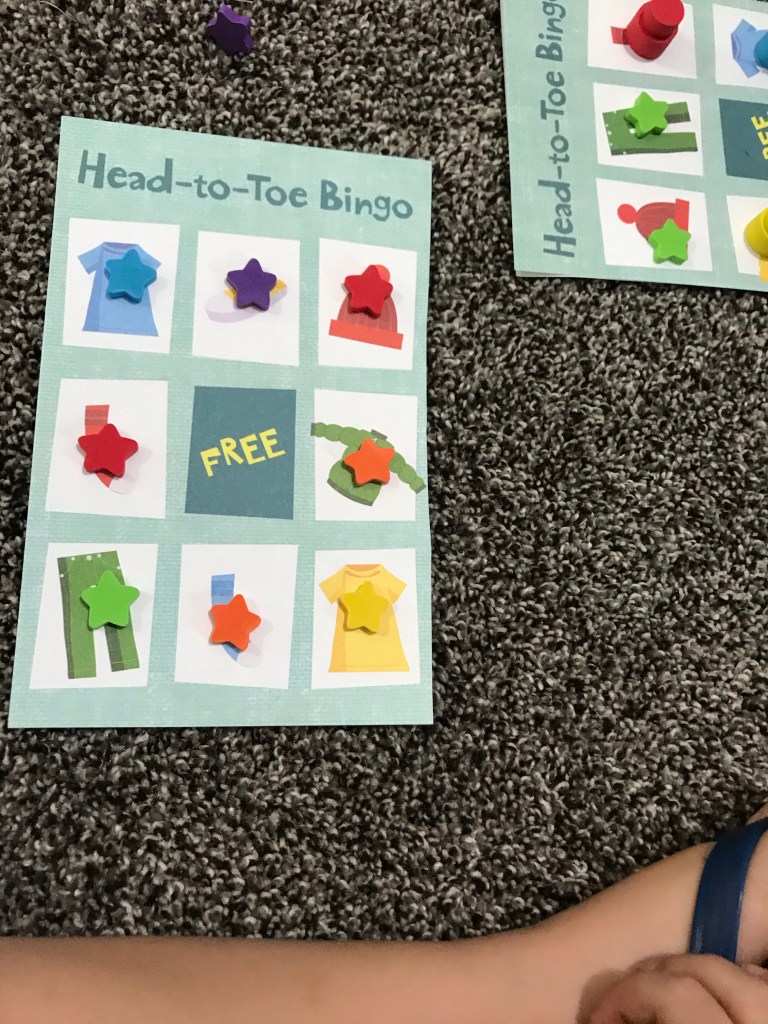 Instead of rolling our dice we had each child take a turn to pick a card, we them worked together to find that item and put a marker on it! They all received a prize for their bingo’s and filling the card.