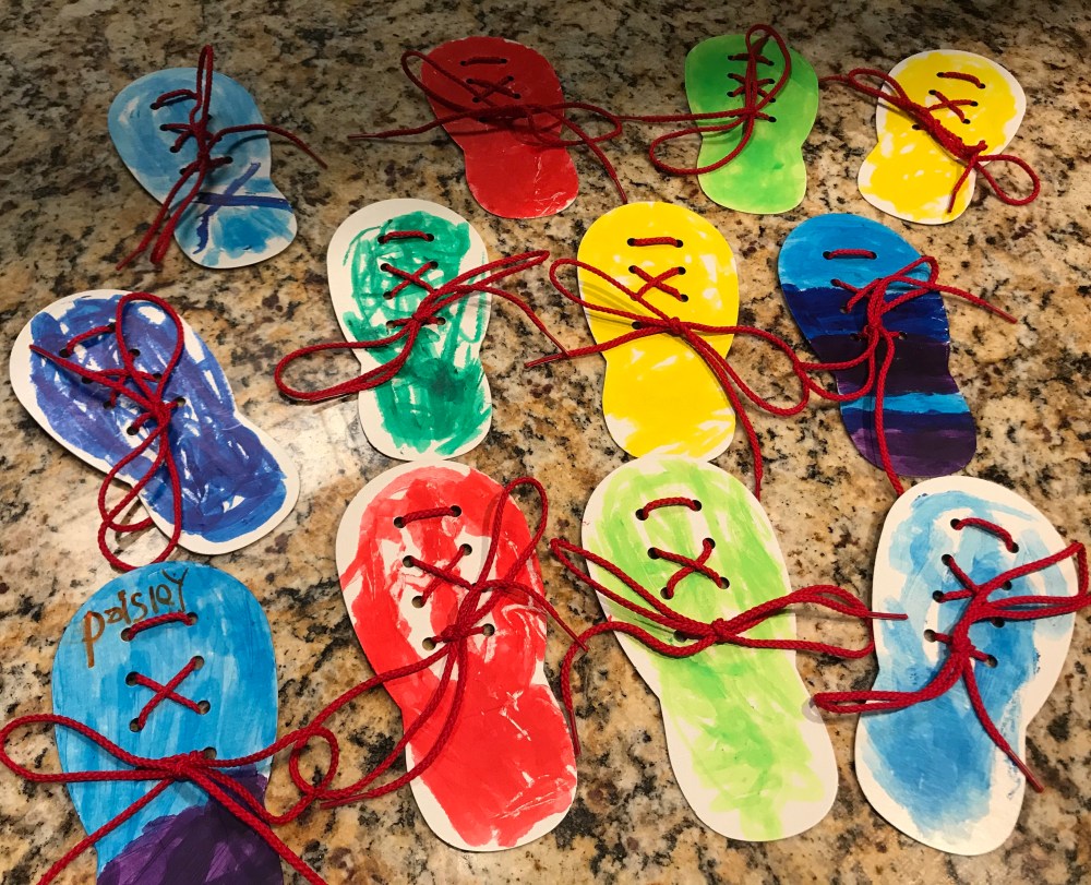 What time of shoe do you wear? How do you tie your show? We invited the kids to decorated their shoe and then practice trying to tie it. we love these Make and Play activities.