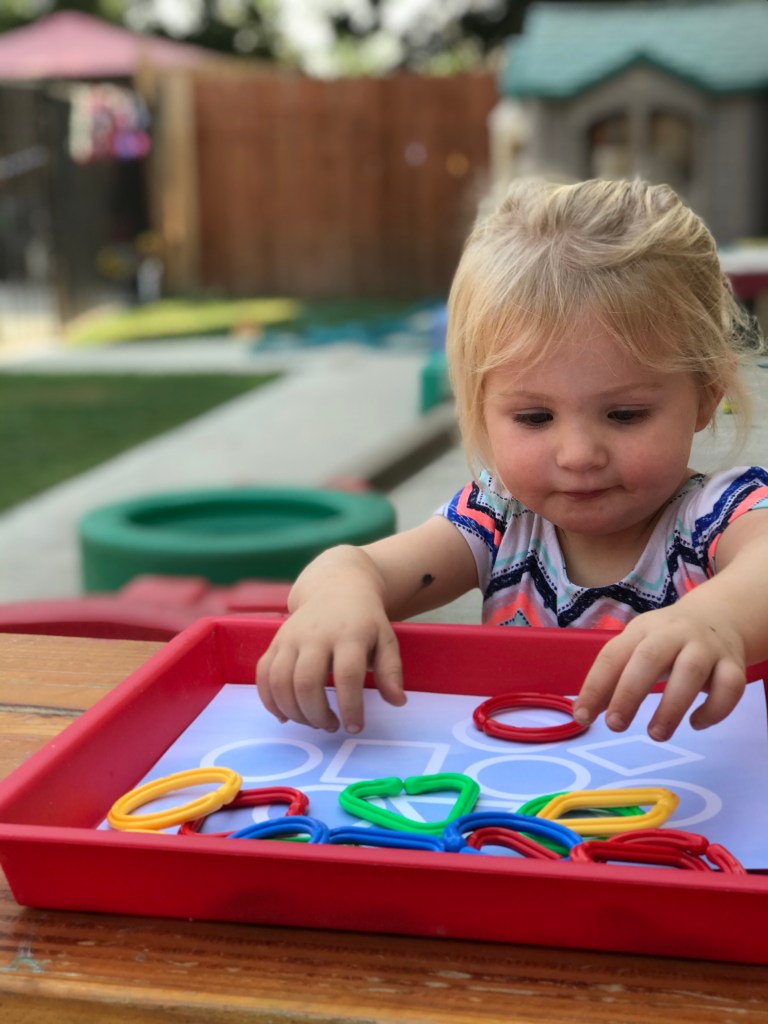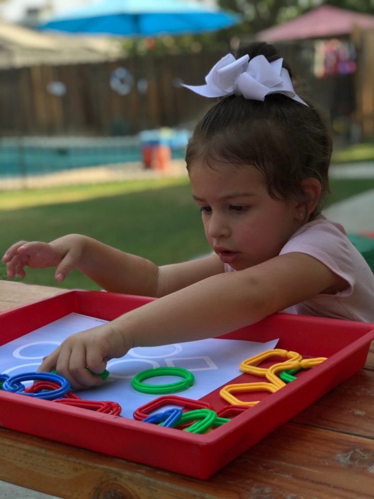 We set out the shape links for the kids to explore, they really enjoyed matching the shapes to our sheet! Some of my littles attached the shapes to make a necklace. And almost all of them did a great job at choosing the link that matched the picture on the dice.