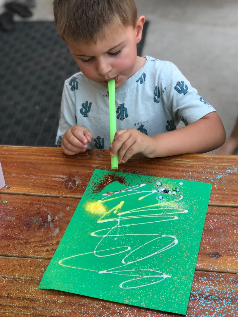 What a mess and a bunch of fun! We used glitter, sequins, and hot air! They loved to watch the glitter get blown onto the paper from the air that they were blowing.