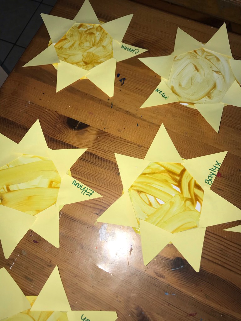 When we see the moon, we can’t see the sun. Where do you think the sun goes? We invited the children to decorate one side of the plate as the sun and the other as the moon. They were fascinated to find out they rotate the earth.