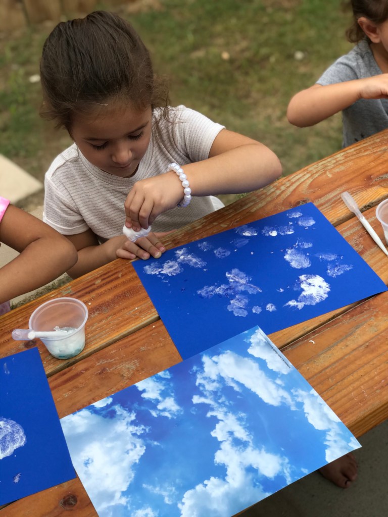 I set out paint, shaving cream and droppers, our droppers would not work for this activity so we gave them cotton balls. I added glitter to the paint and off they went. We were suprised when the paint turned pink on the blue cardstock. We talked about how clouds for and and what shapes clouds can be in .