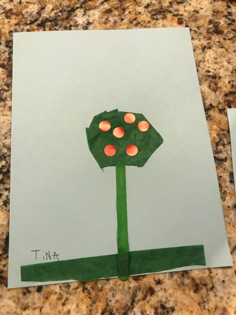 We enjoyed making our cherry tree’s we talked about the different parts of the tree and how they are necessary for the tree to flourish. Each child either tore or cut their tissue paper into a tree shape then glued the tissue paper and the stick down, and finished by adding red cherries.