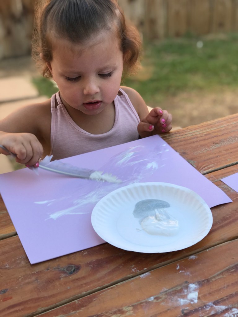Although we don’t get snow where we are we have alot of fun talking about it and making pictures that look like we have went through a snow storm. We imagined that it was snow that we were painting with and how cold it would be. As you can see Cienna is fully engaged in this activity and so very proud of her finished product.