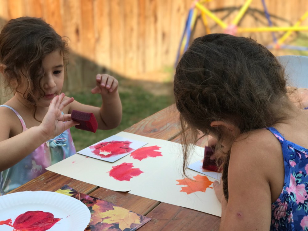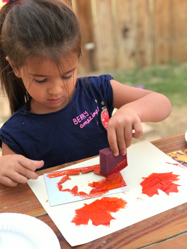 What colors do you see in the photo? Which colors will we use in our art? These questions are prompts that we ask the kids during our activity, they make me giggle with some of the reasons they choose. Their innocence and love for things around them make all of our activities fun! The kids choose red and orange for their paint color. We stamped our leaves on the paper and then laminated for a fall placemat to take home. We worked on visual arts and fine motor skills with this activity!