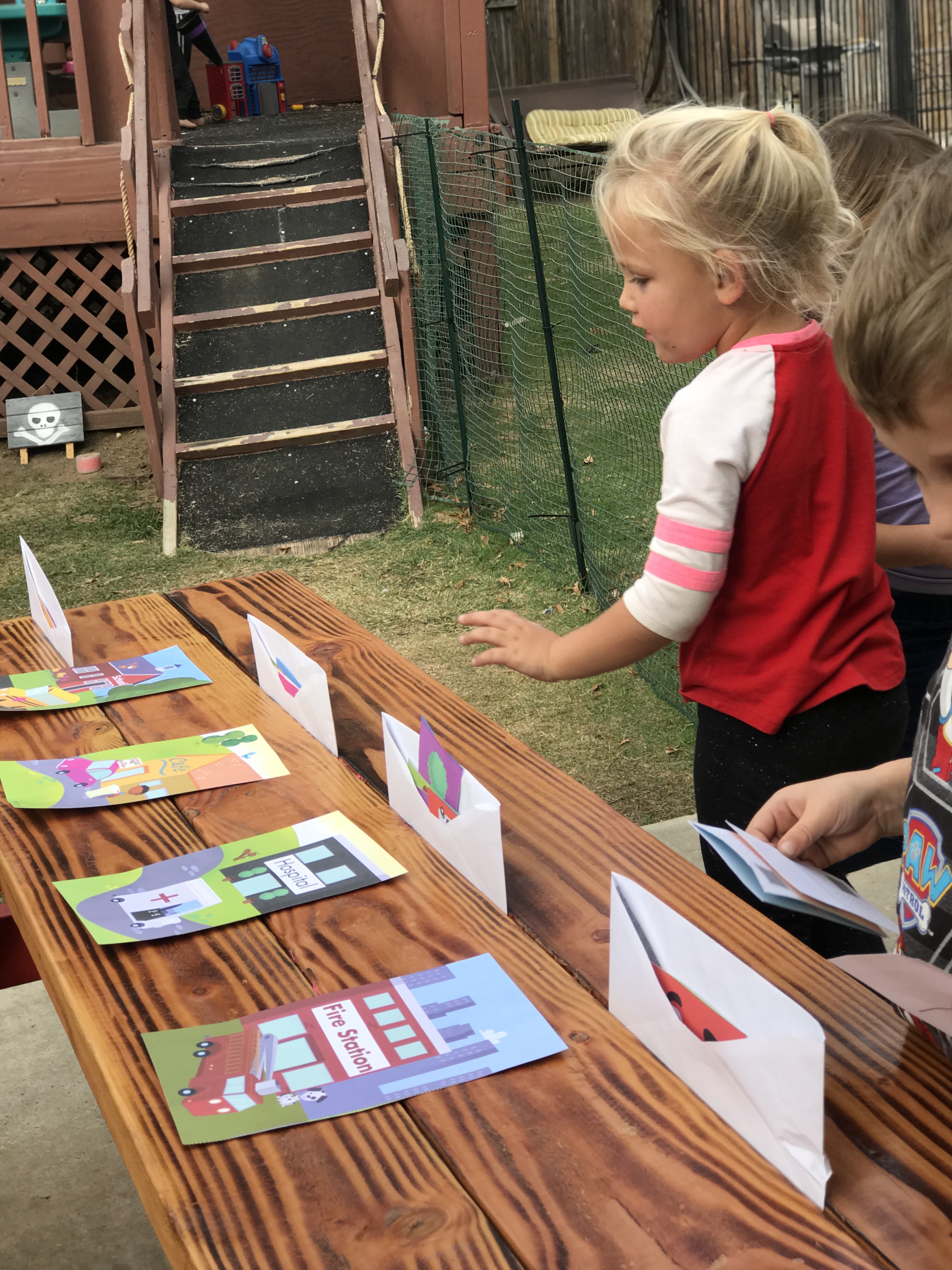 We practiced sorting in this activity below. We pretended to be postal carriers by looking at the cards we were given and sorting them into the correct envelop. All ages of kids enjoyed this, we even started timing them (their request) to see how fast they could sort.