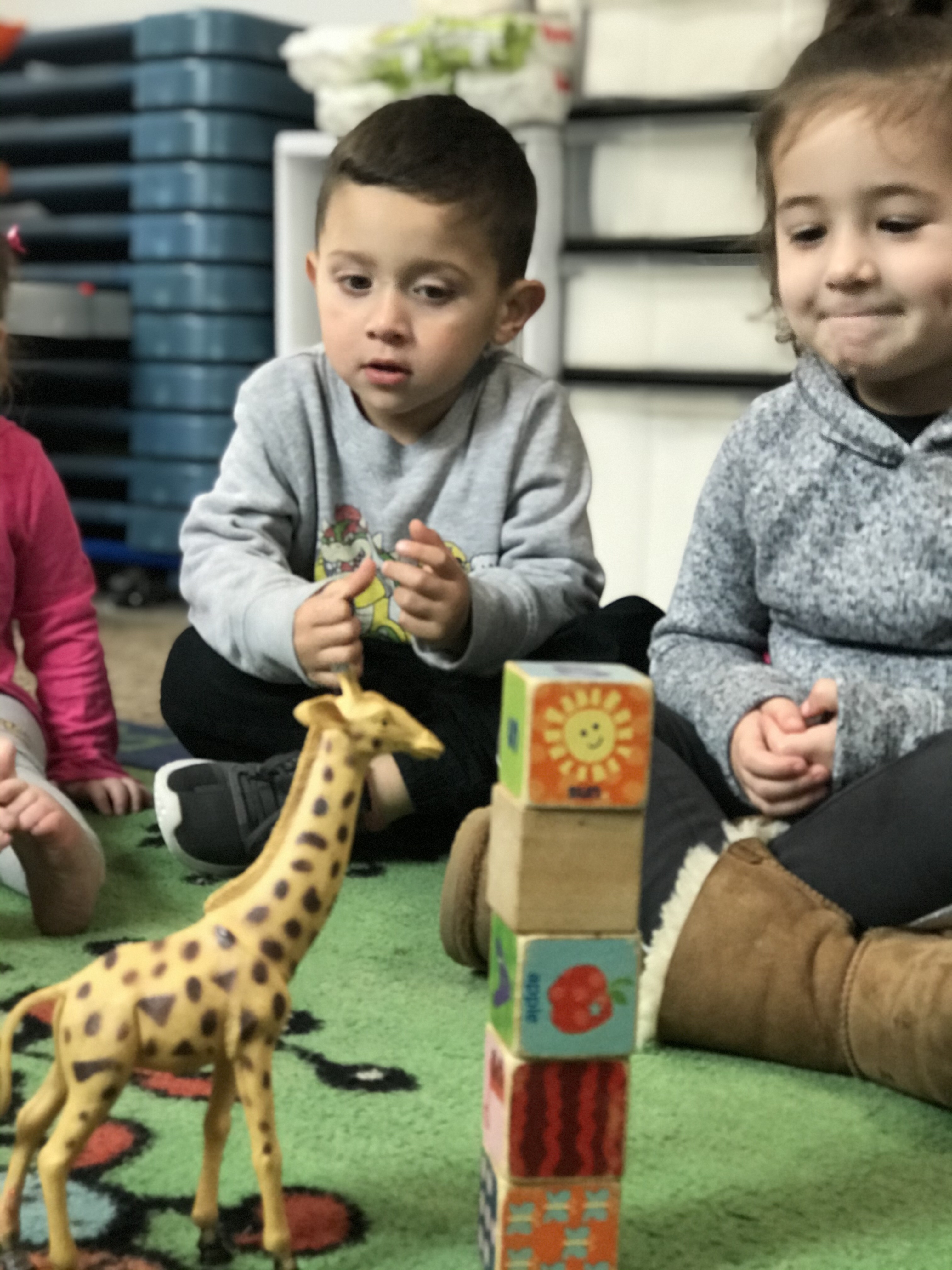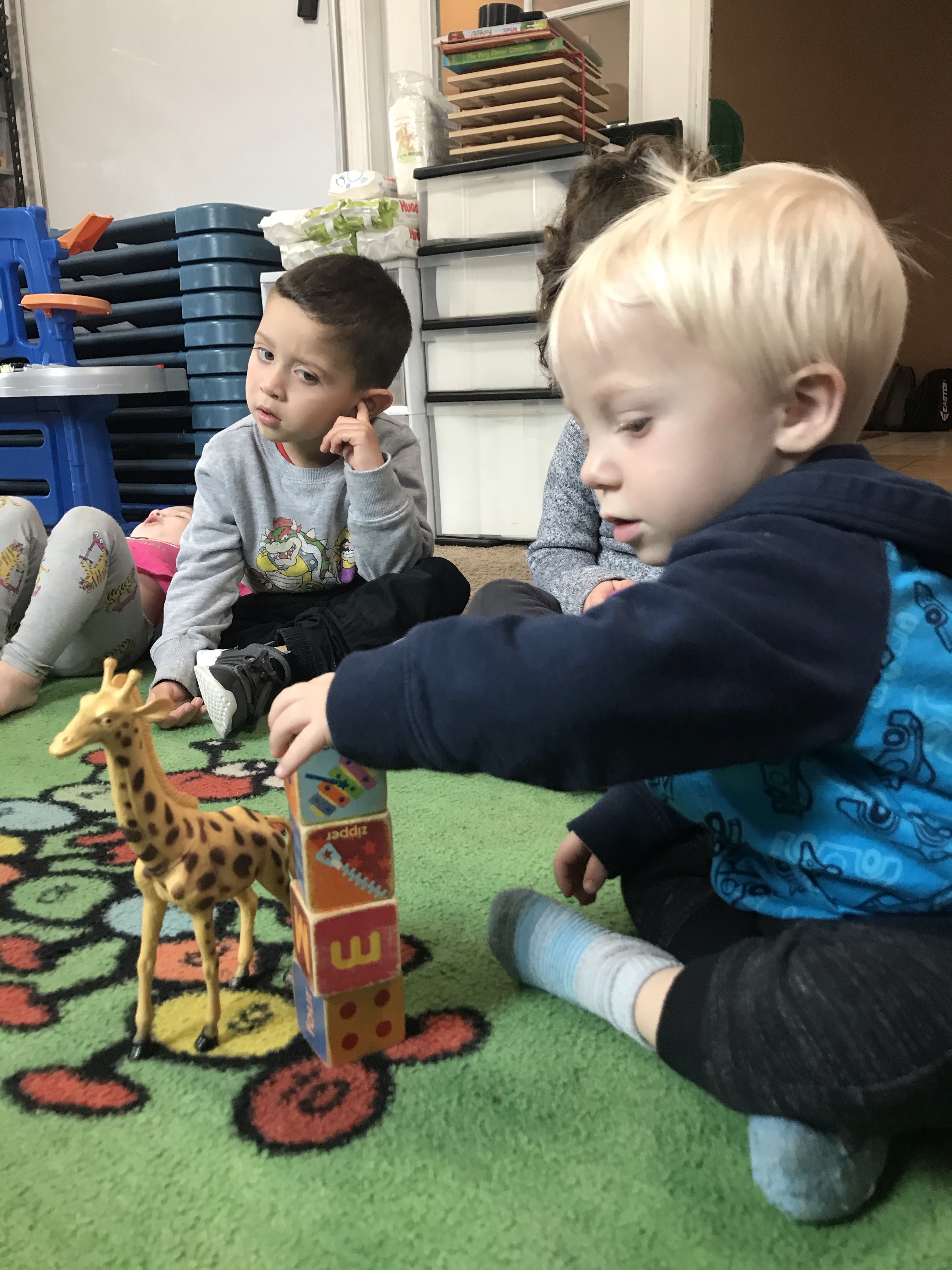 We spent alot of time measuring and counting any animal we could find in our playroom, we learned that our giraffe was 5 blocks high. They really enjoyed this activity, they were curious how big a real Giraffe would be.