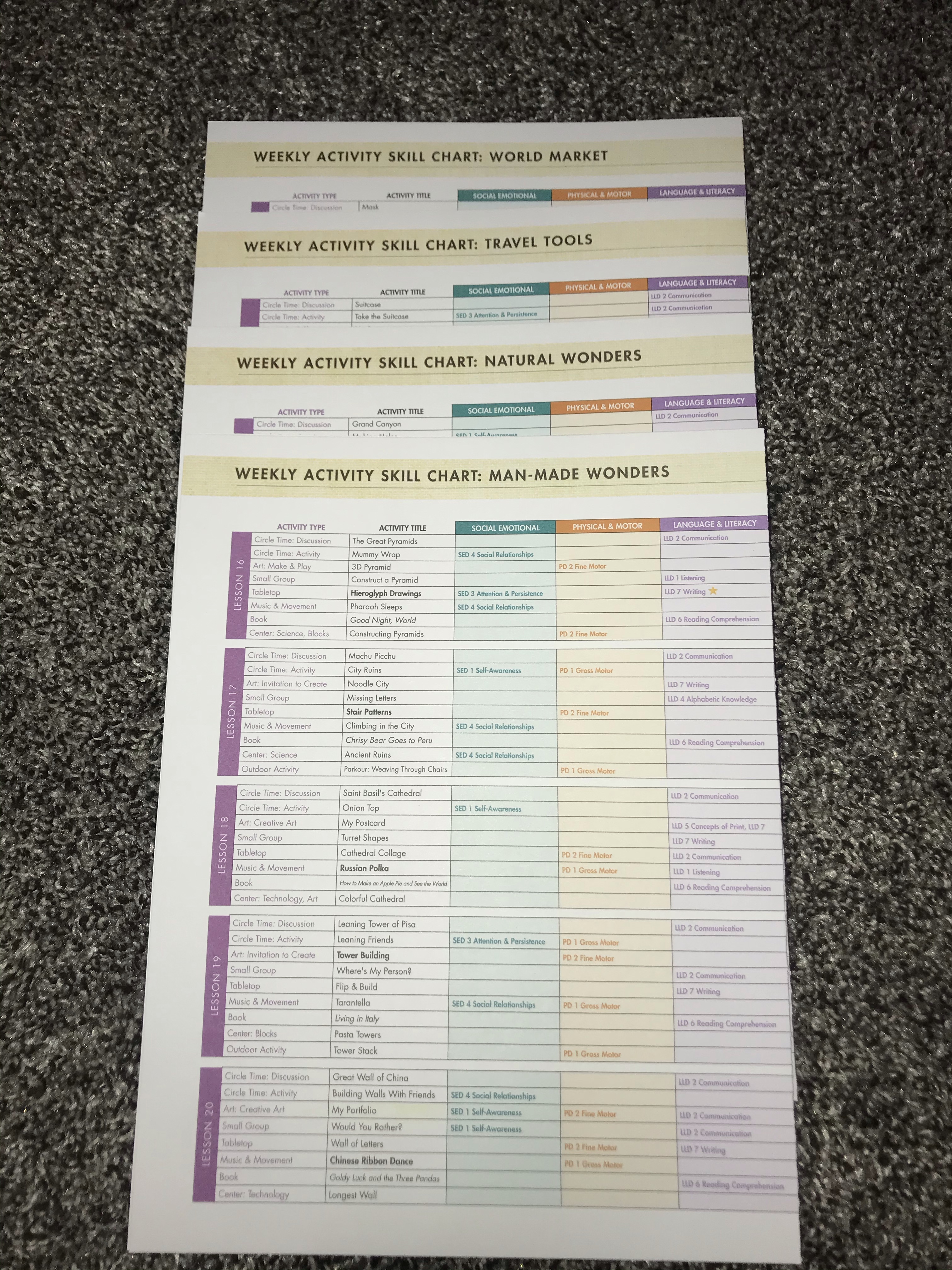 Each week we are given a Weekly Activity Chart and Lesson Plan. Great ways to stay organized!