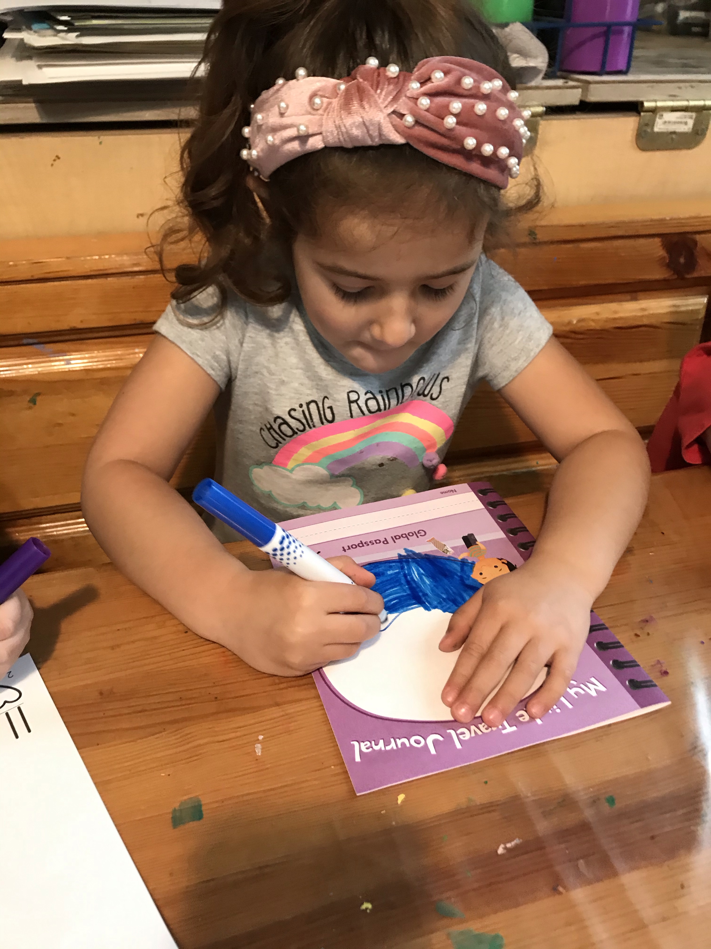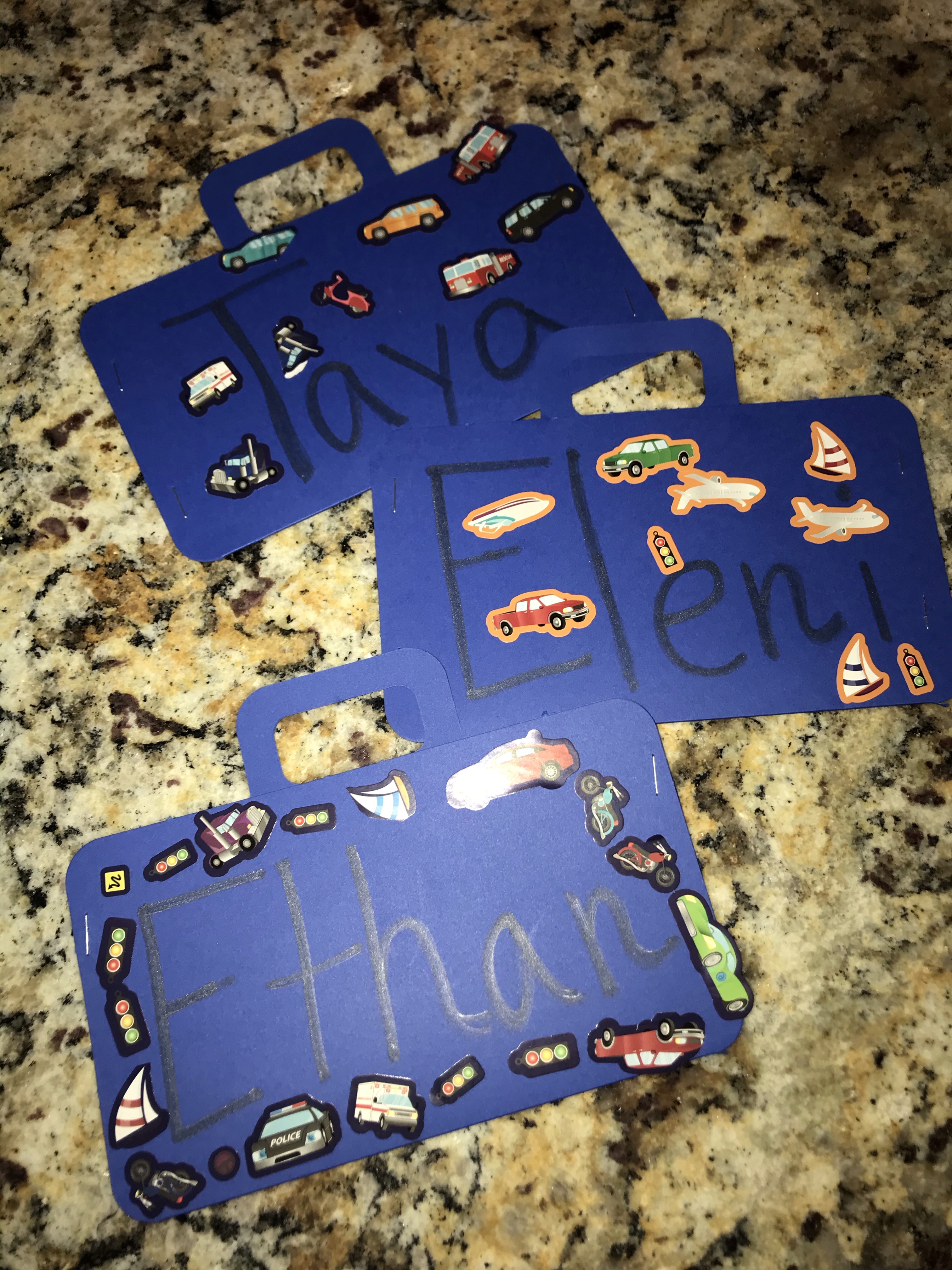 We invited our children to decorate with stickers and pretend to take a trip. We discussed who they might want to visit? And what they might take with them when they go.