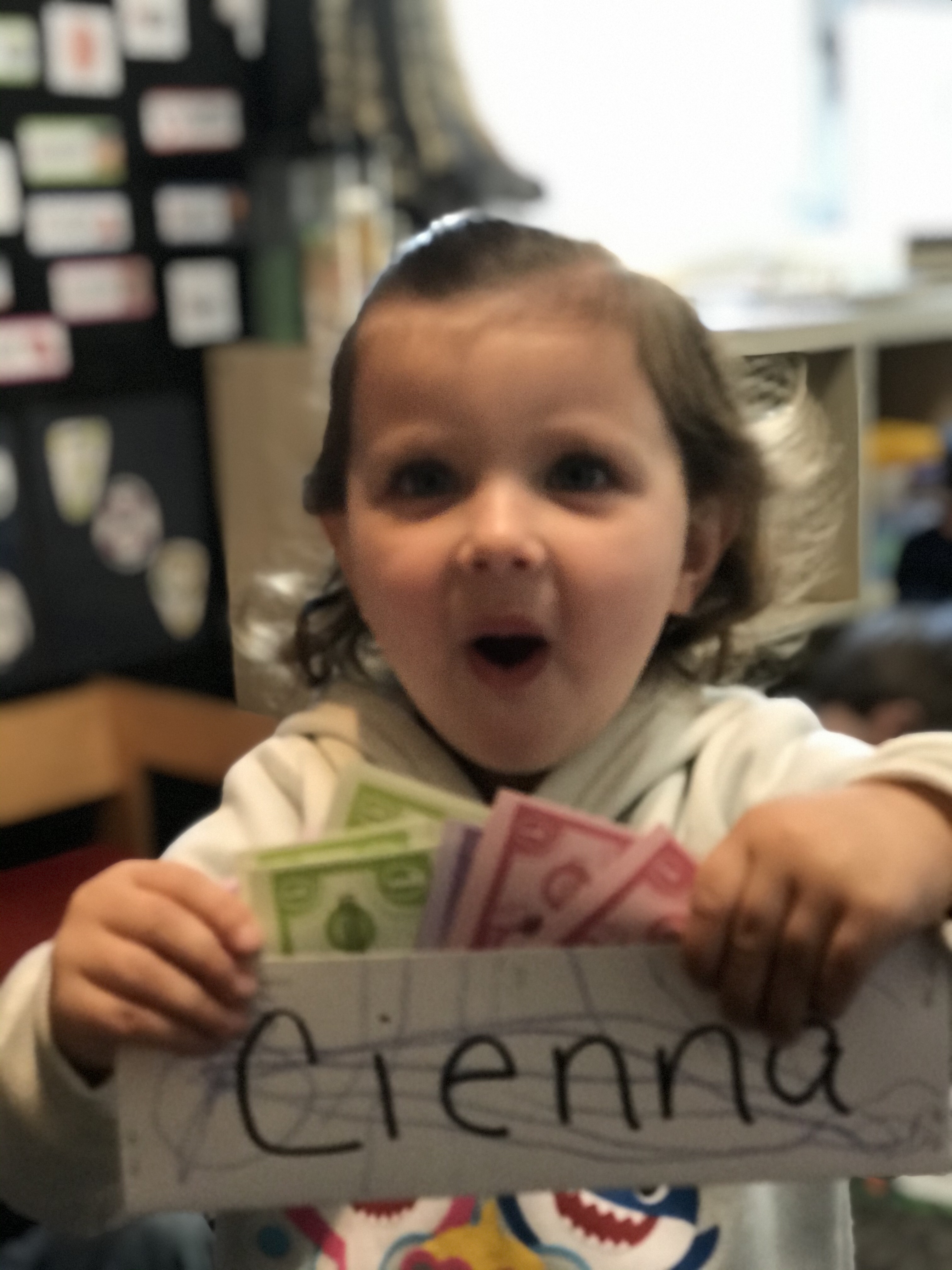 What would we put in our wallet. Some say toys others say money. We enjoyed making our wallets and pretending how we would spend the money inside. This activity was one of their favorites. Not one forgot to take their wallet home!