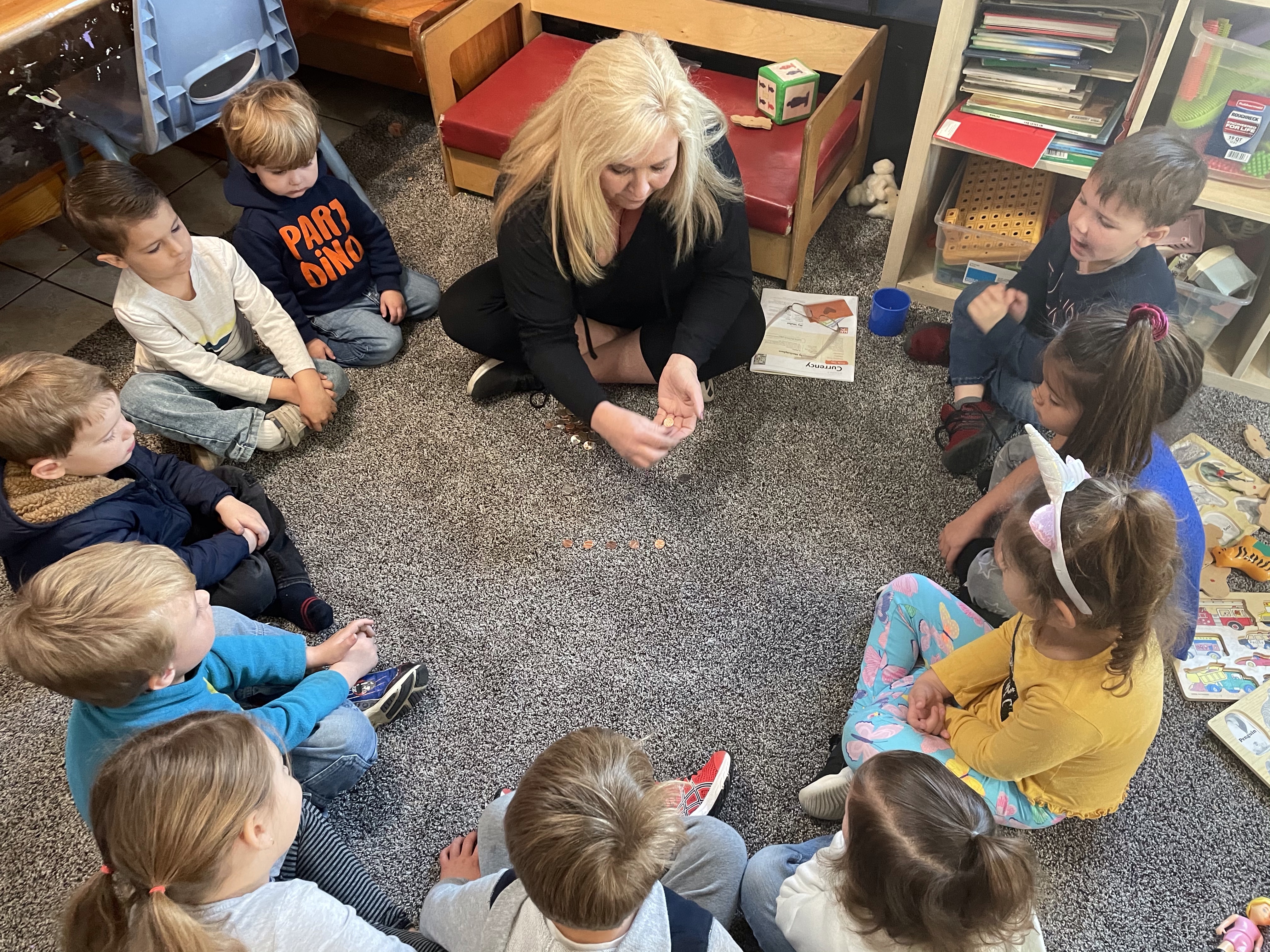 We set out coins and talked about their value. We chose not to use the pictures we separated the coins then place them in the correct line. Experience Early Learning Curriculum provides us with daily discover bags. Many games, projects and art supplies are included.