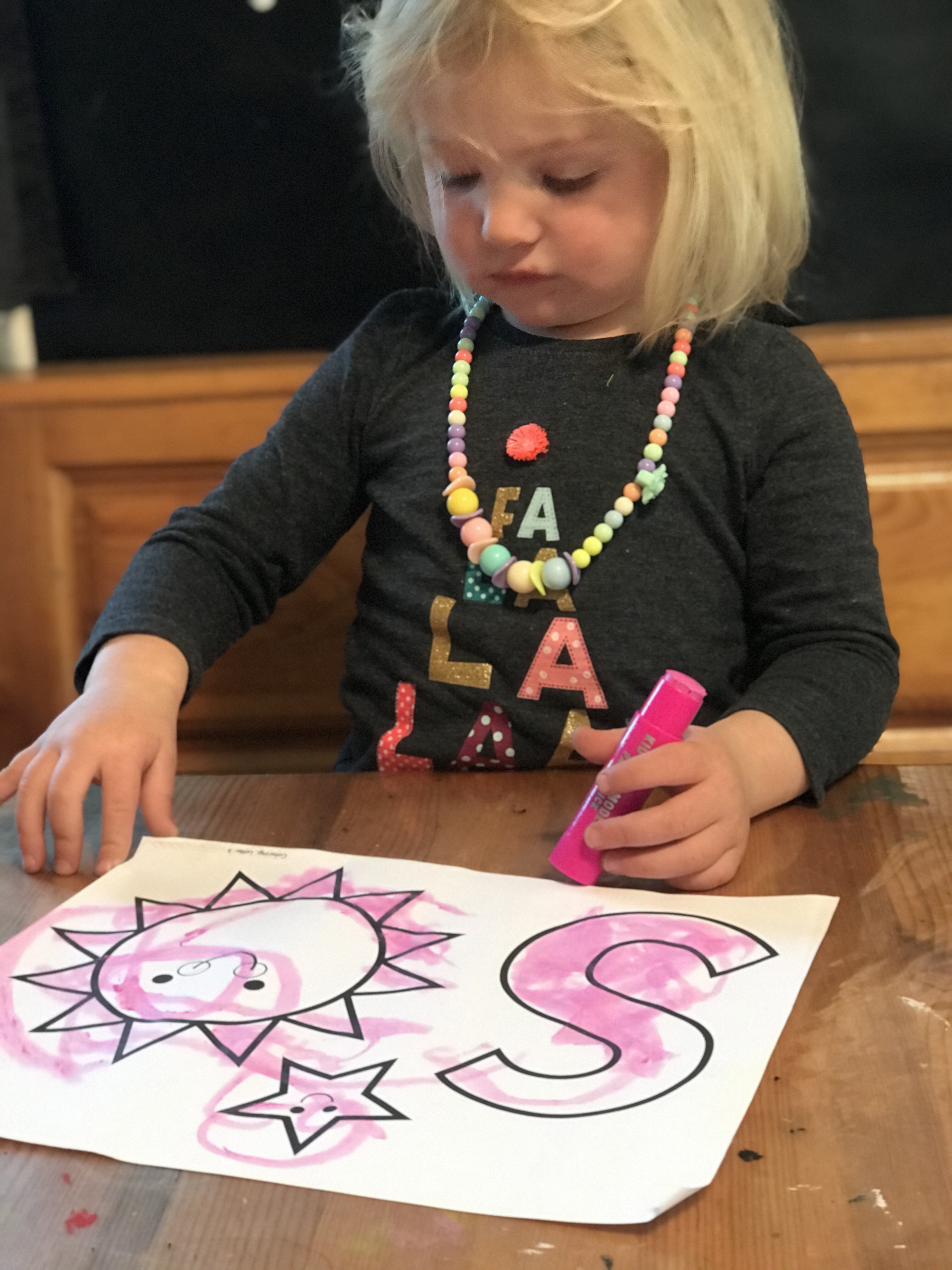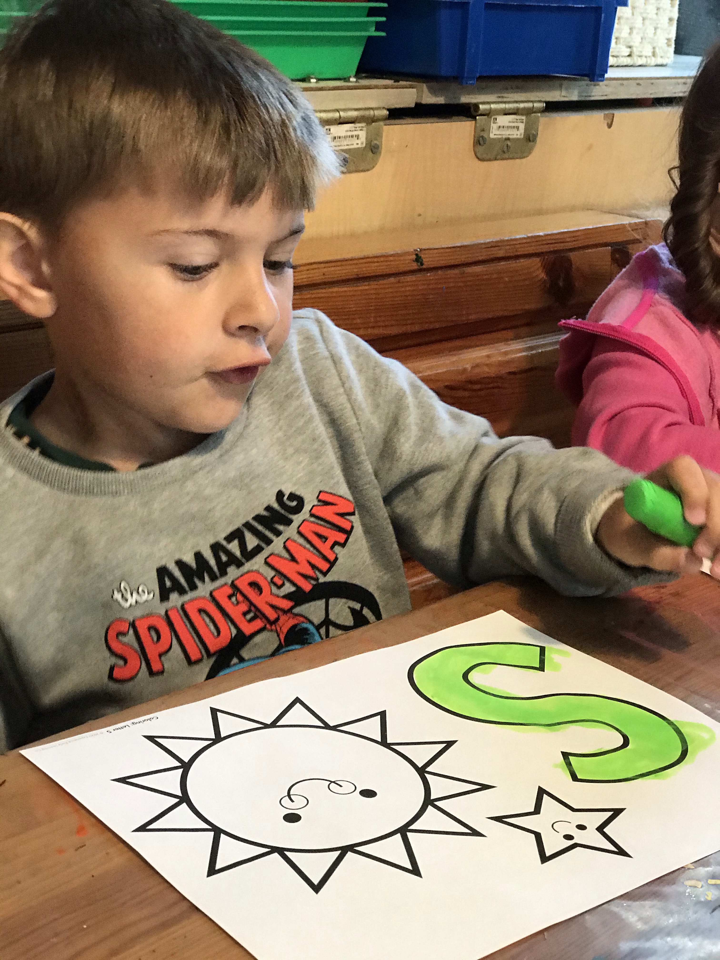 We worked on letter Ss and painting our star and sun. We then took yellow and orange paint mixing it together to create a paper plate sun. After it dried we made designs on it and applied glitter. We loved to see how they would sparkle in the sun and imagined that the sun is full of glitter.