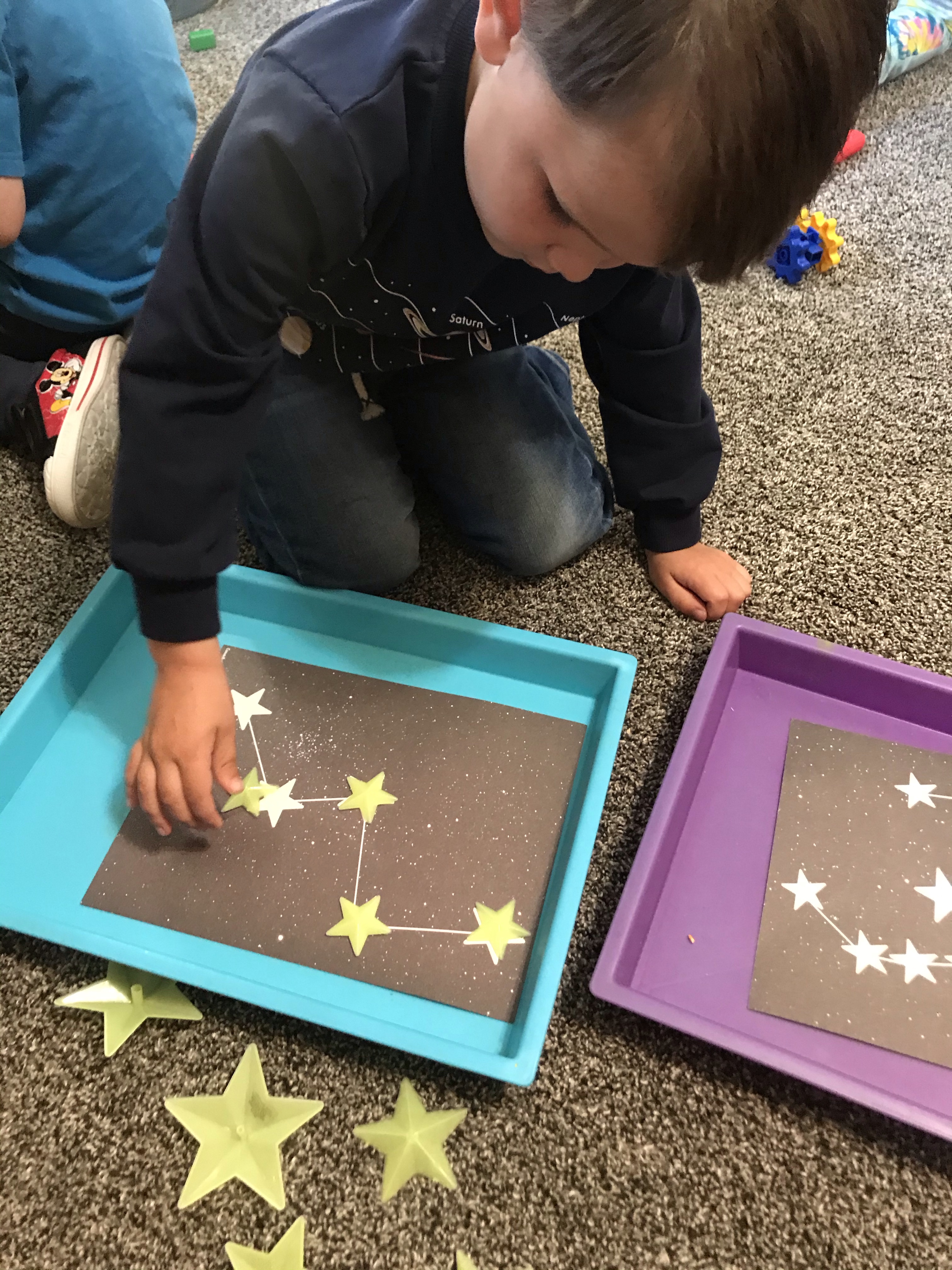 We made our very own star headband then pretended we were in the sky! We glued the stars onto the blue headband and enforced with a staple. This activity was great for all my kids, I have several kids in each age category and all ages were successful with this project and engaged. I love the wonder that you can see in the kids eyes when we complete an activity from Experience Early Learning Curriculum. I observe how intentional they are when completing their projects.