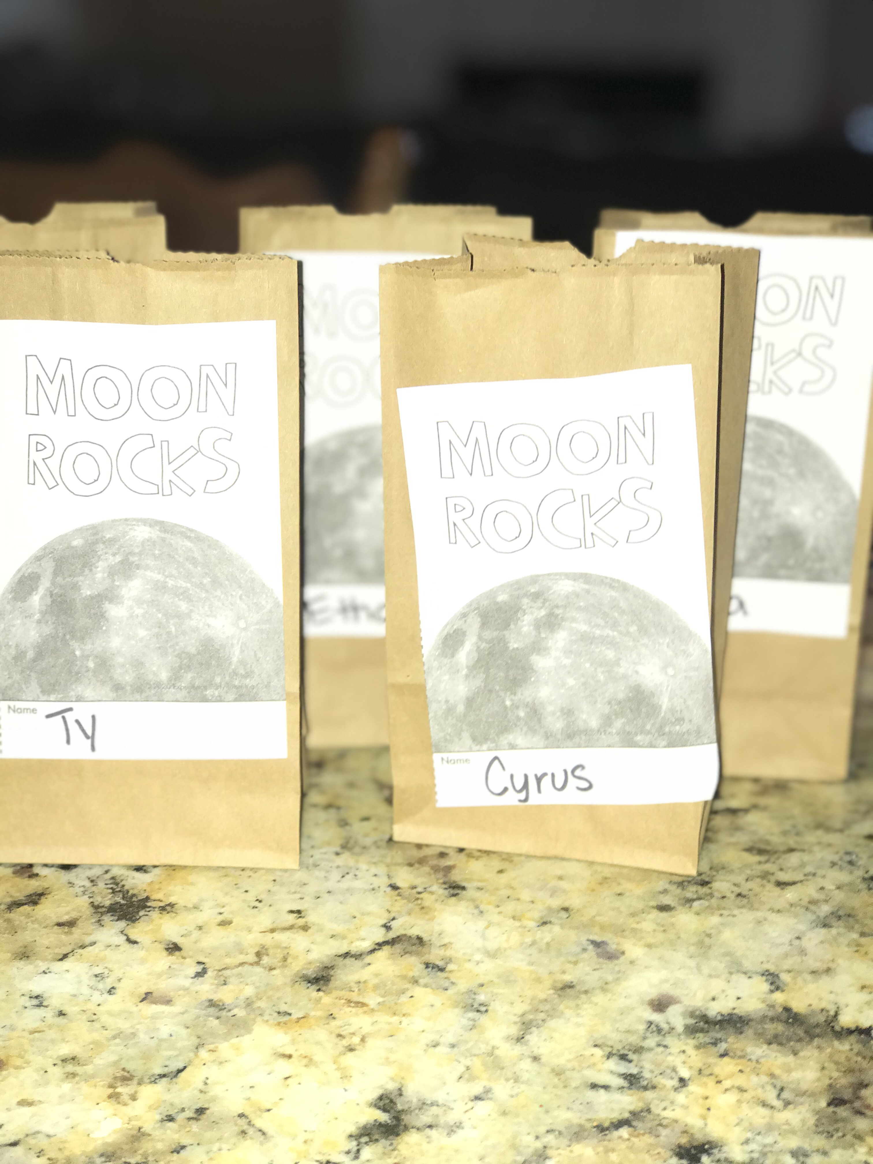 This activity was our favorite this week. Our kids took the foil provided and crumbled it up. They then glued their label on their bags and filled with moon rocks. This activity was a great sensory activity.