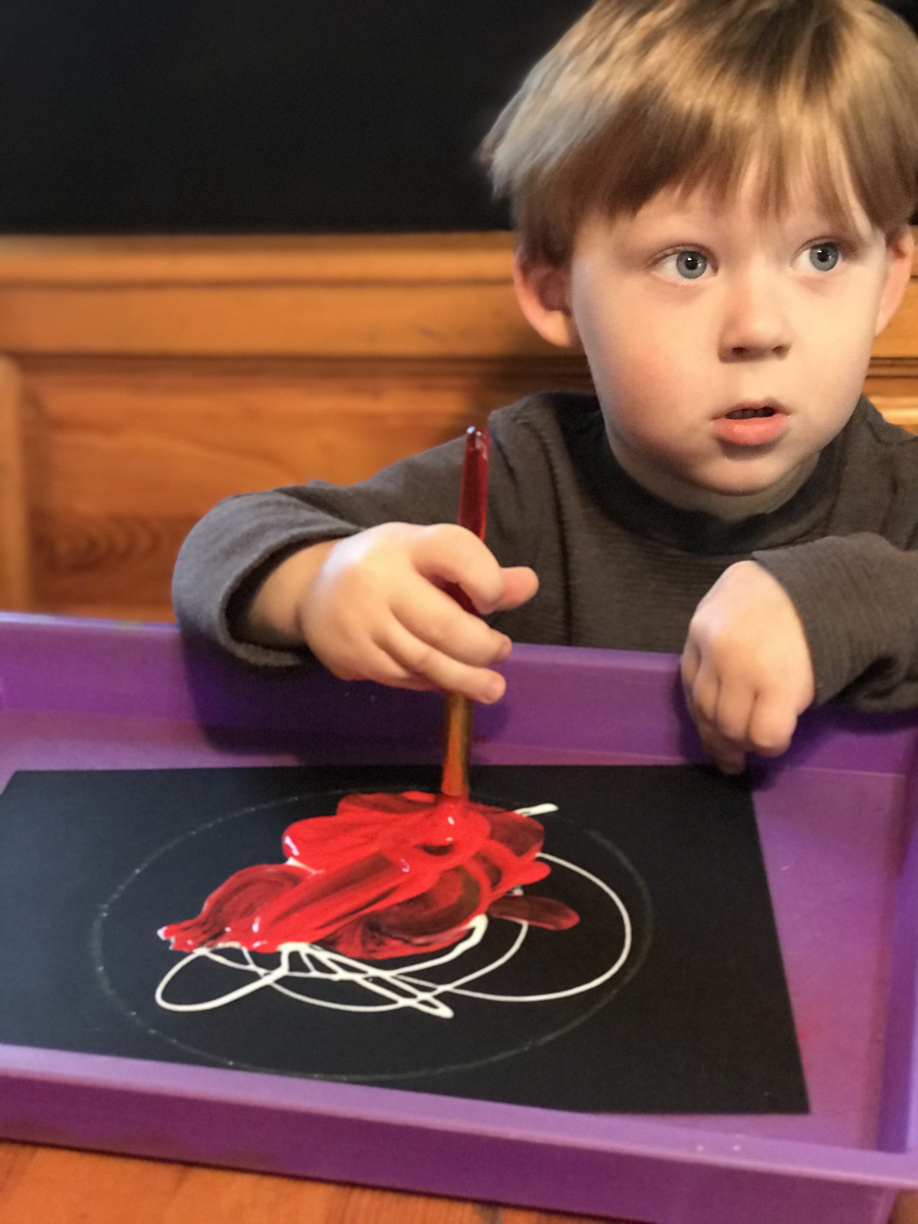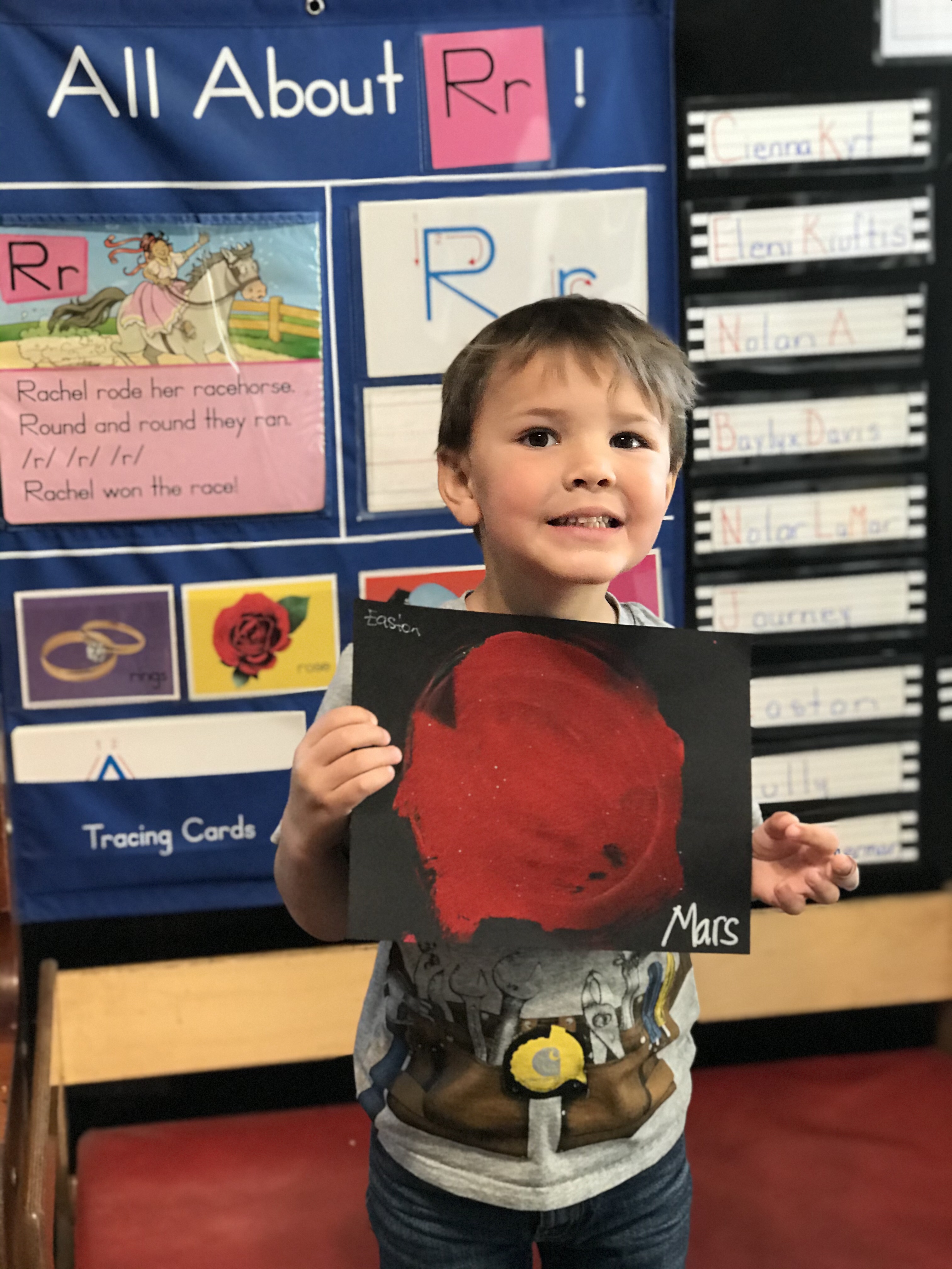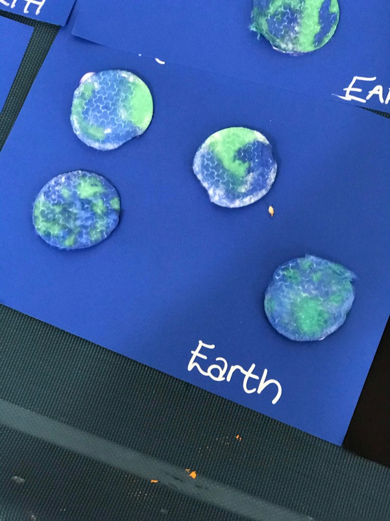 We set out supplies and our inspirational photo and let the kids decide how they wanted their Earth to look like. We learned that the Earth is the only planet that has trees. And that we live on the Earth. Our kids made intentional designs and I am so proud of how their projects came out.