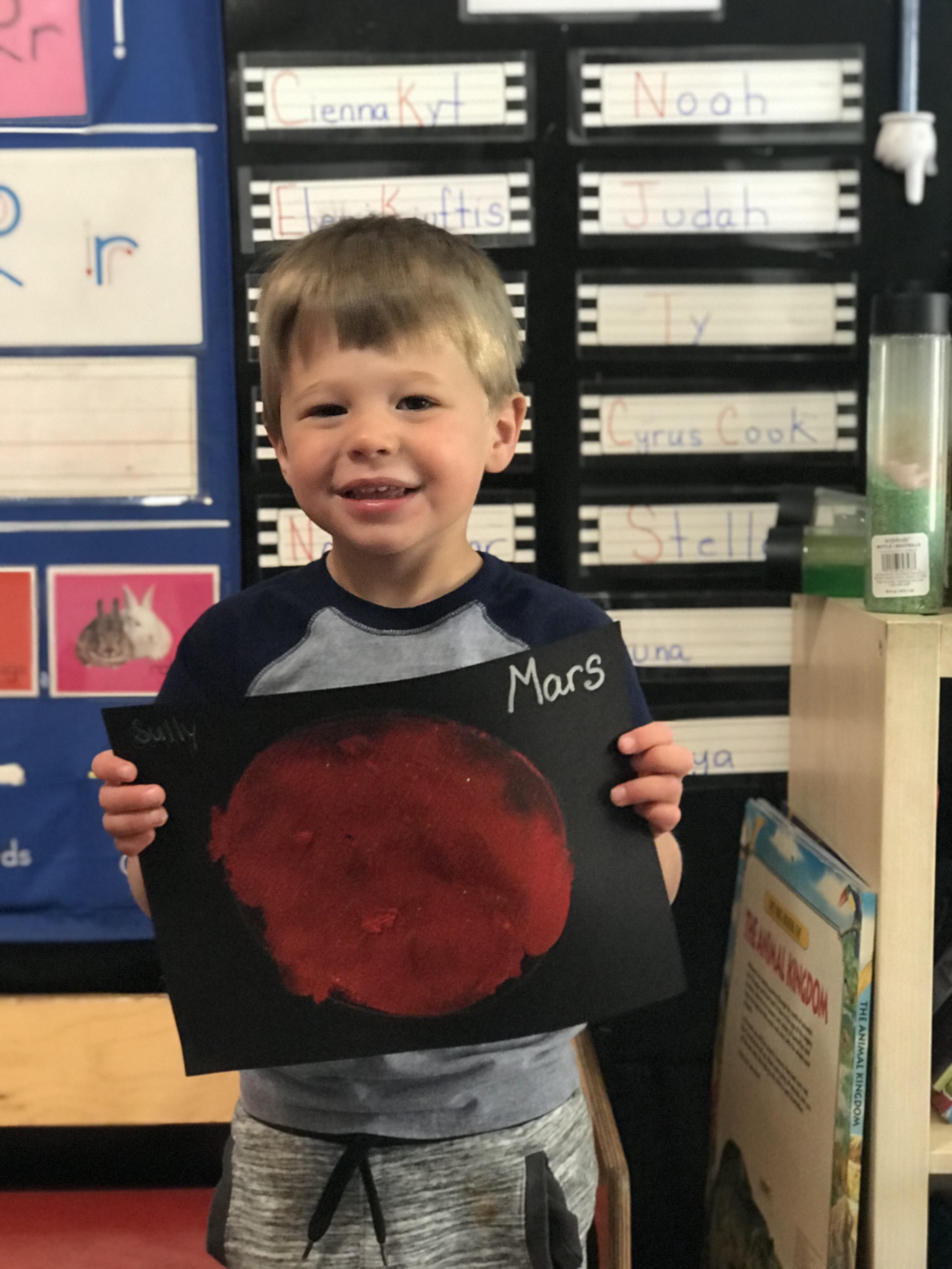 We mixed paint and glitter for our invitation to create. We made a circle then painted it red and after adding glitter poured the red sand provided onto the paper This project turned out amazing. We learned Mars does not have any ring or any moons.