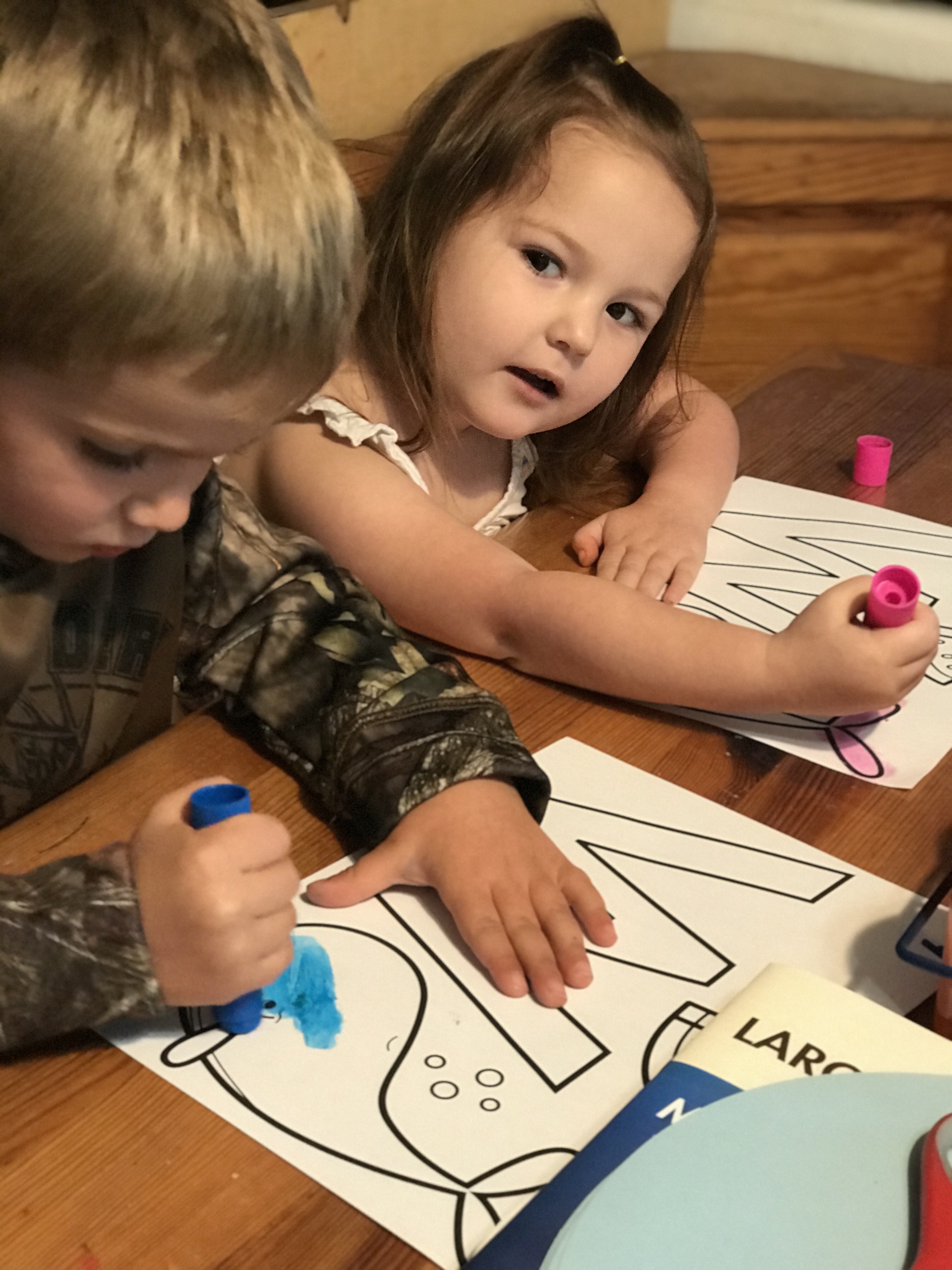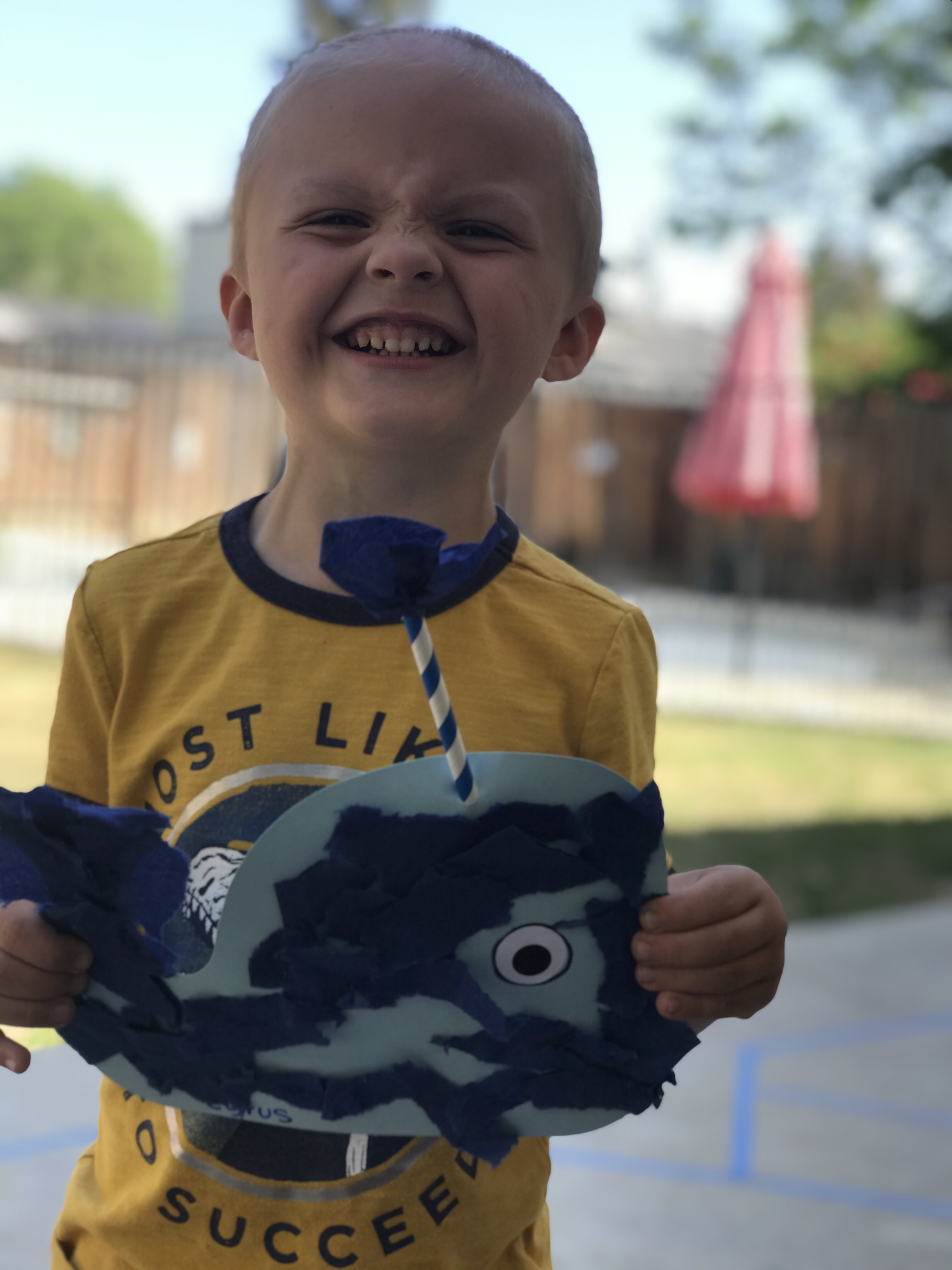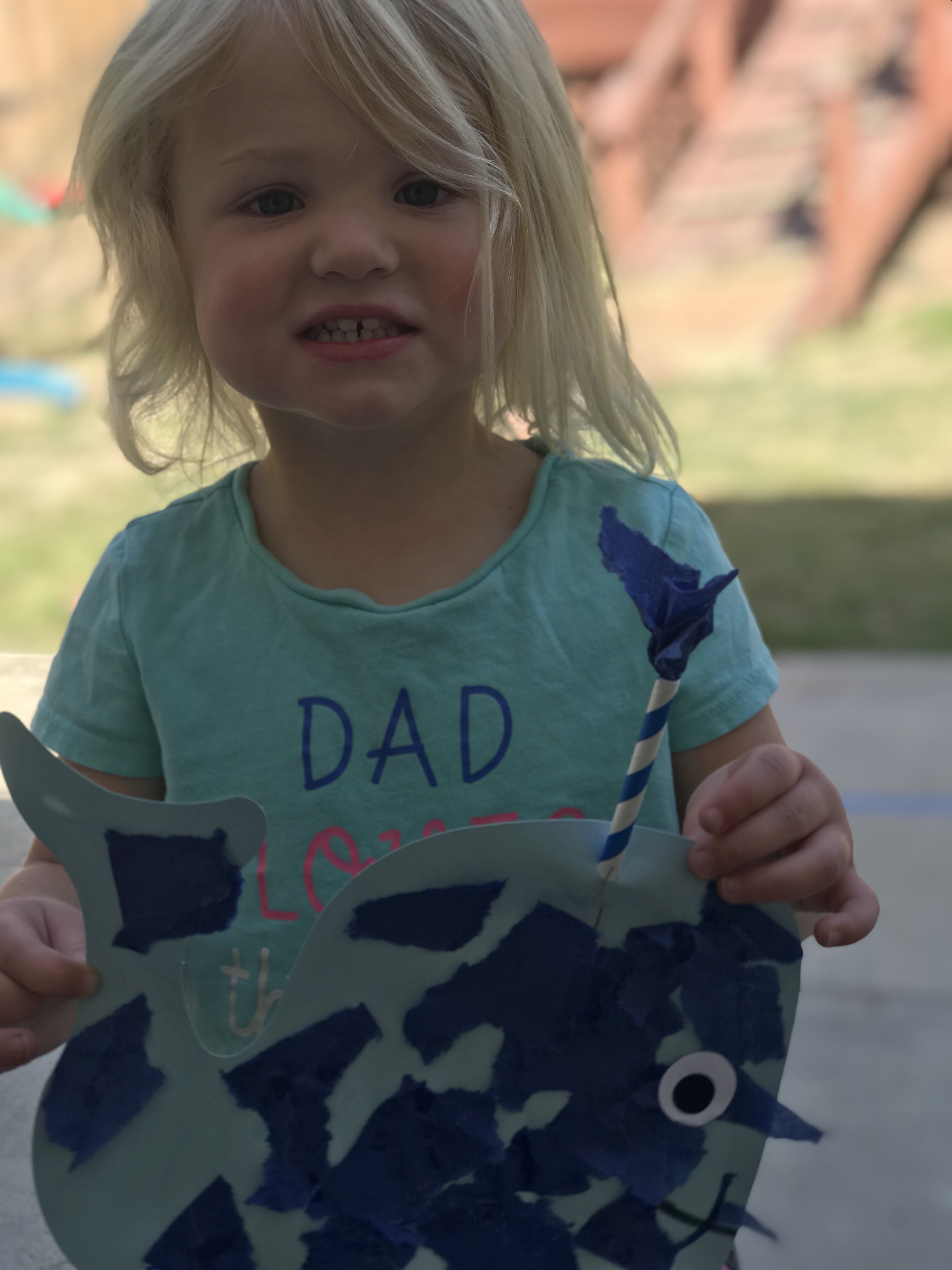 Whales breathe air as we do, therefore, they need to reach the surface of the ocean to breathe because they cannot breathe underwater. To breathe, whales have a blowhole in the top of their heads. We pretended we were whales using a straw to blow air out of. We talked about how long we could hold our breath and if whales hold their breath. We tore paper napkins and glued then onto the whale. We loved how they turned out!