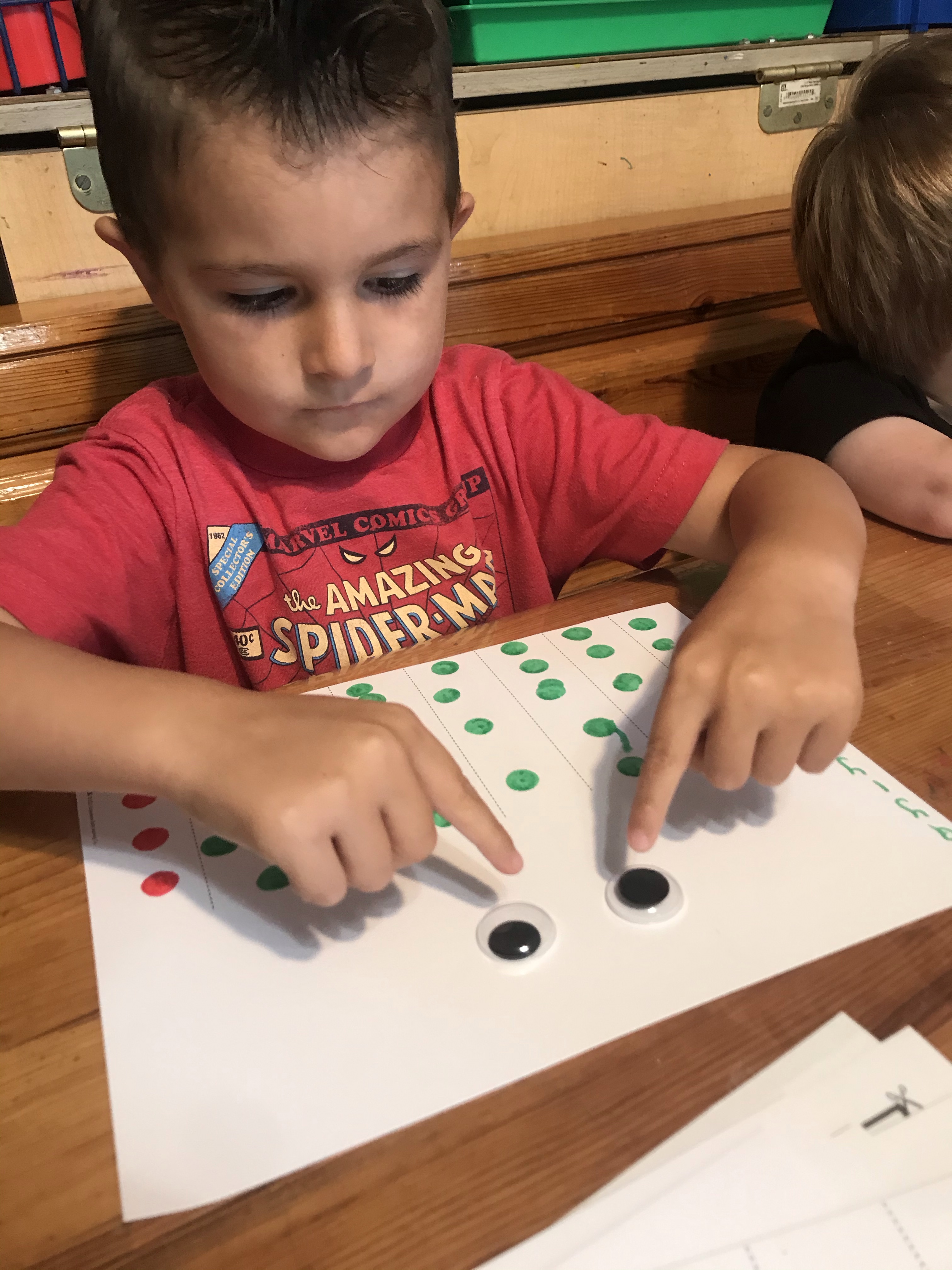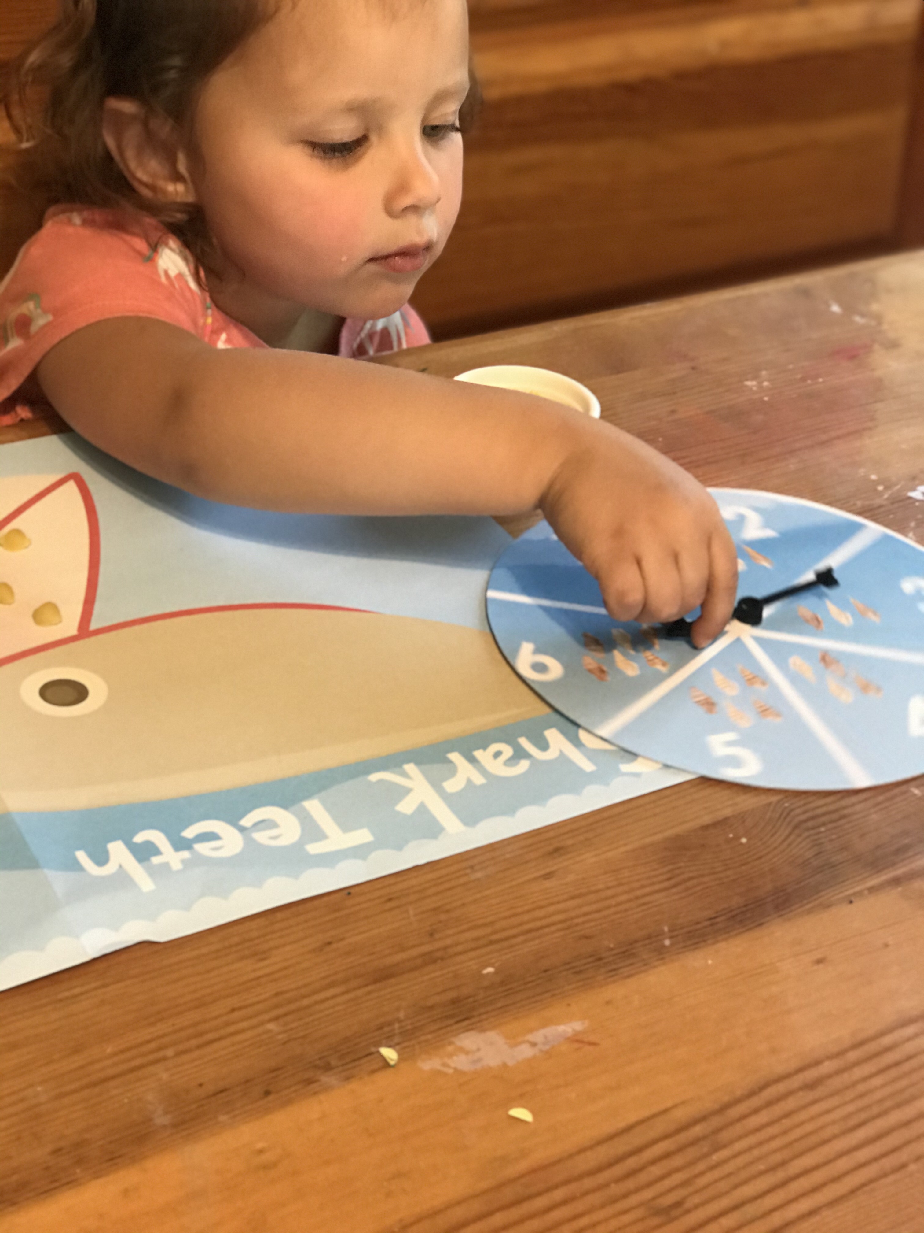 Our preschoolers took turns with out table top math activity by flicking the spinner and identifying the number they then counted out the shell “teeth” and put them in the sharks mouth. Experience Early Learning provides all of our small group math and table top math ideas. They are always tied into our lessons. These games are so engaging!