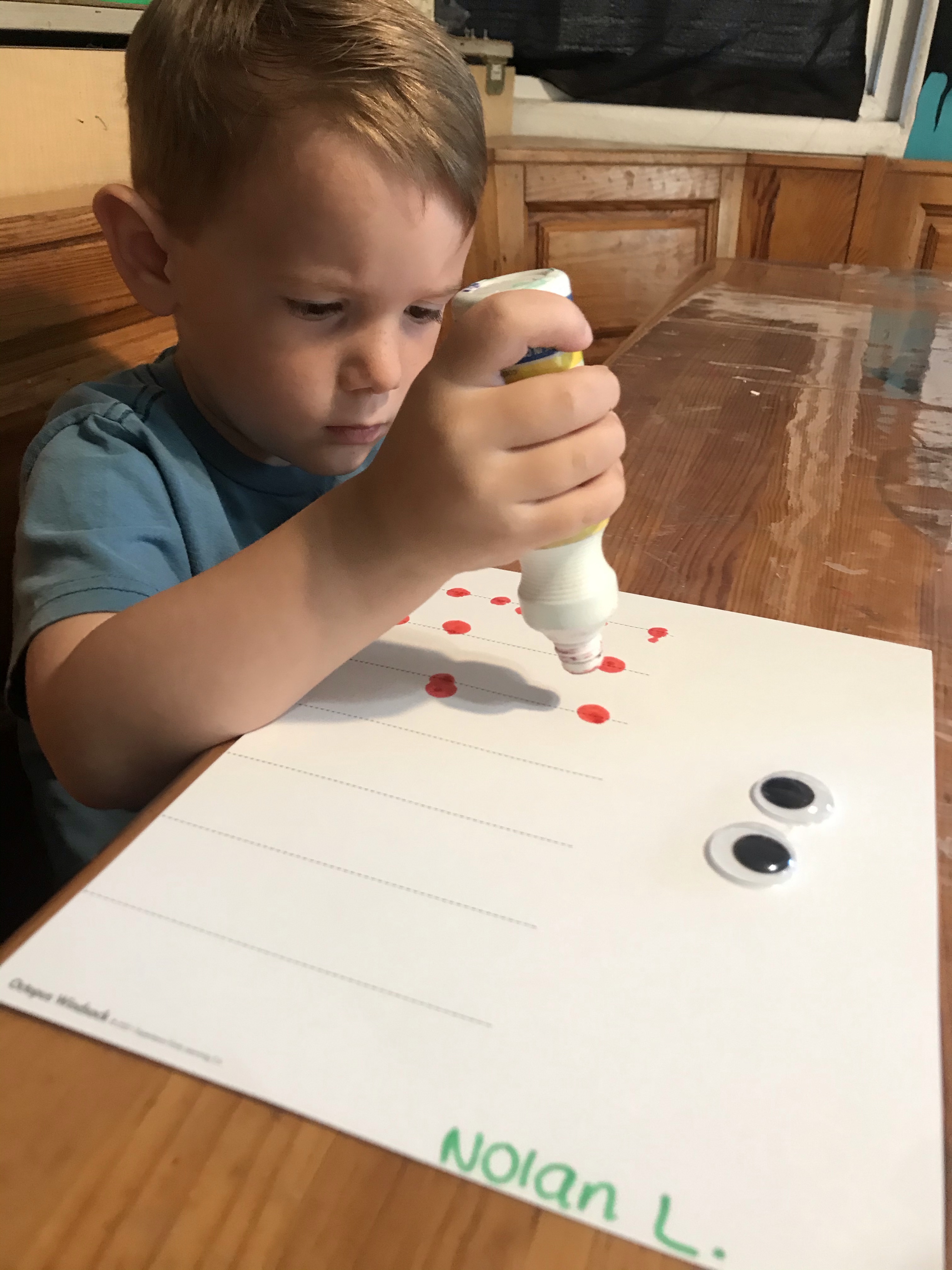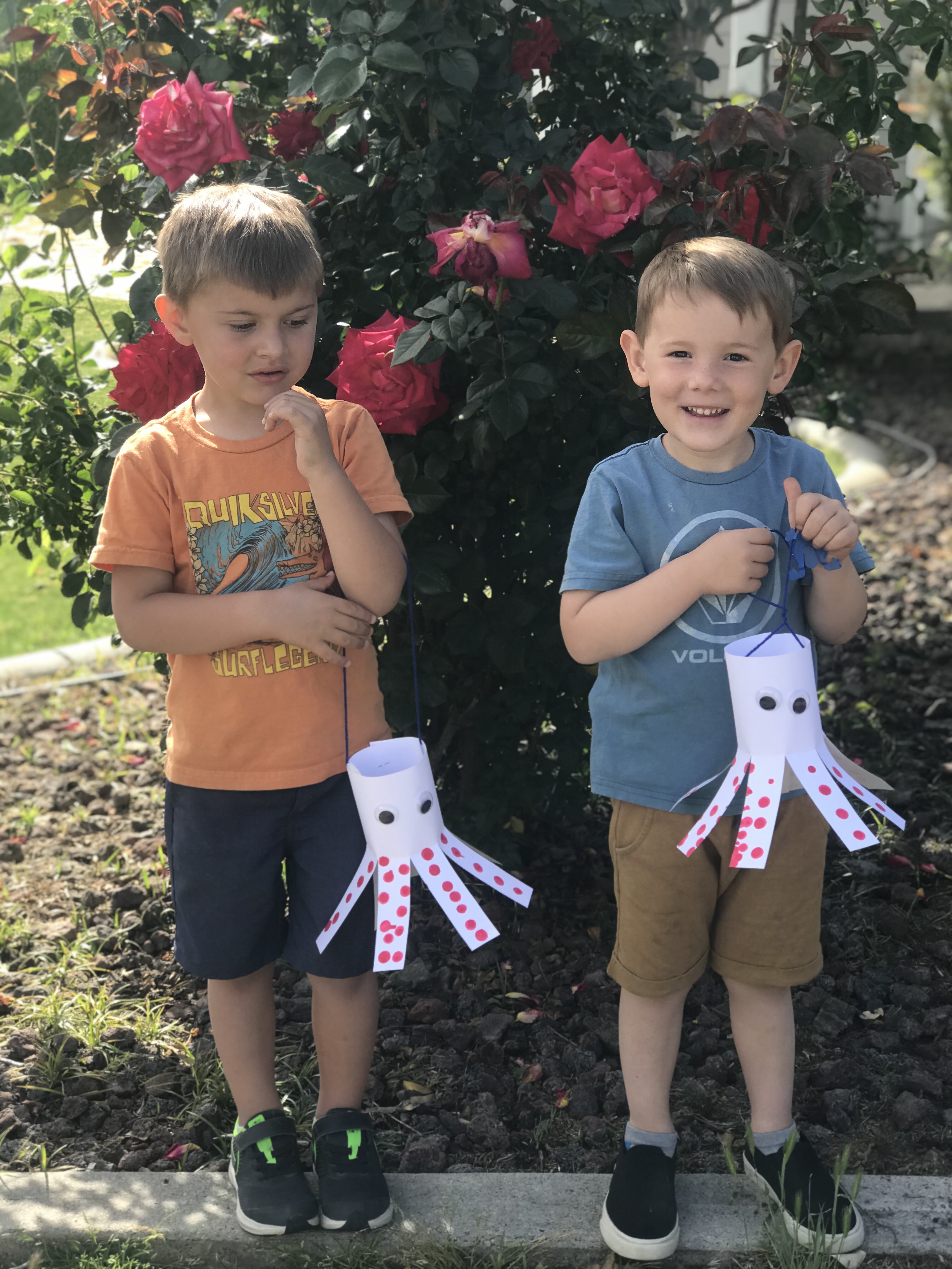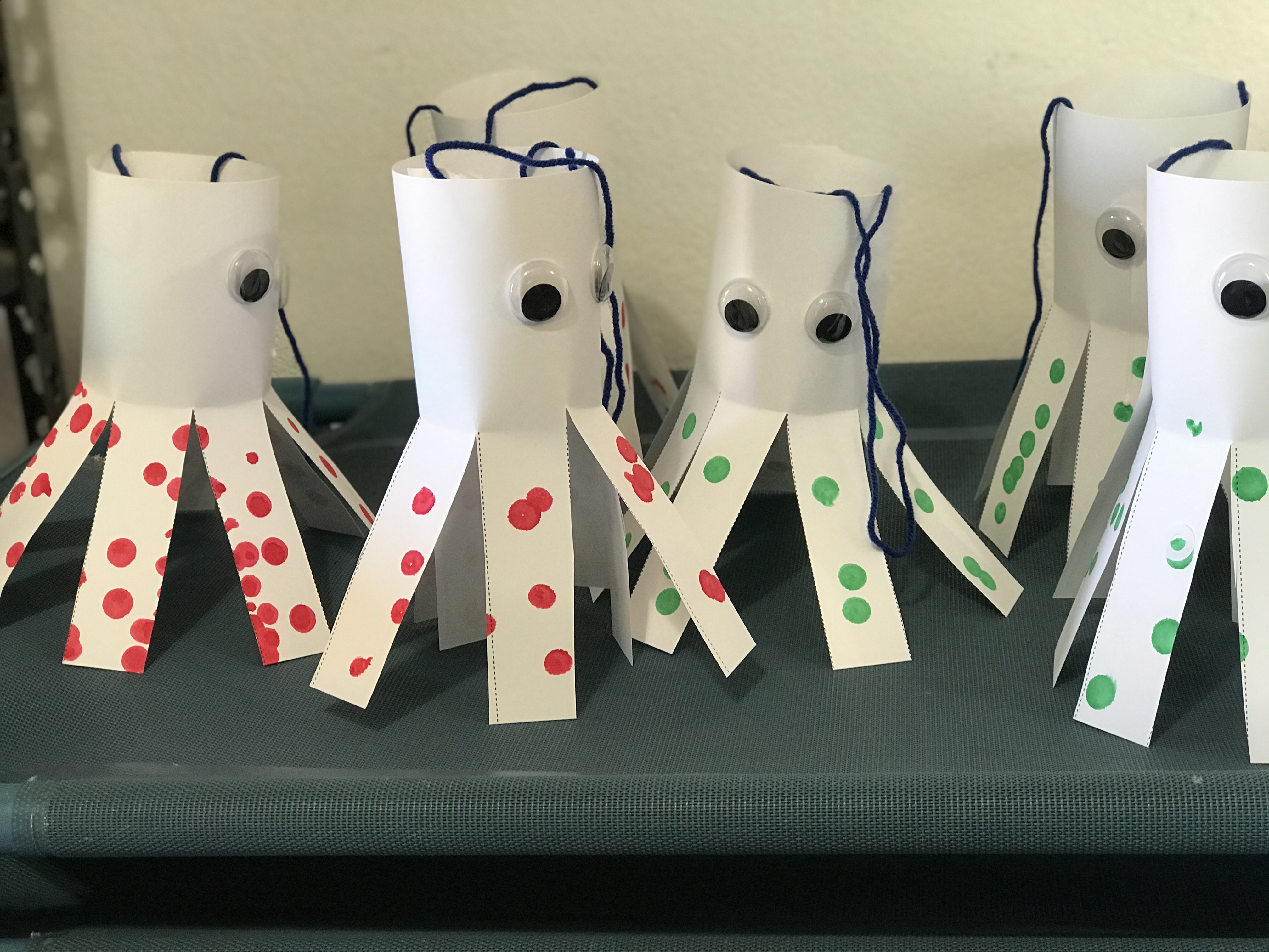 Octopuses’ body is without skeletons means they don’t have bones in their arms or body. Our preschoolers were fascinated by the octopus and how they don’t have bones in their body. We imagined not having any bones and that made them giggle thinking we would be all wobbly. We had fun pretending to swing our octopuses around like they were swimming in the ocean.