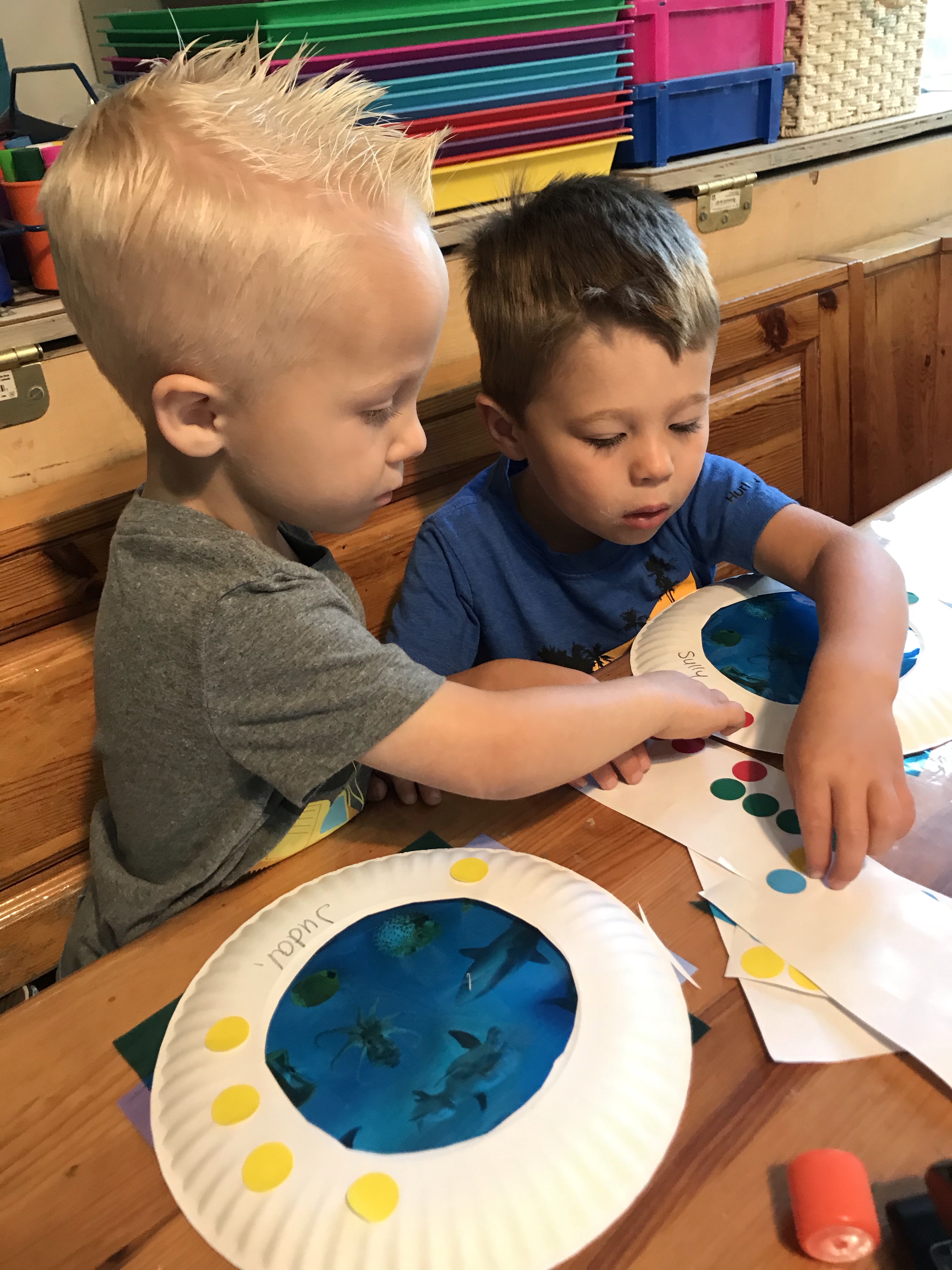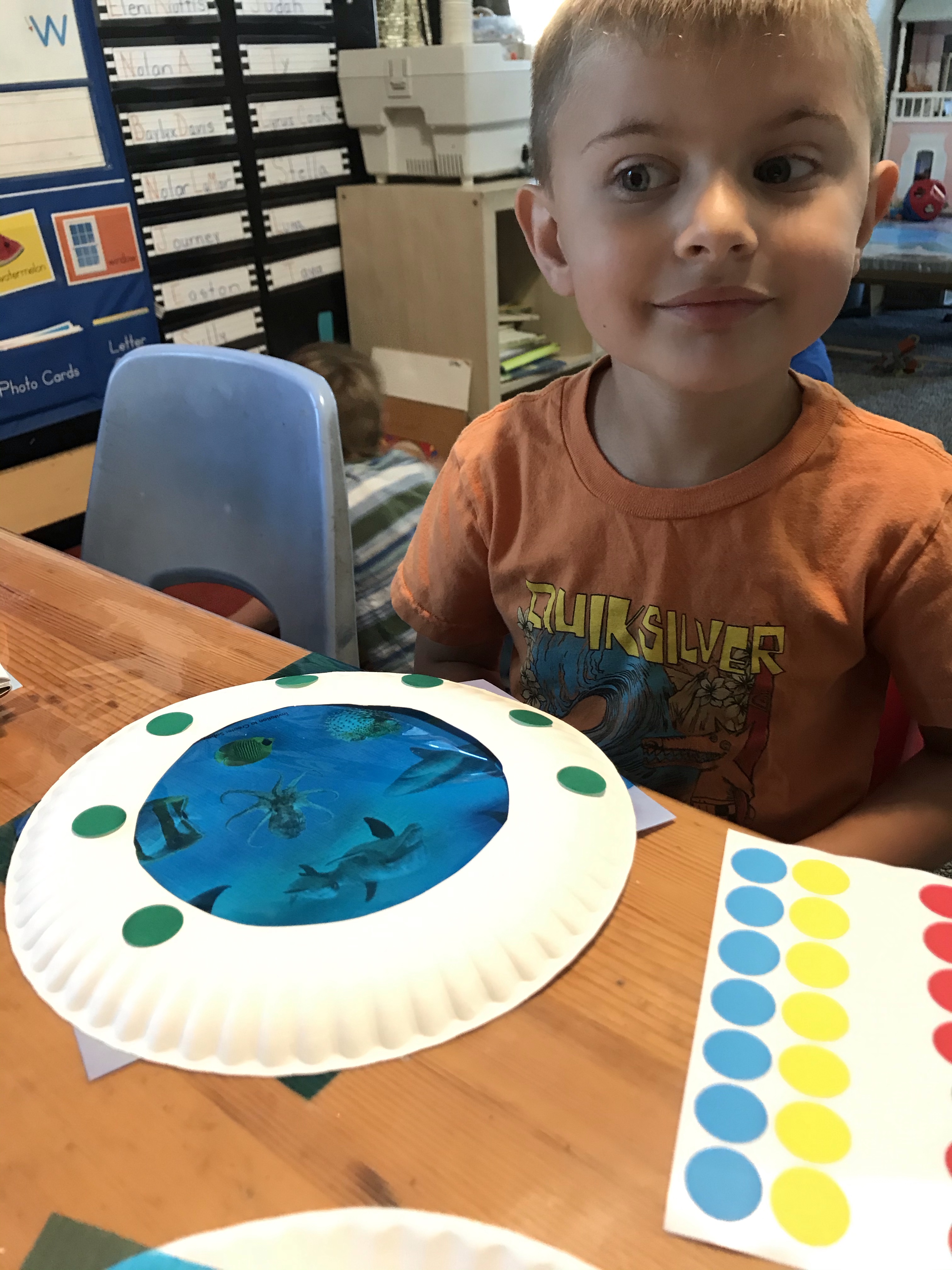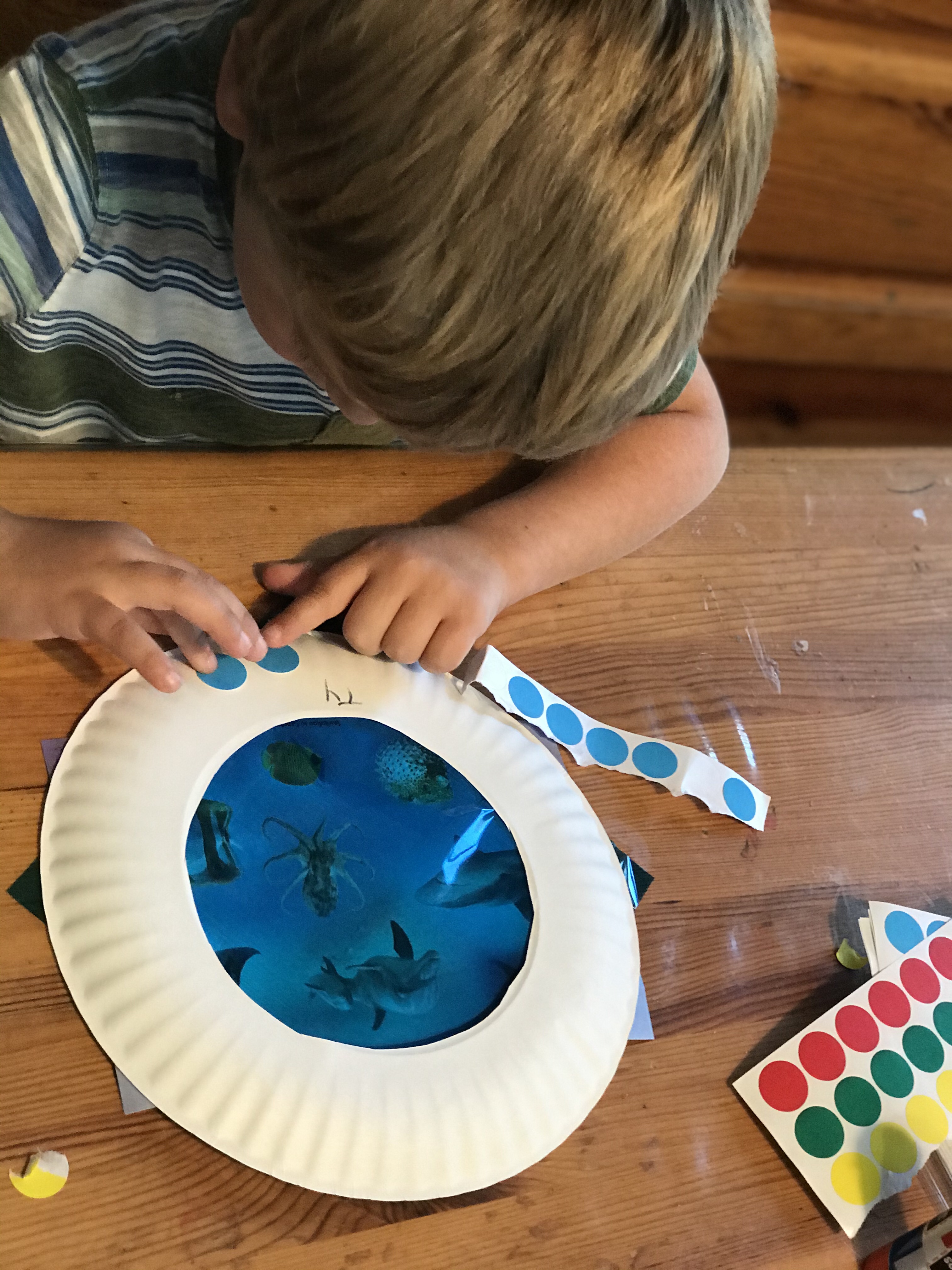 As we set sail to explore the ocean we pretended to be on a submarine. We made a submarine window pretending to see all the ocean animals big and small. We cut cellophane and glued it onto the plate along with the pictures of animals. We then added stickers around the plate to make it look more like a window.