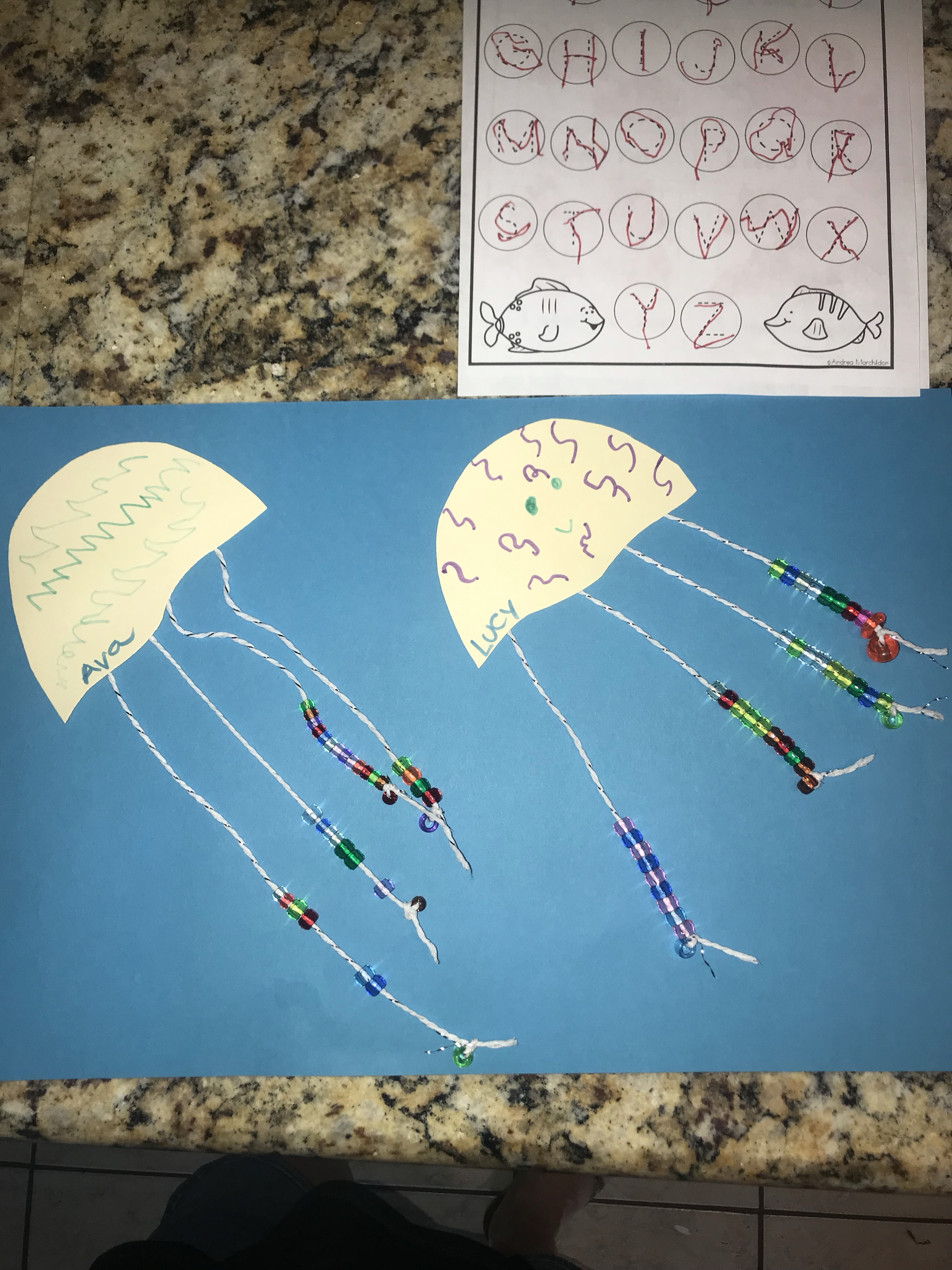 Our first activities this week were making jelly fish and using our fine motor skills to put all types of colorful beads on! We counted to see how many beads we used in all! So we added a math skill as well. We also are learning to write and trace our names. We still are working on the correct way to hold our pen. In this picture Jayden is using a pen we often use small markers as well, that make them hold the pen in the correct way. Writing with these cute name badges from Experience Early Learning Curriculum makes it so much more fun.