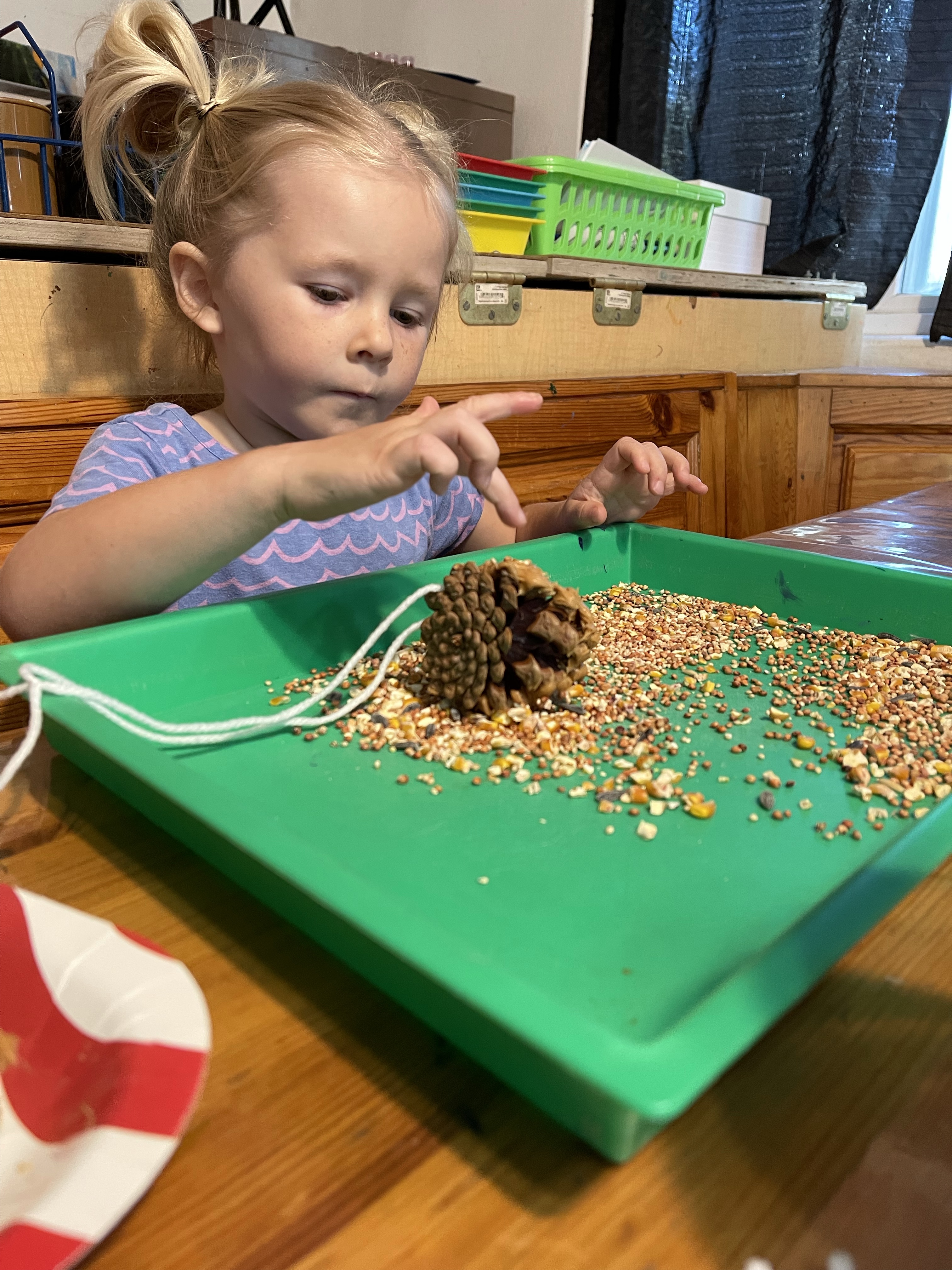 This week we have been learning about tree’s. Today we learned about building with tree’s. We used pinecones, peanut butter, and birdseed to make our bird feeder. This project allows us to learn about physical science.