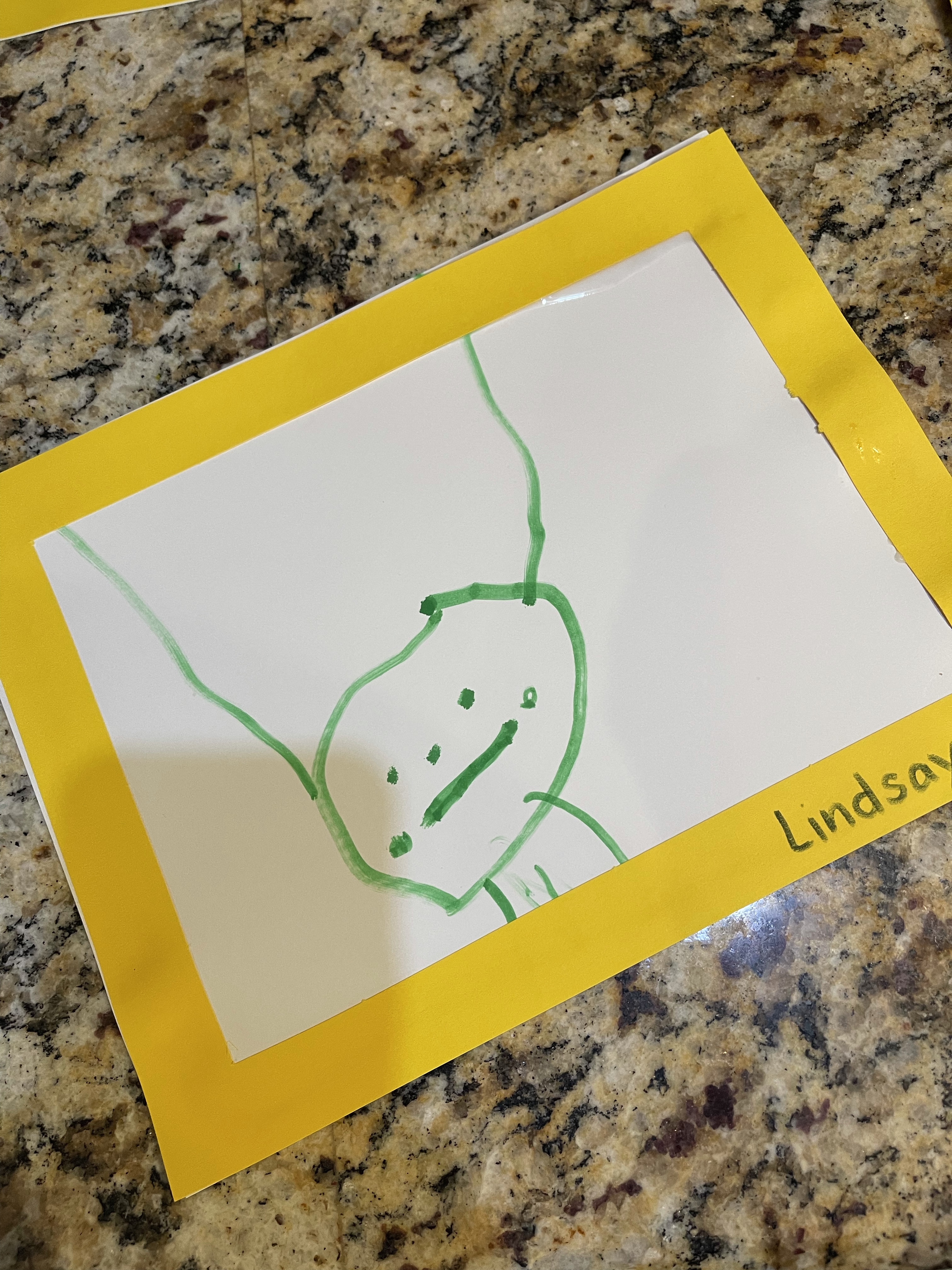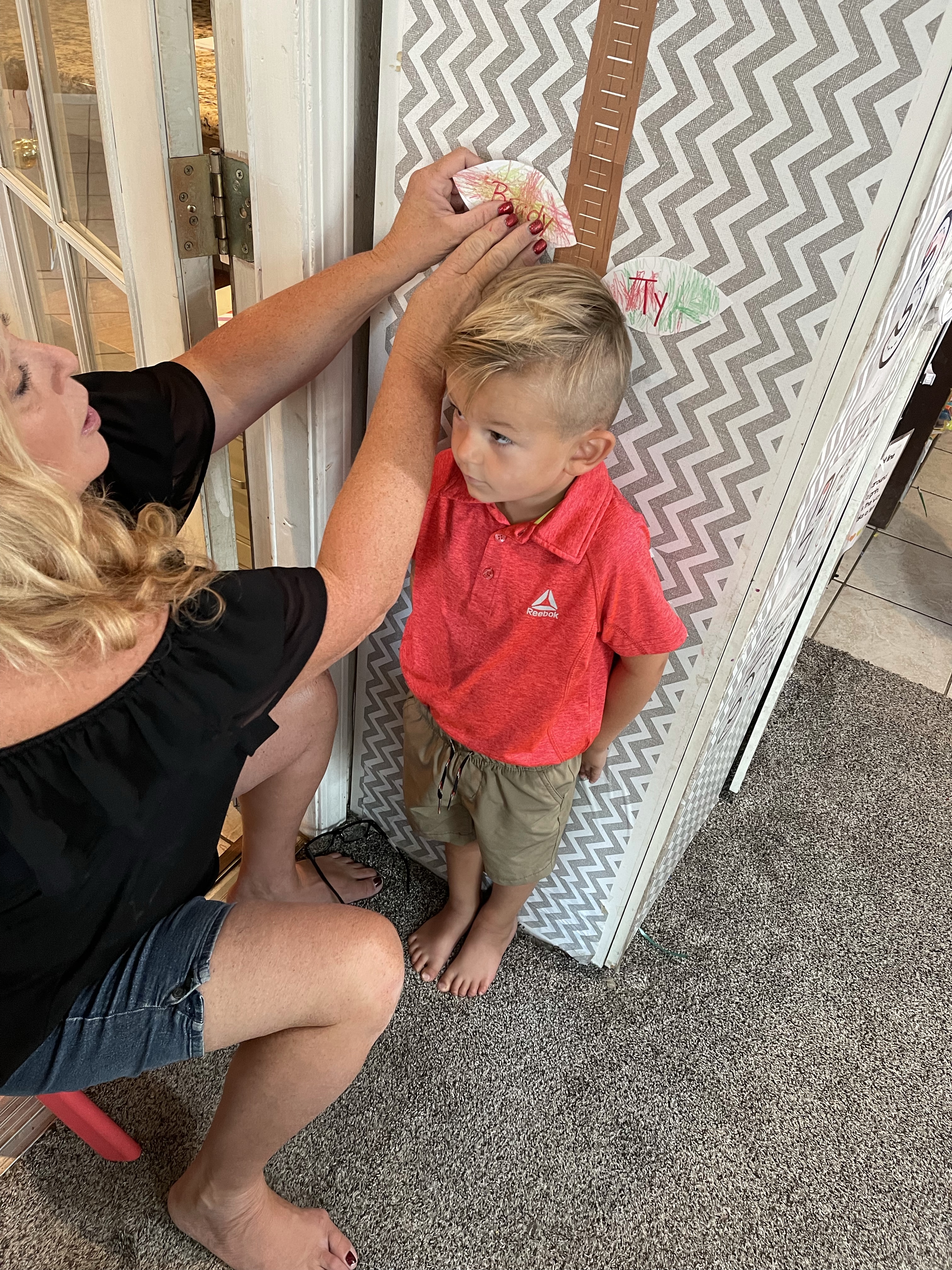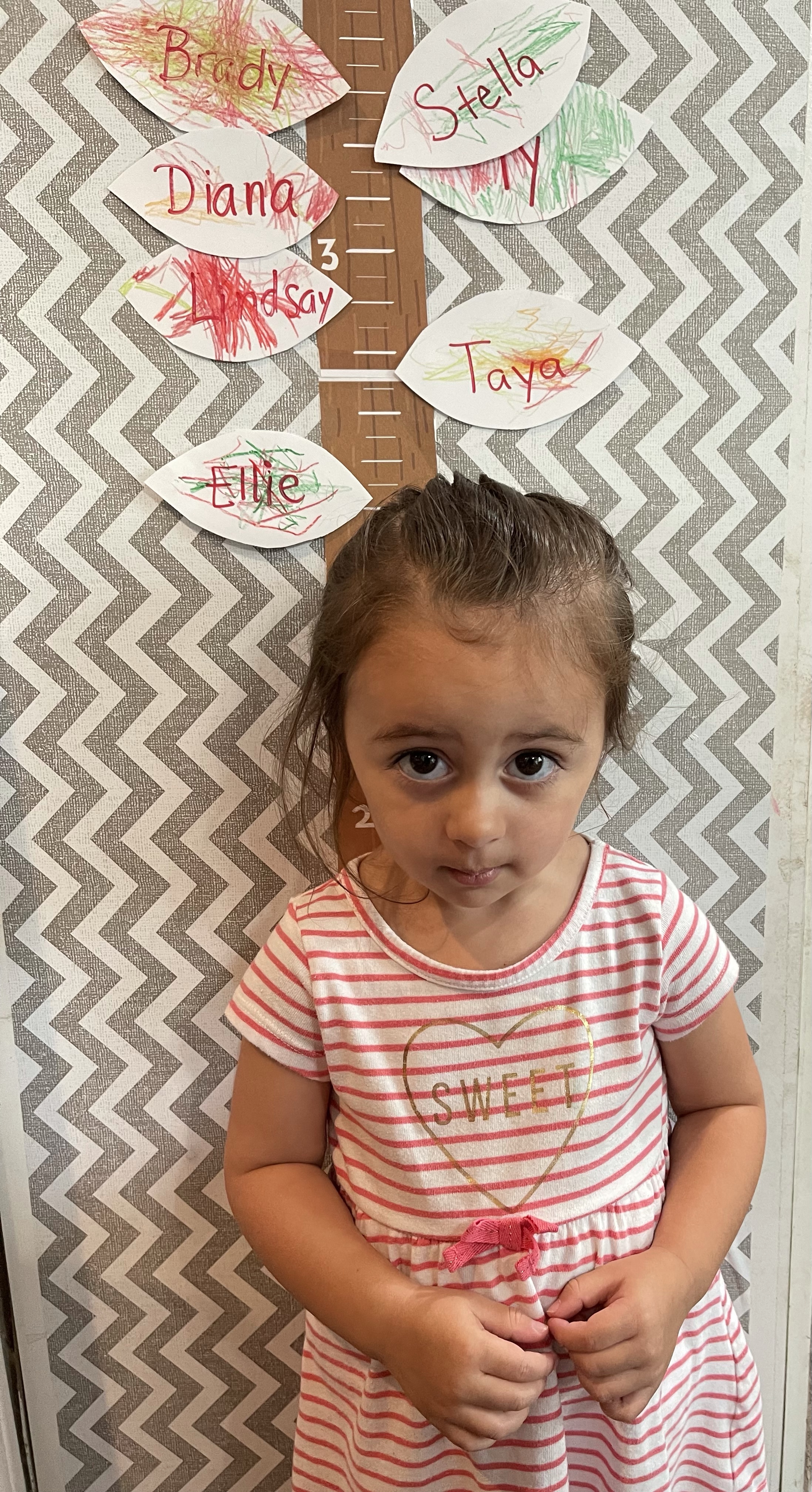 We displayed our growth chart and invited the children to color and cut out their leaves. We then helped the kids measure their height and marked it with a leaf.