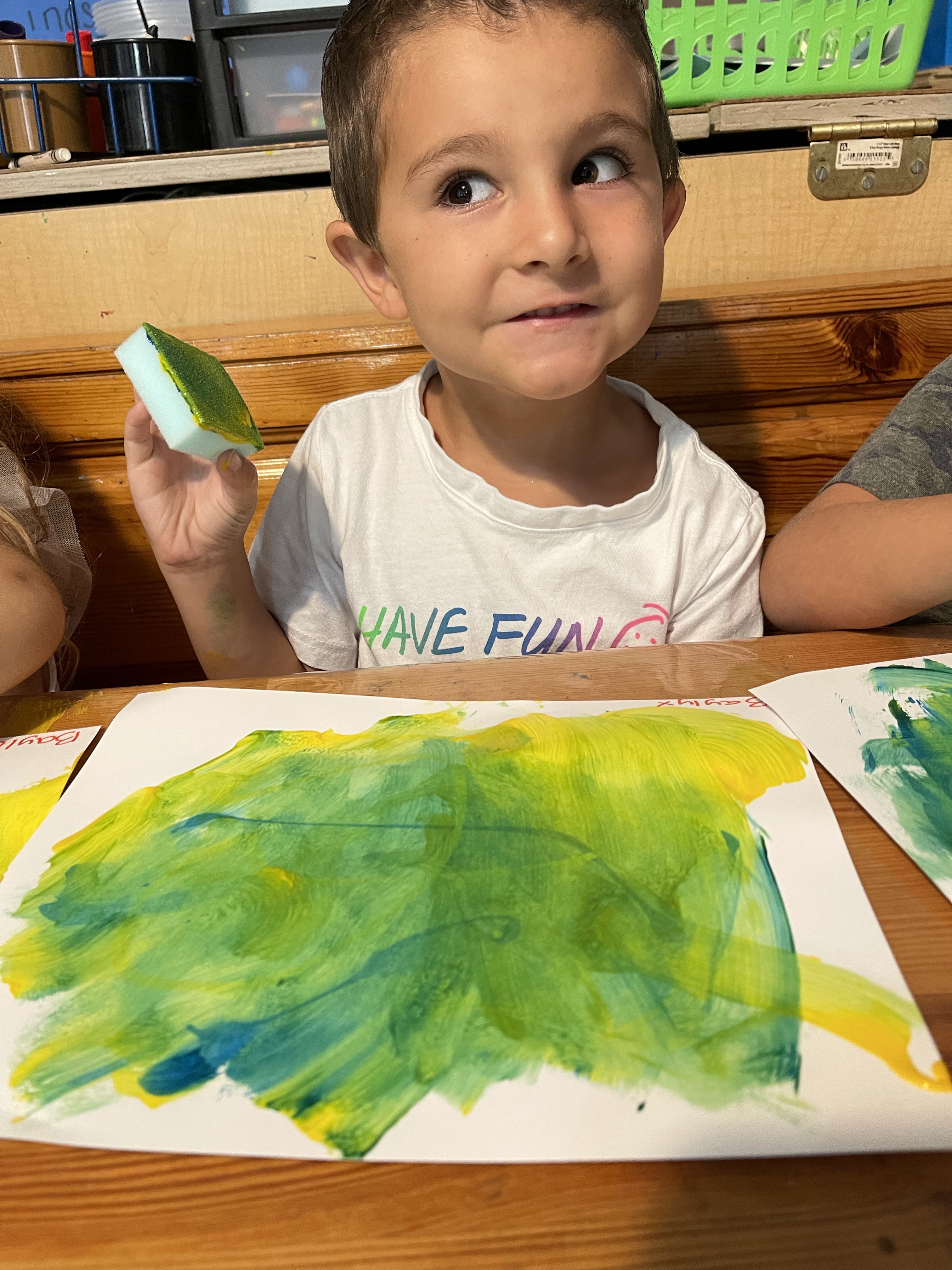 Experience Early Learning Curriculum provides an Invitation to Create daily. These activities vary with the skills that they learn. This activity helped with physical science, fine motor, and visual arts. We observed the kids decide if they were going to mix the yellow and blue paint together and had them describe if there was a change that occured on their paper.