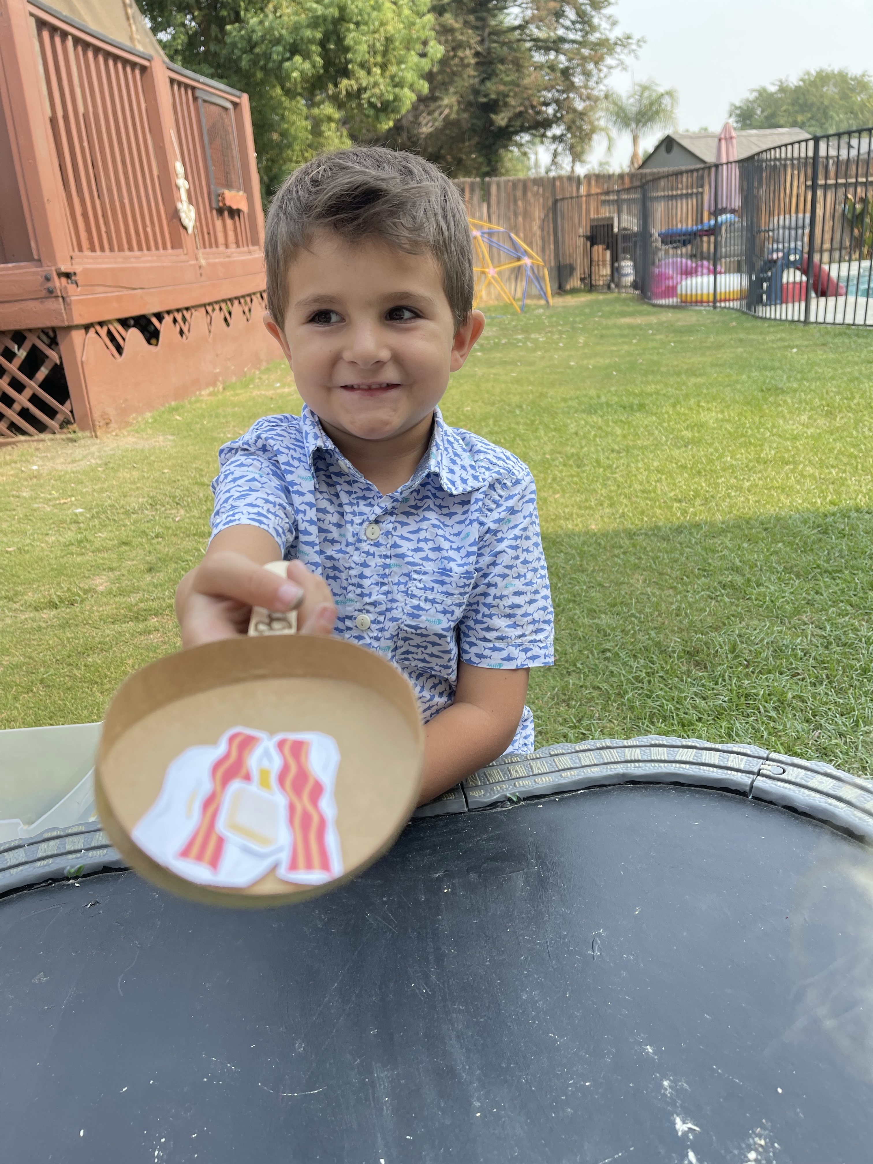Our kids absolutely loved this activity. We attached the pan to the stick and they pretended to cook their eggs and bacon. We told the story of Paul and how big his food, table and plate were. They were amazed to think how that would even be possible.