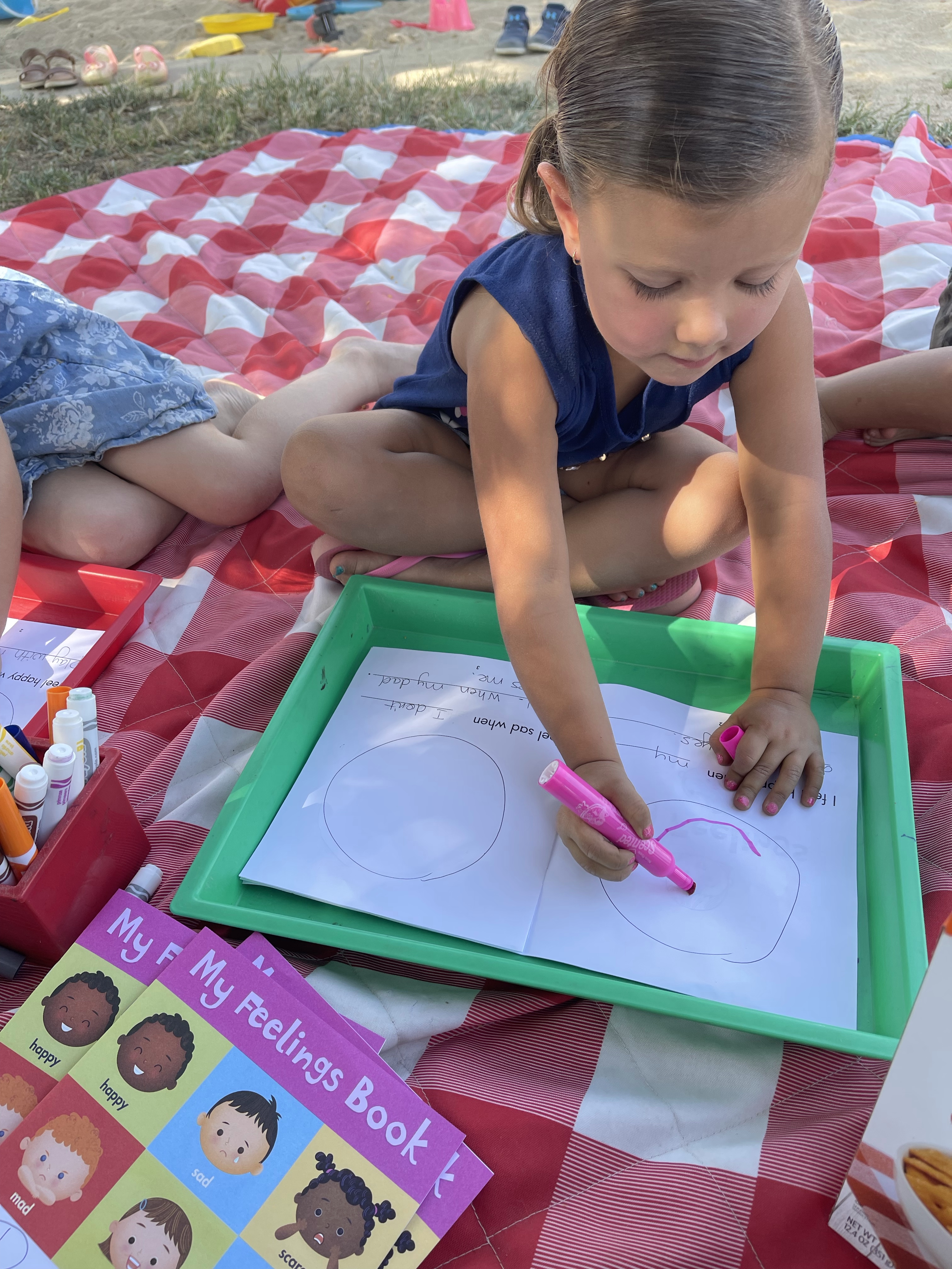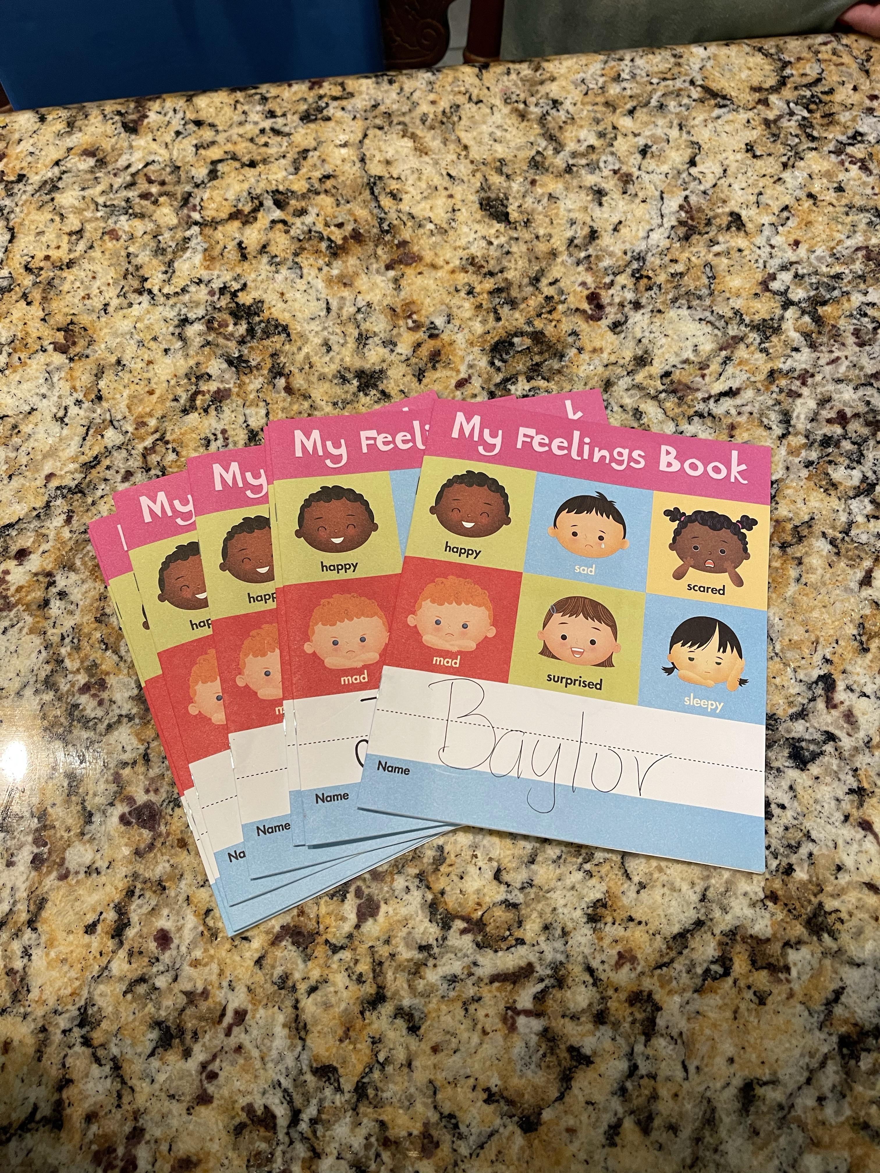 What is our your favorite feeling. Almost all sad Happy. We talked about what makes us happy and what we can do if we feel sad, mad, confused or tired. We have kids of all ages but found that when we made the circle for them on each page they were able to make the face they felt.