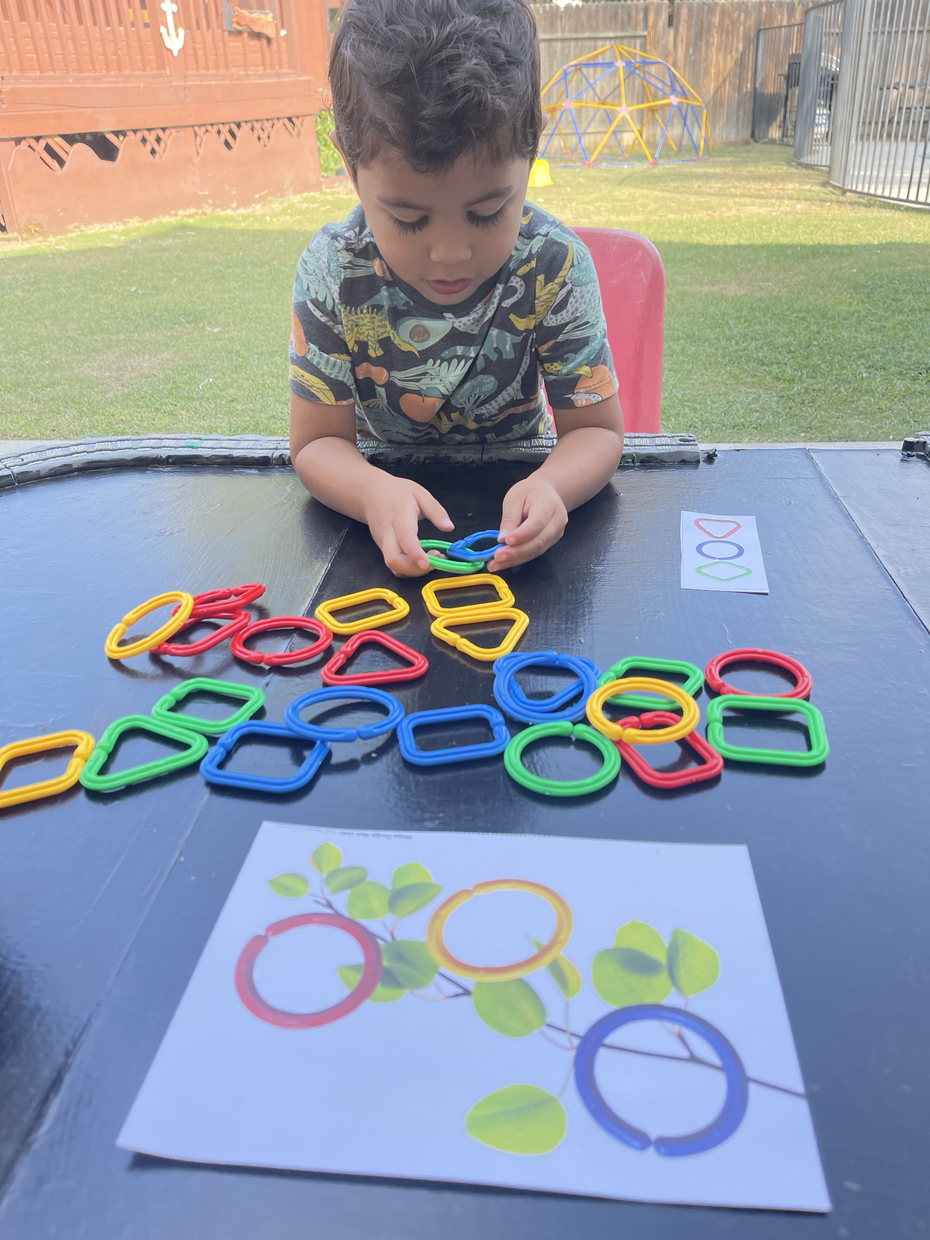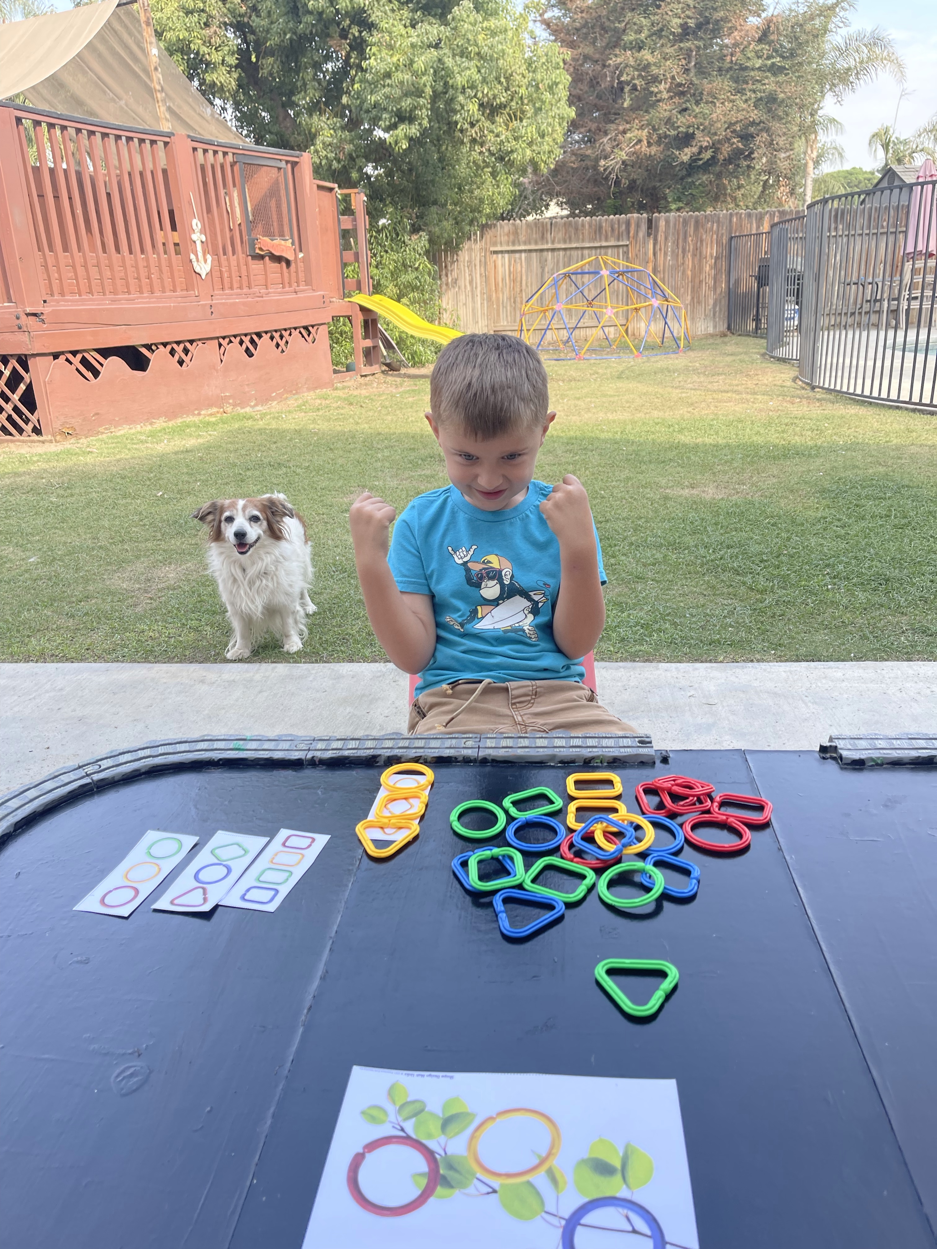 We set out our shapes and let the kids decide what they were going to do. Some kids separated by color and some separated by shape. Eddie separated by color first then created his own patterns.