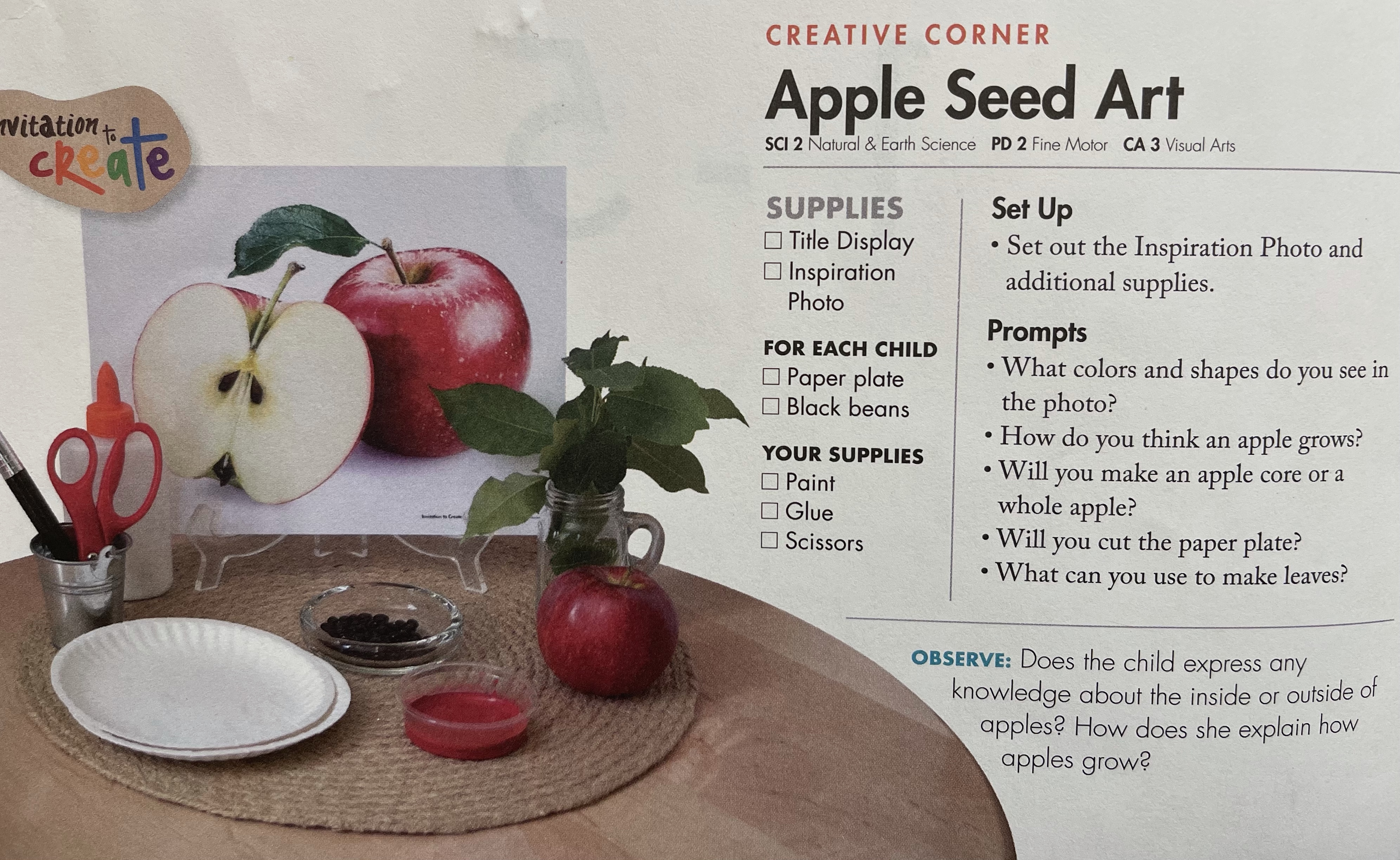 What colors and shapes do you see in the photo? How do you think an apple grows? Will you cut the plate to make an apple core?