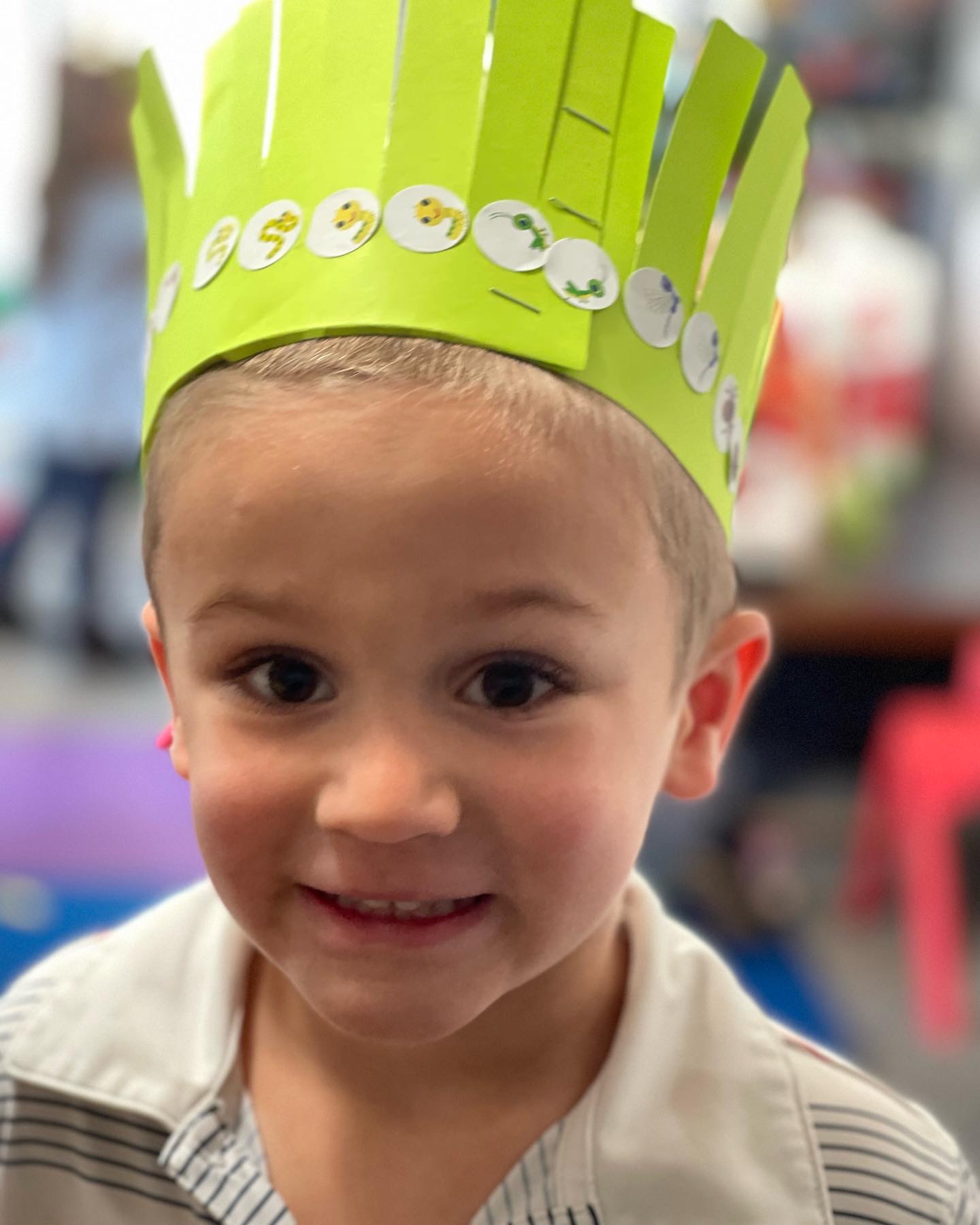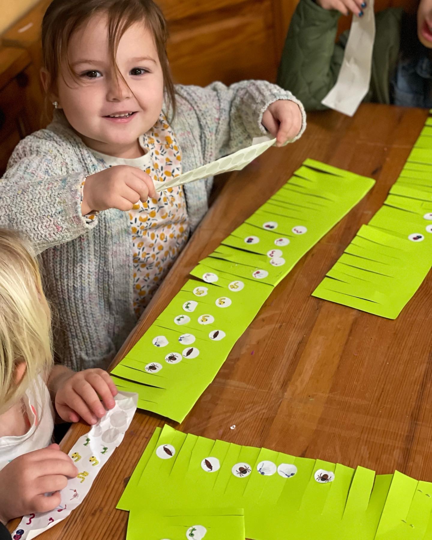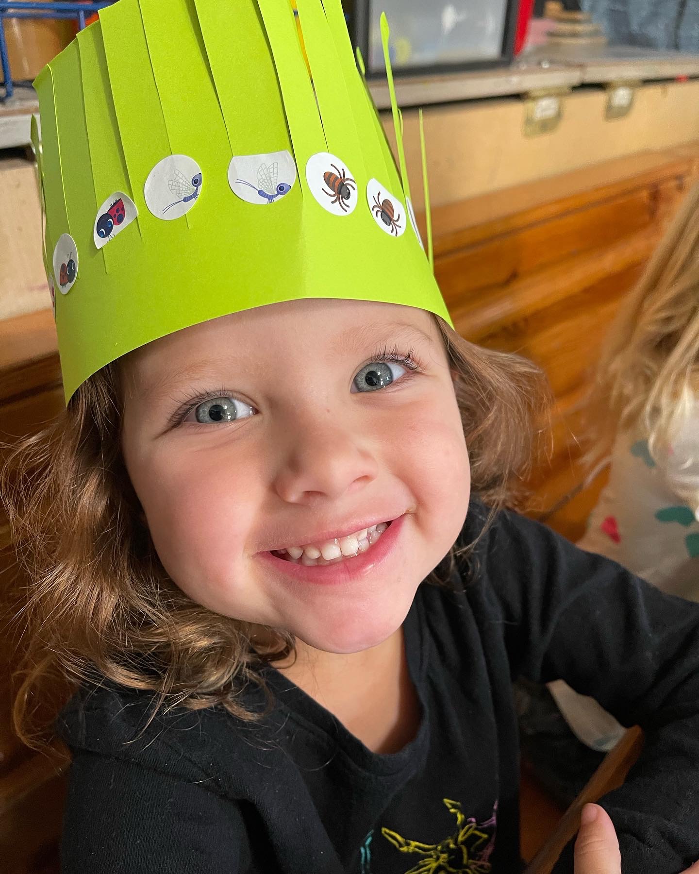 What types of things might you find living in the grass? We talked about the types of bugs that could live in the grasslands or tropical savannas. We put together our grass hats and the kids put bug stickers on them pretending we have bugs in our hair!