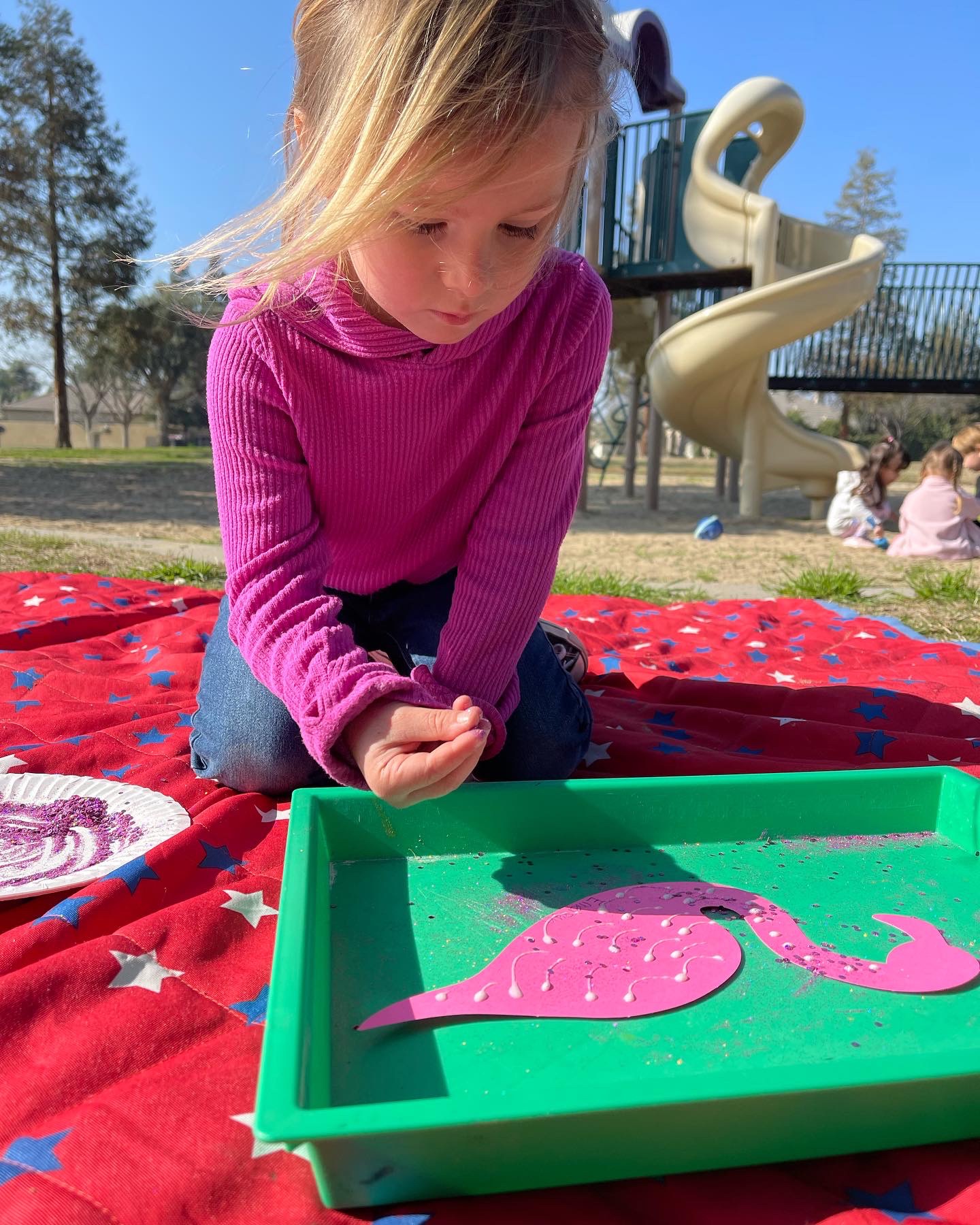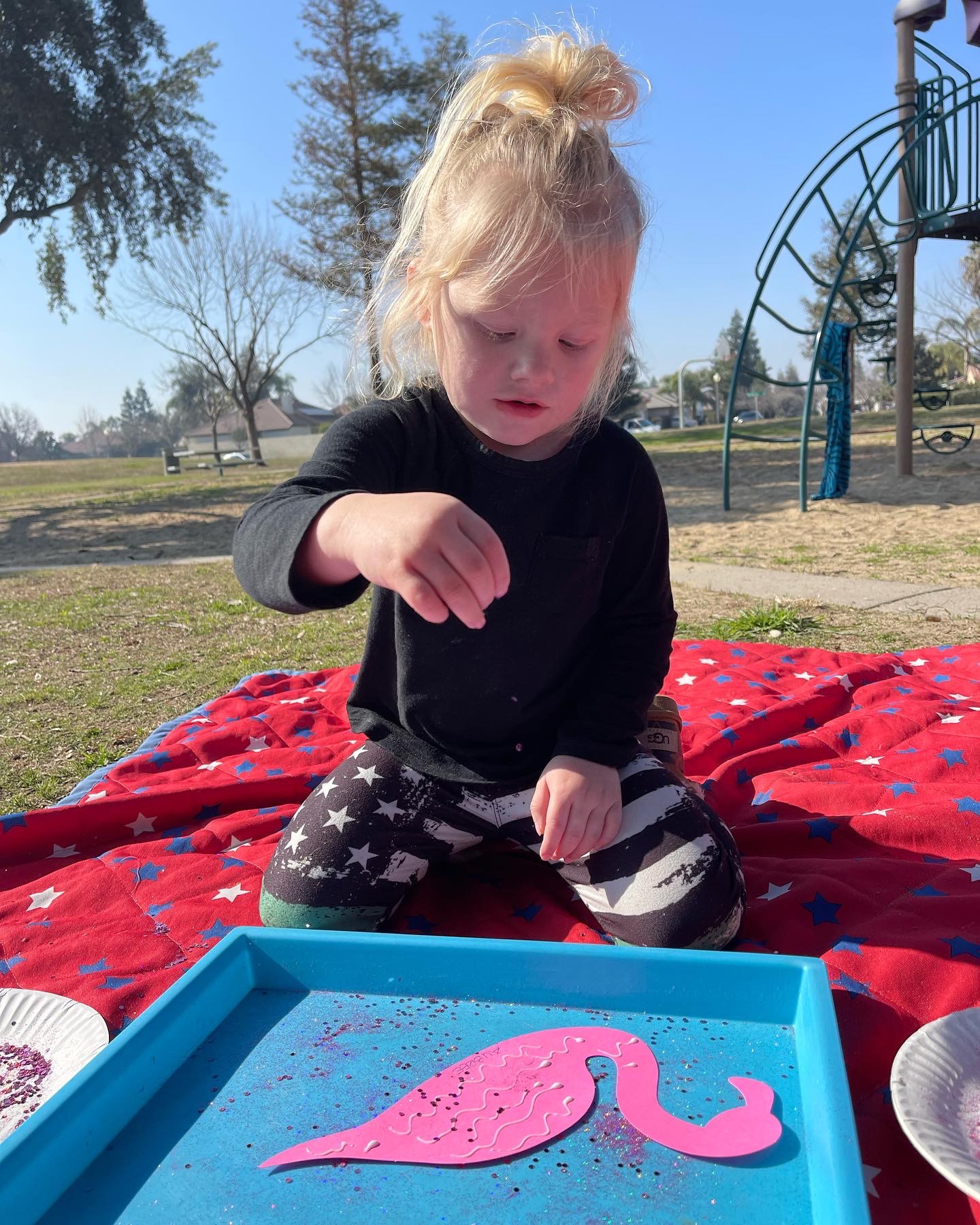 We also learned about birds this week we talked about the Flamingo my kids love flamingos. We decorated our flamingos and talked about what is the longest body part on this bird. We encouraged our kids to stand like a flamingo. We decorated our flamingos with paint and glitter!