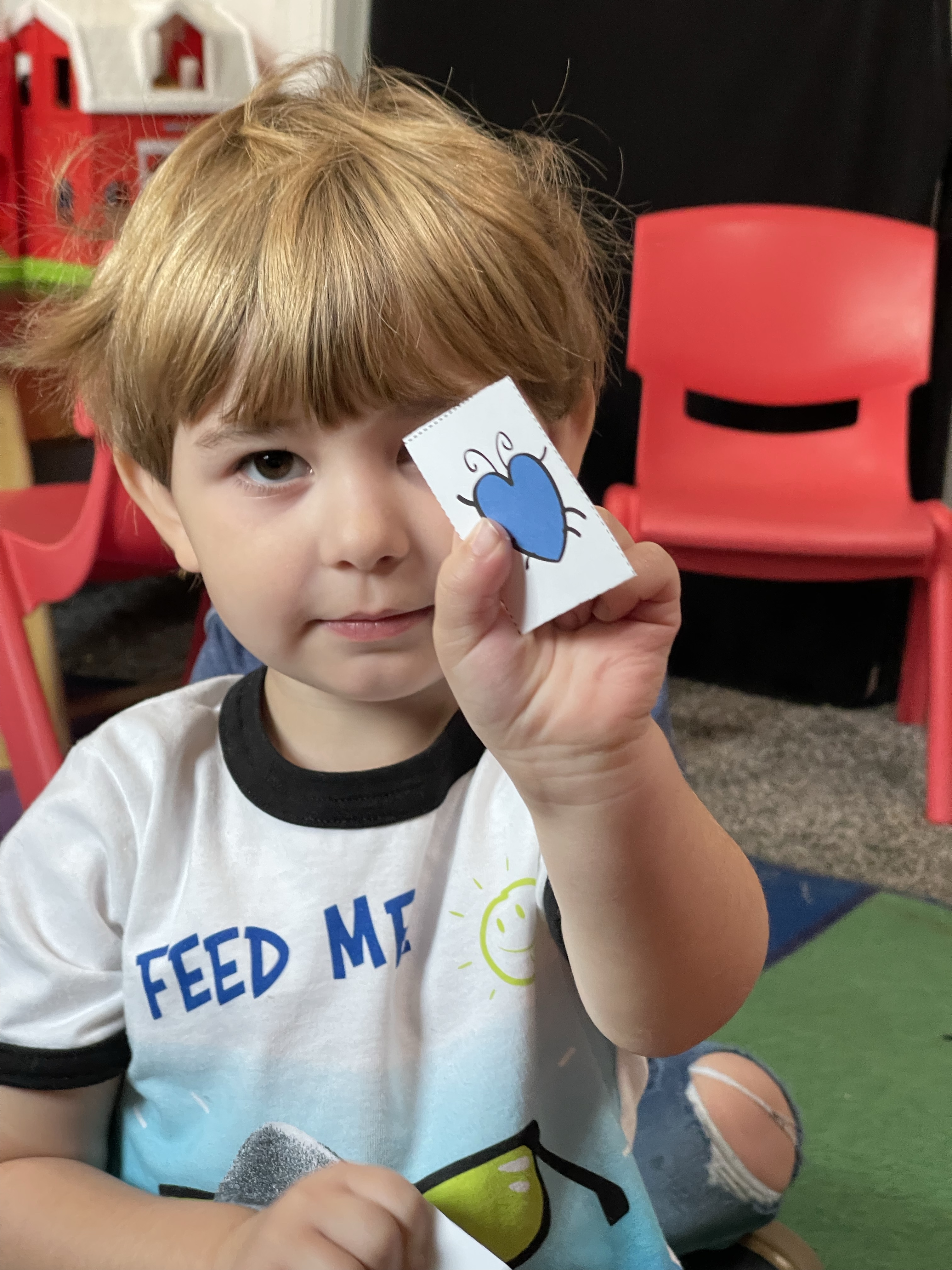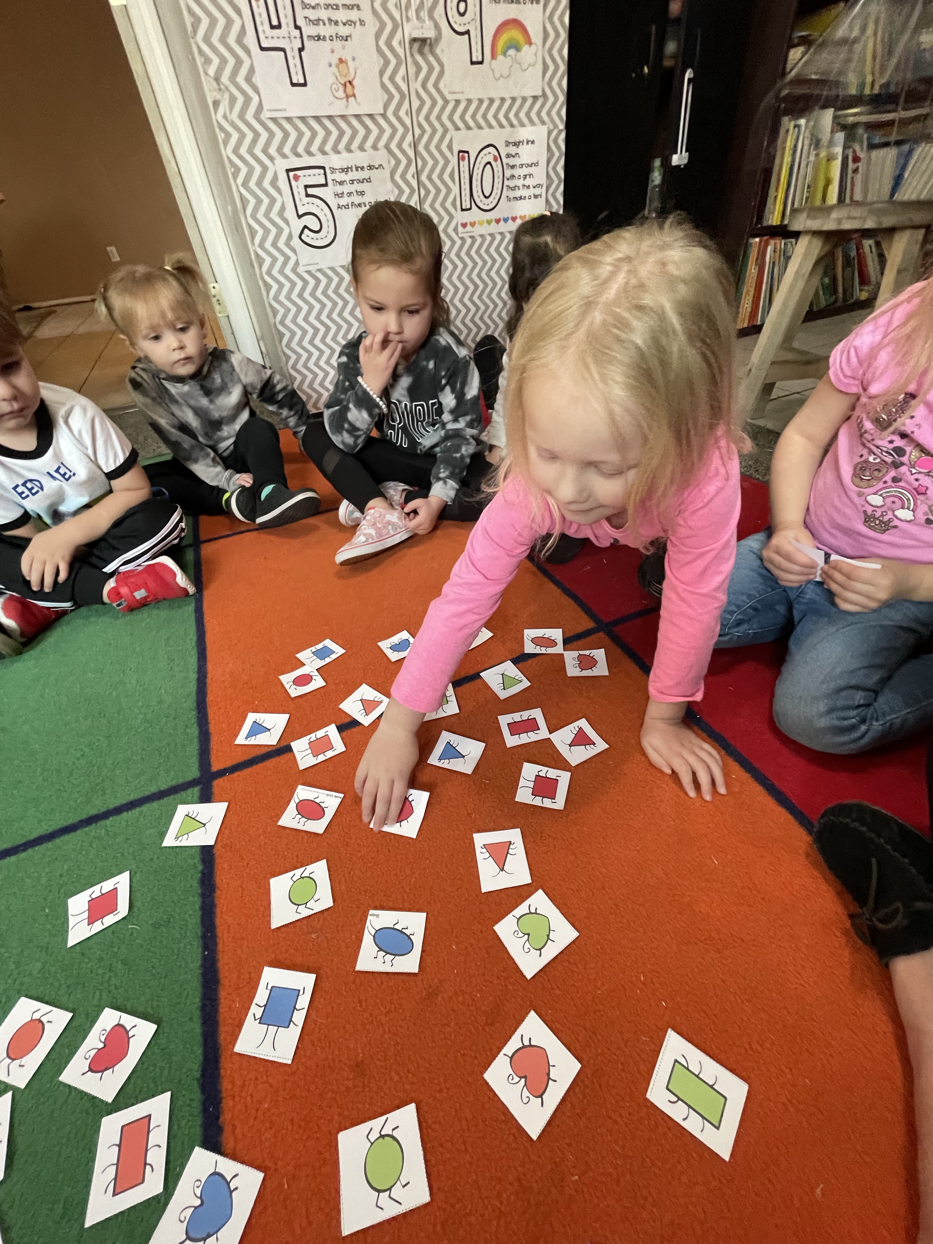 We set out the shape beetle cards and played a game during circle time. Where they would pick a shape and then I would call out a shape they would have to match. We noticed our kids identified the shape of the beetle and the color.