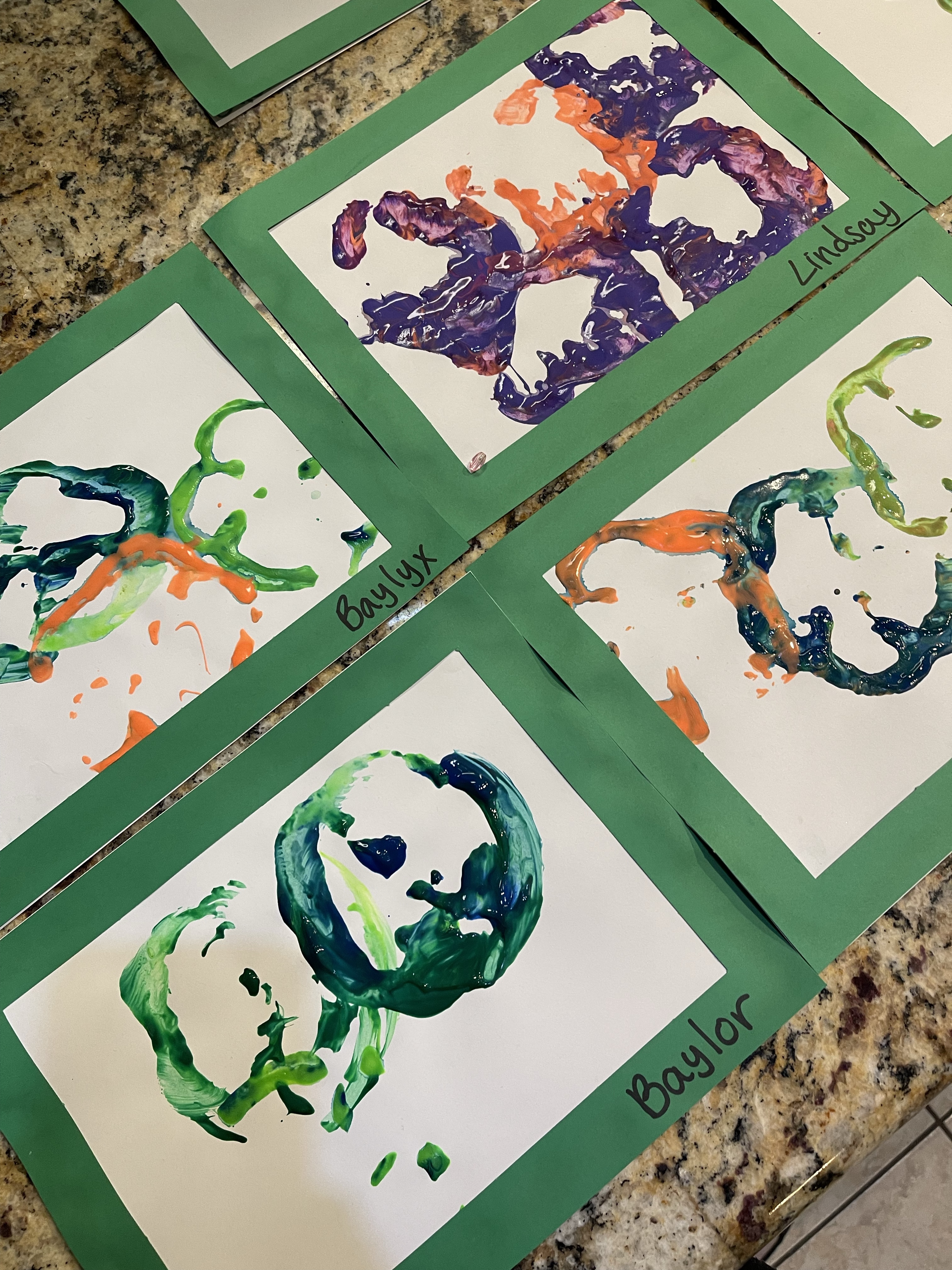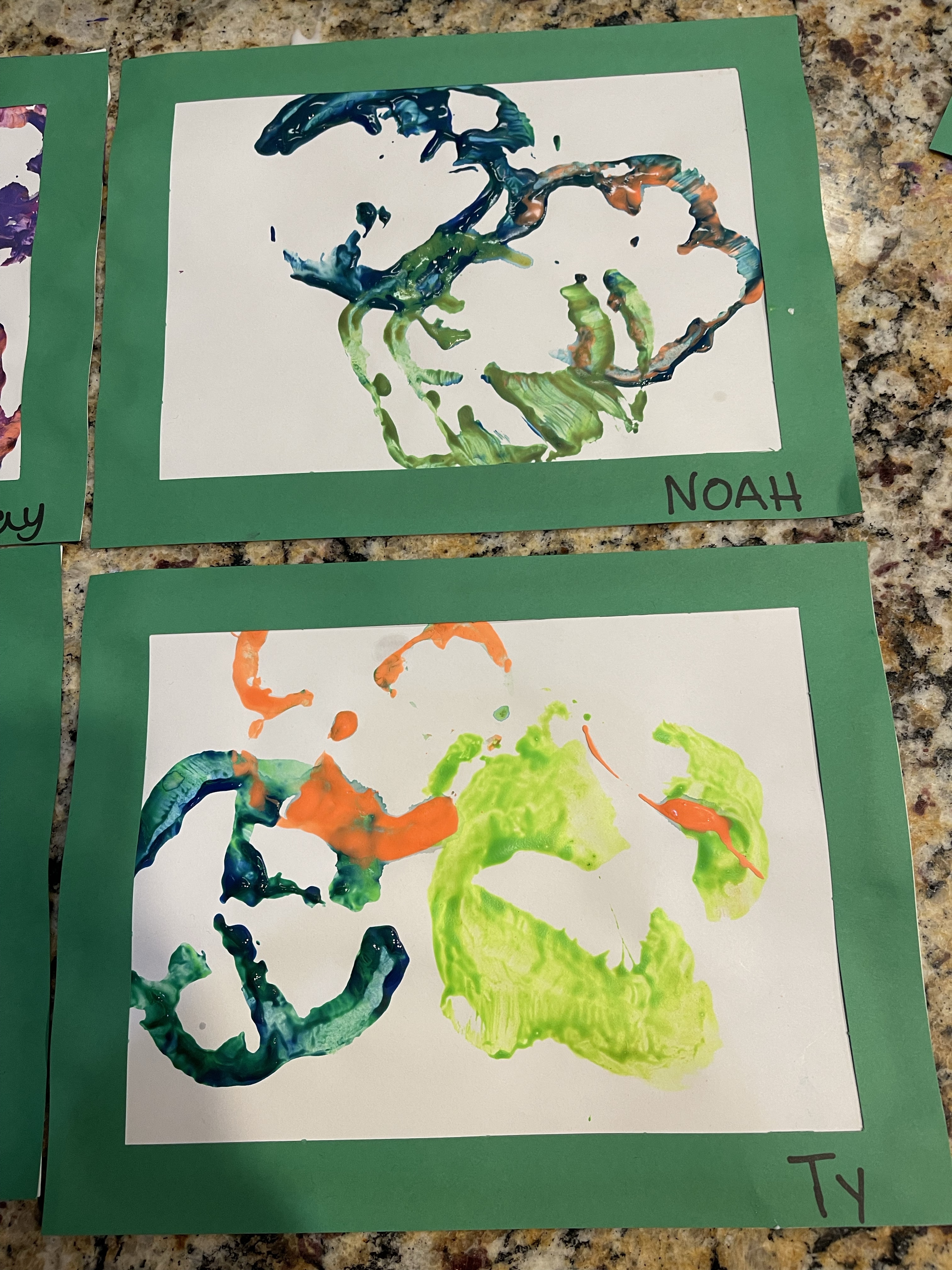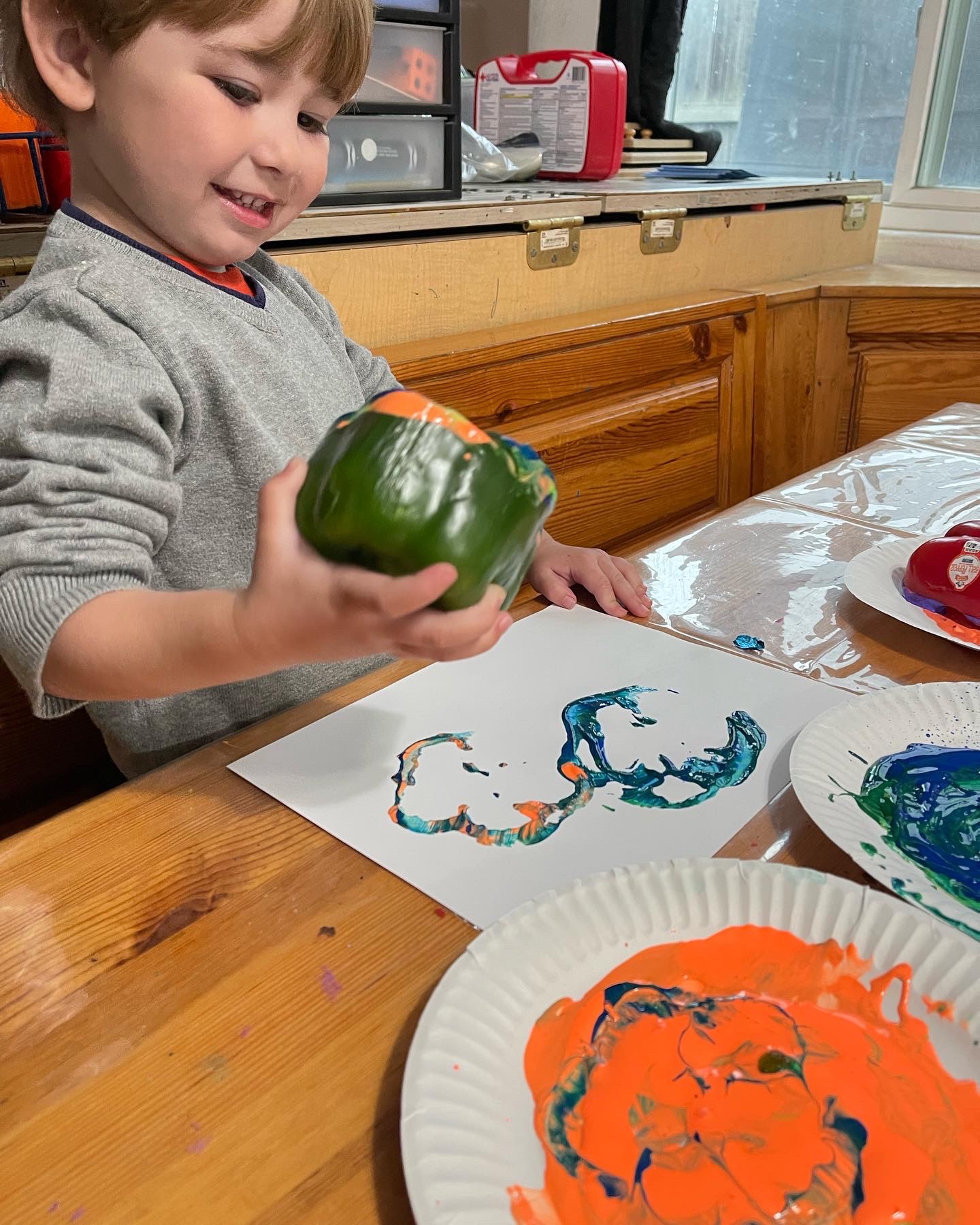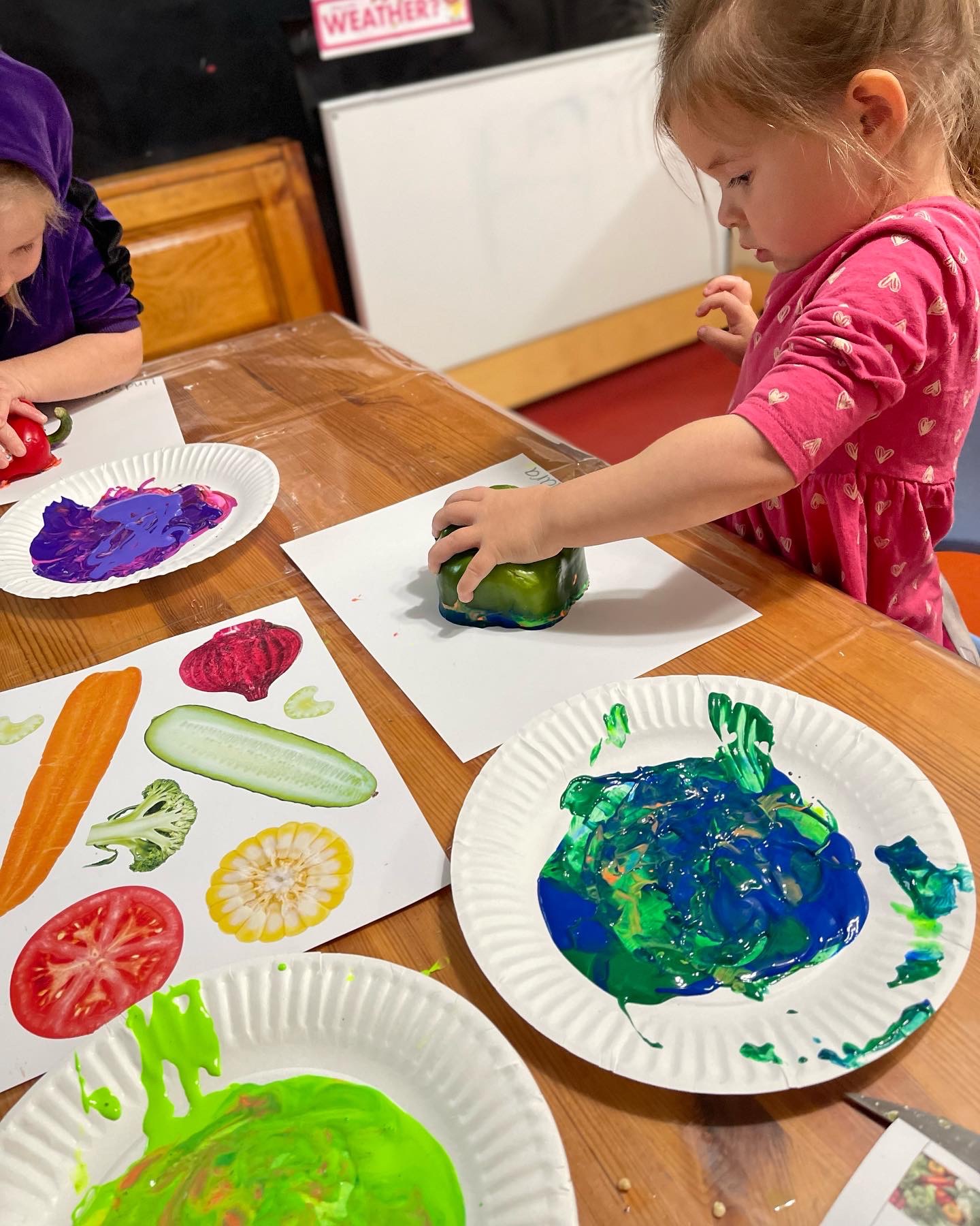What vegetables do you see? What shapes do you think the vegetables will stamp. We set out bell peppers and paint. We then put paint on a paper plate letting the kids choose which color they wanted to paint with. The kids had a hard time grasping the bell peppers because they were slippery but we enjoyed looking at our finished projects.