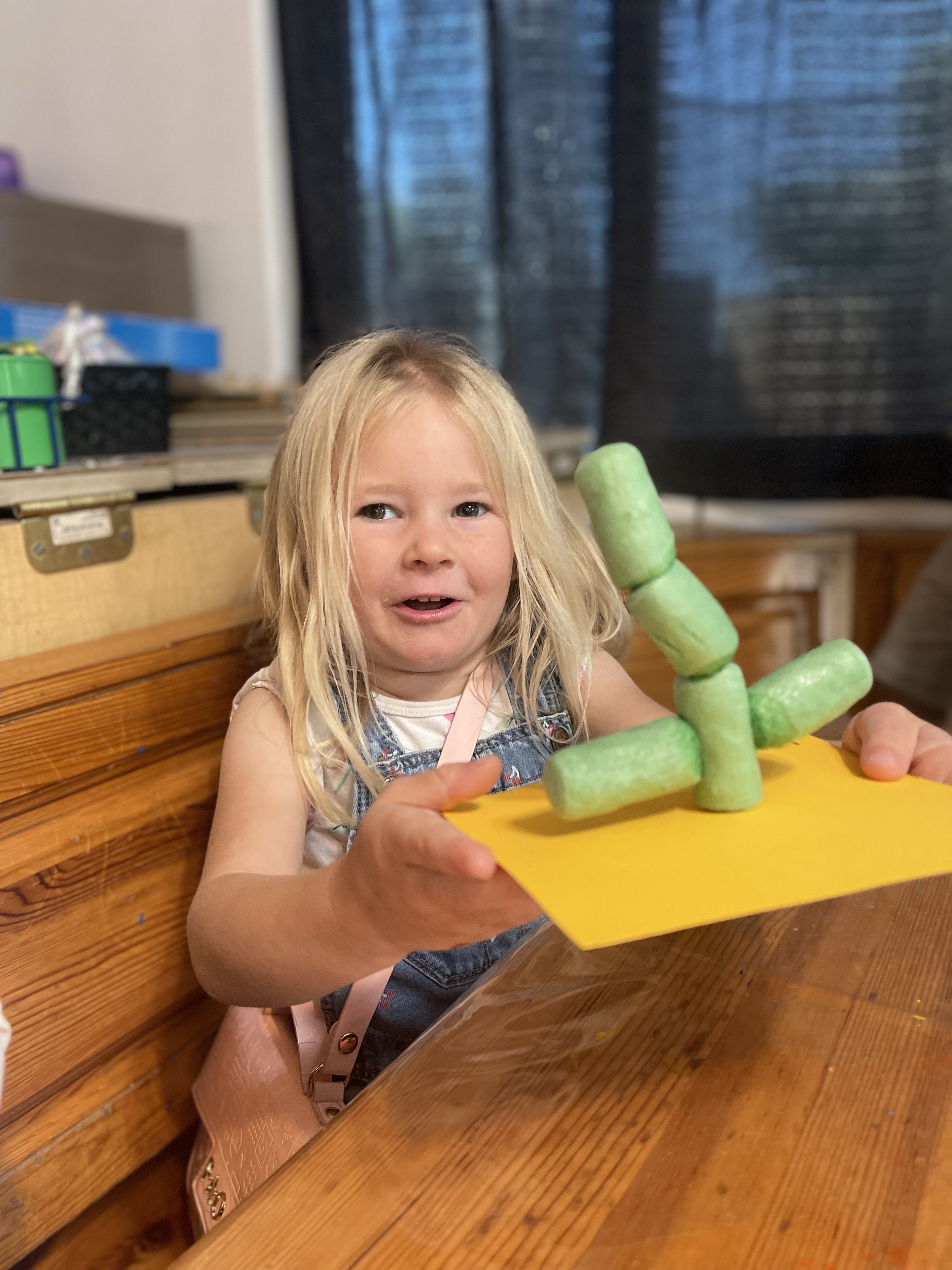 We invited the children to press one noodle onto a wet sponge and then attach it to another noodle. We asked how does it feel? Most of our kids said soft and mushy. They thoroughly loved this activity! We did not have toothpicks so we chose to make non-pokey cactuses.