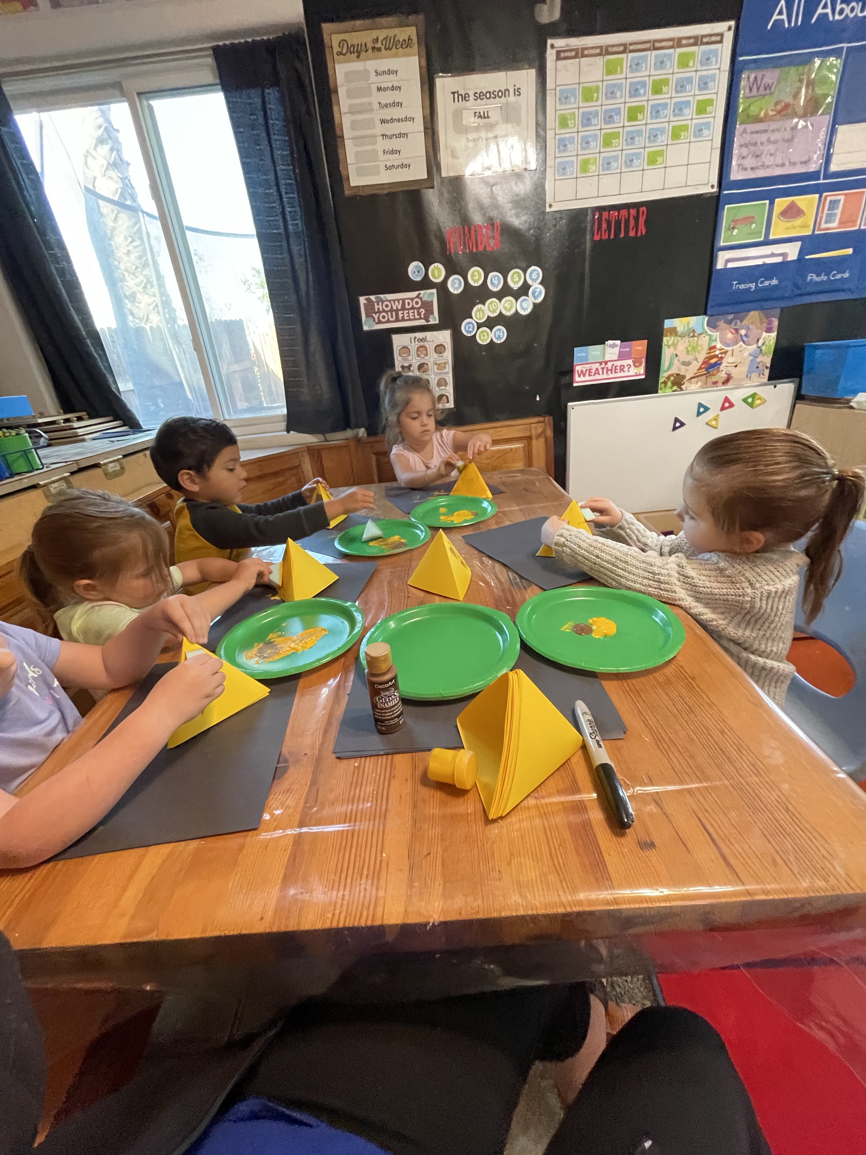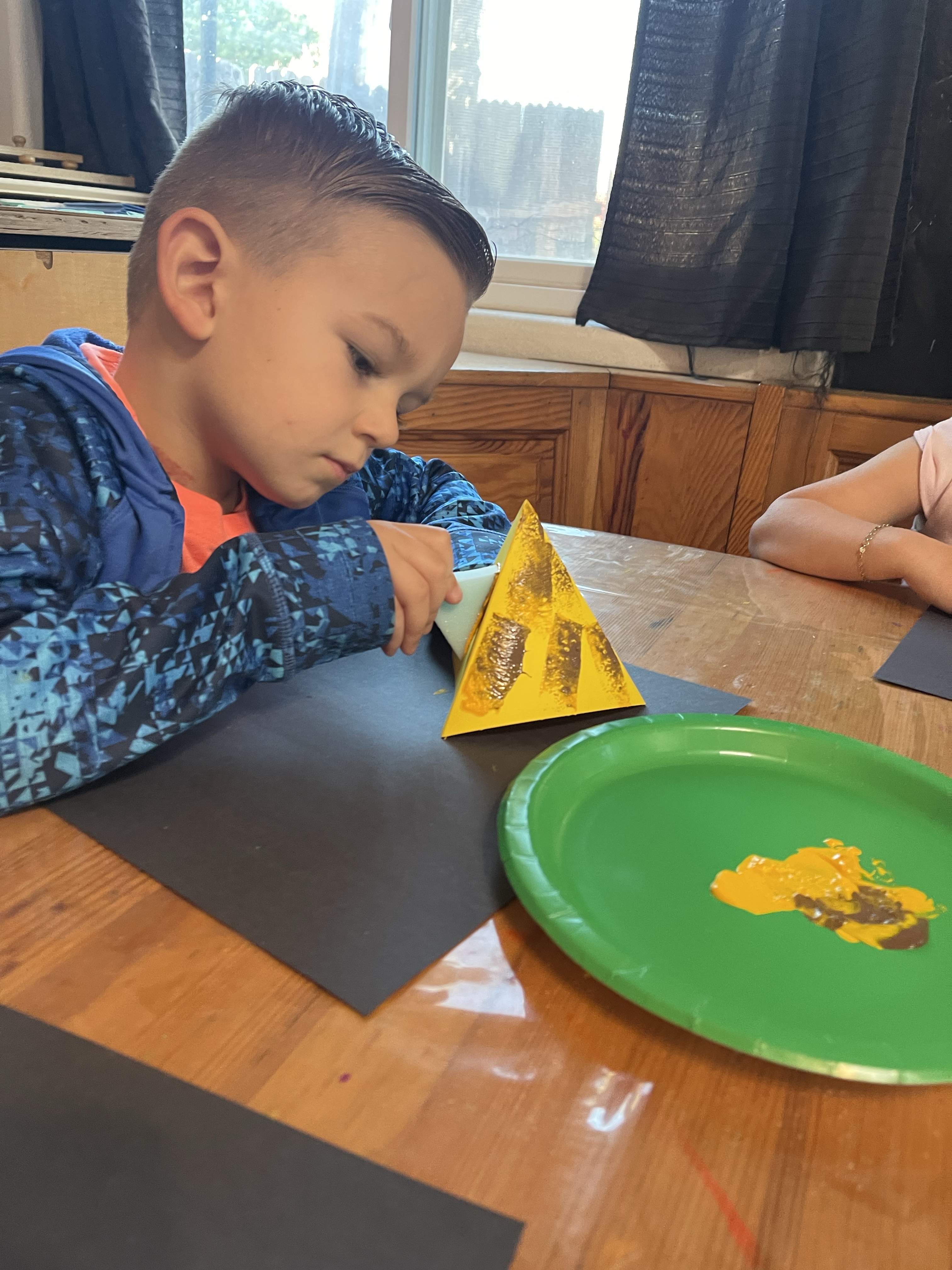 Discovering what lives in the desert! Why is that always so interesting. My kids love learning about different places around the world. We are close to the Mojave Desert but this week we learned about the Sahara. This week we are learning about camels, small desert animals, The Great Pyramid, and the plants of the Sahara. We enjoy learning about the diversity of environments, it helps foster an appreciation for the outside world. We enjoyed making our pyramids with gold and yellow paint.