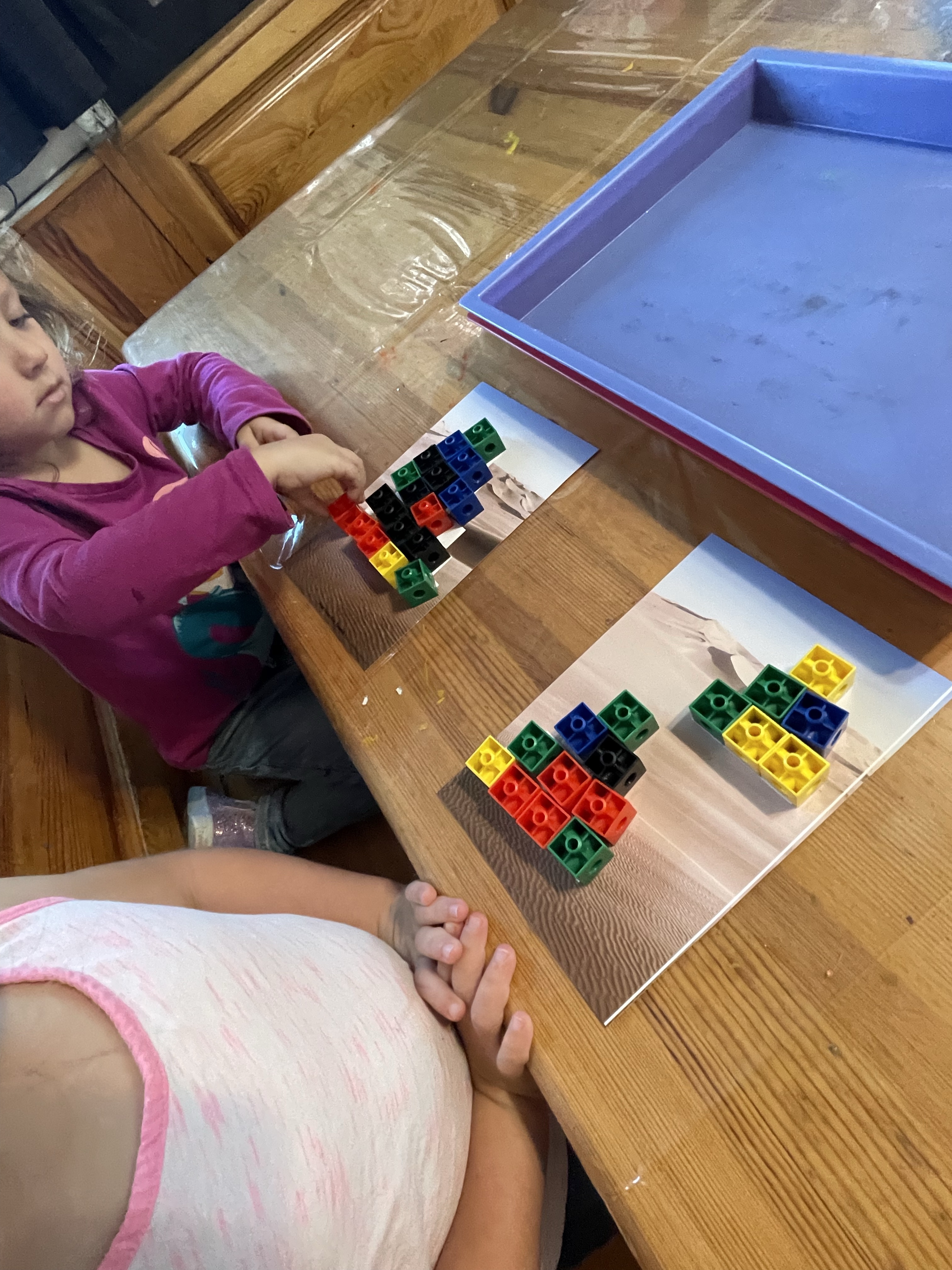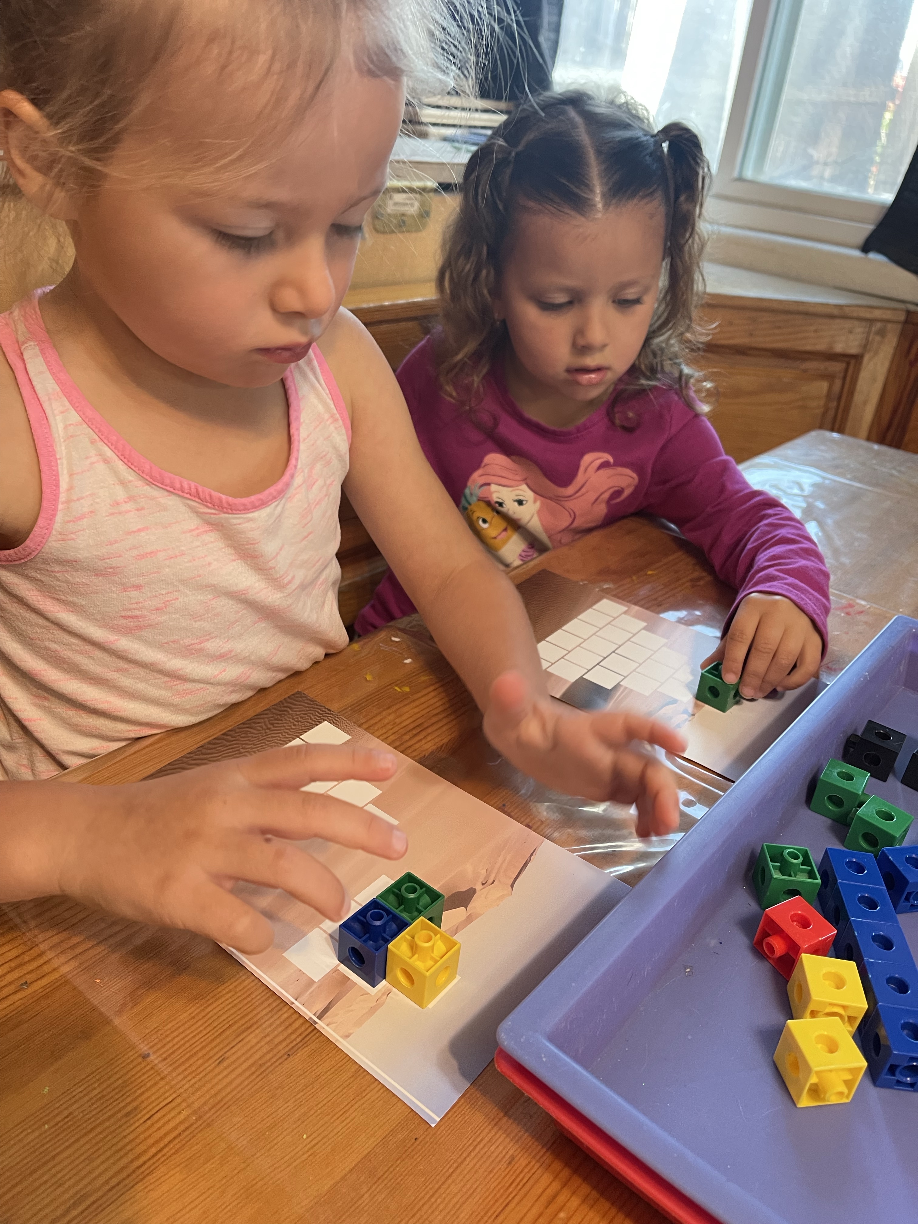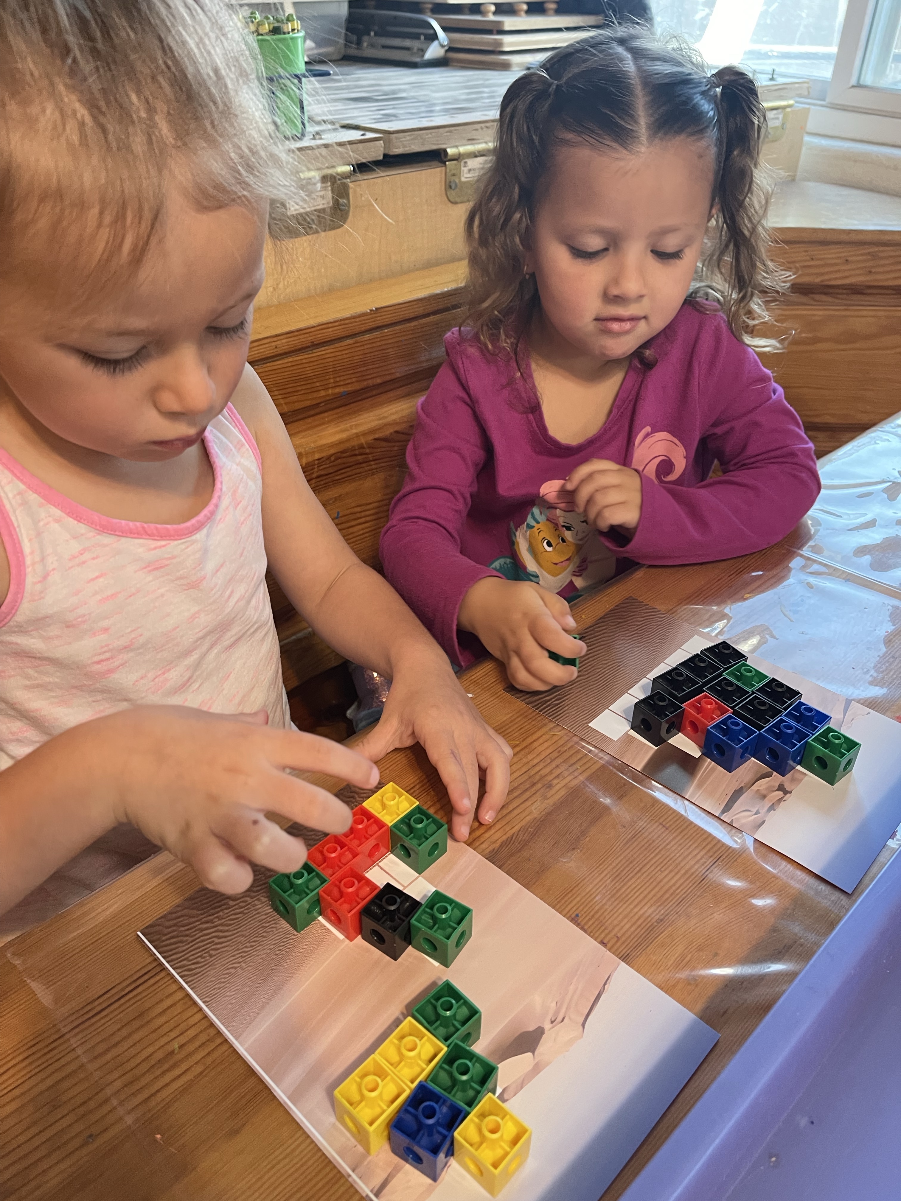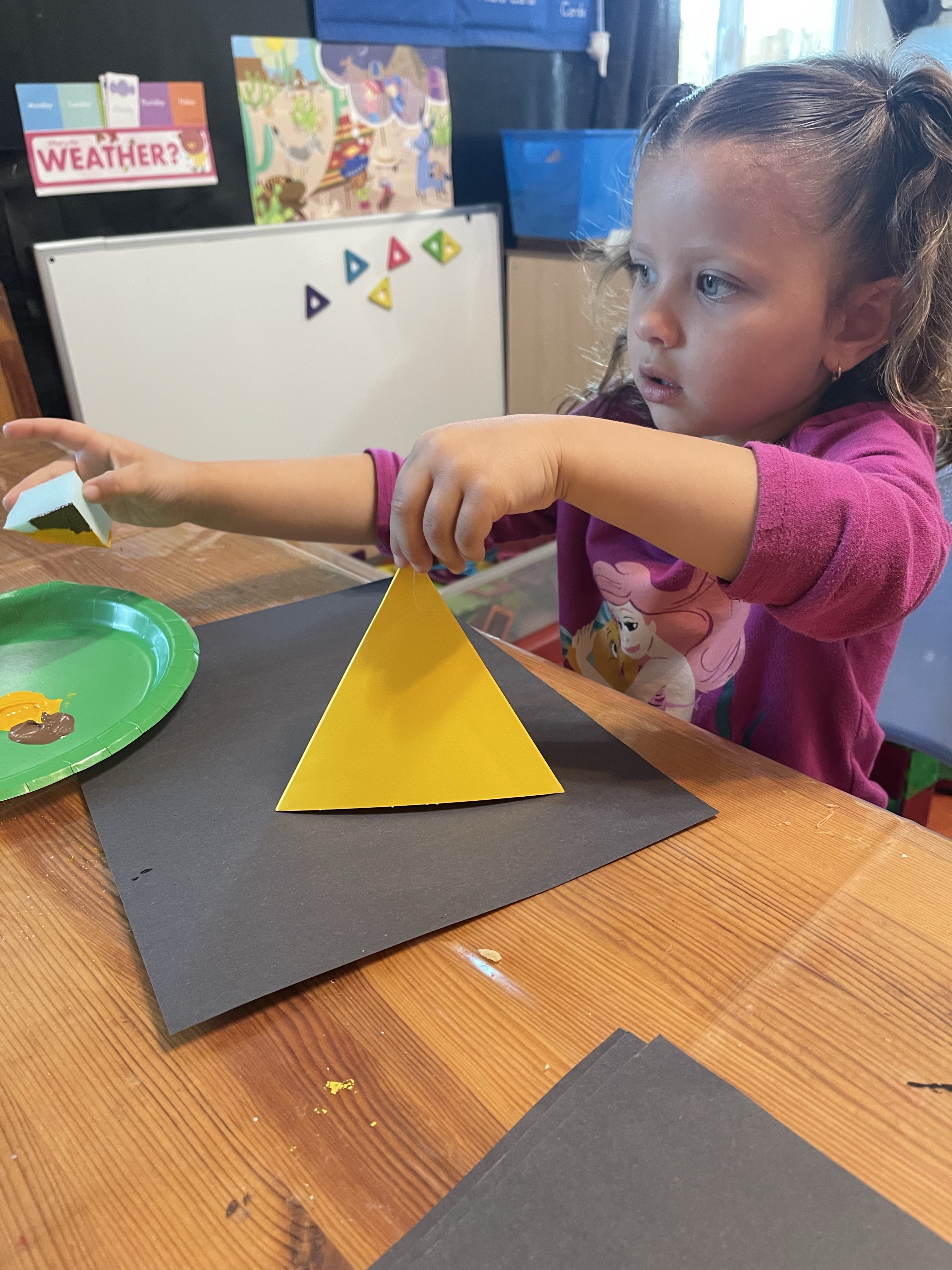 Experience Early Learning Curriculum Literacy activities are so engaging they help them to develop logic and reasoning in this activity and they don’t even feel like they are learning. We set out our Shape Design Mats and encourage the children to take turns playing the cubes to create the pyramid shapes.