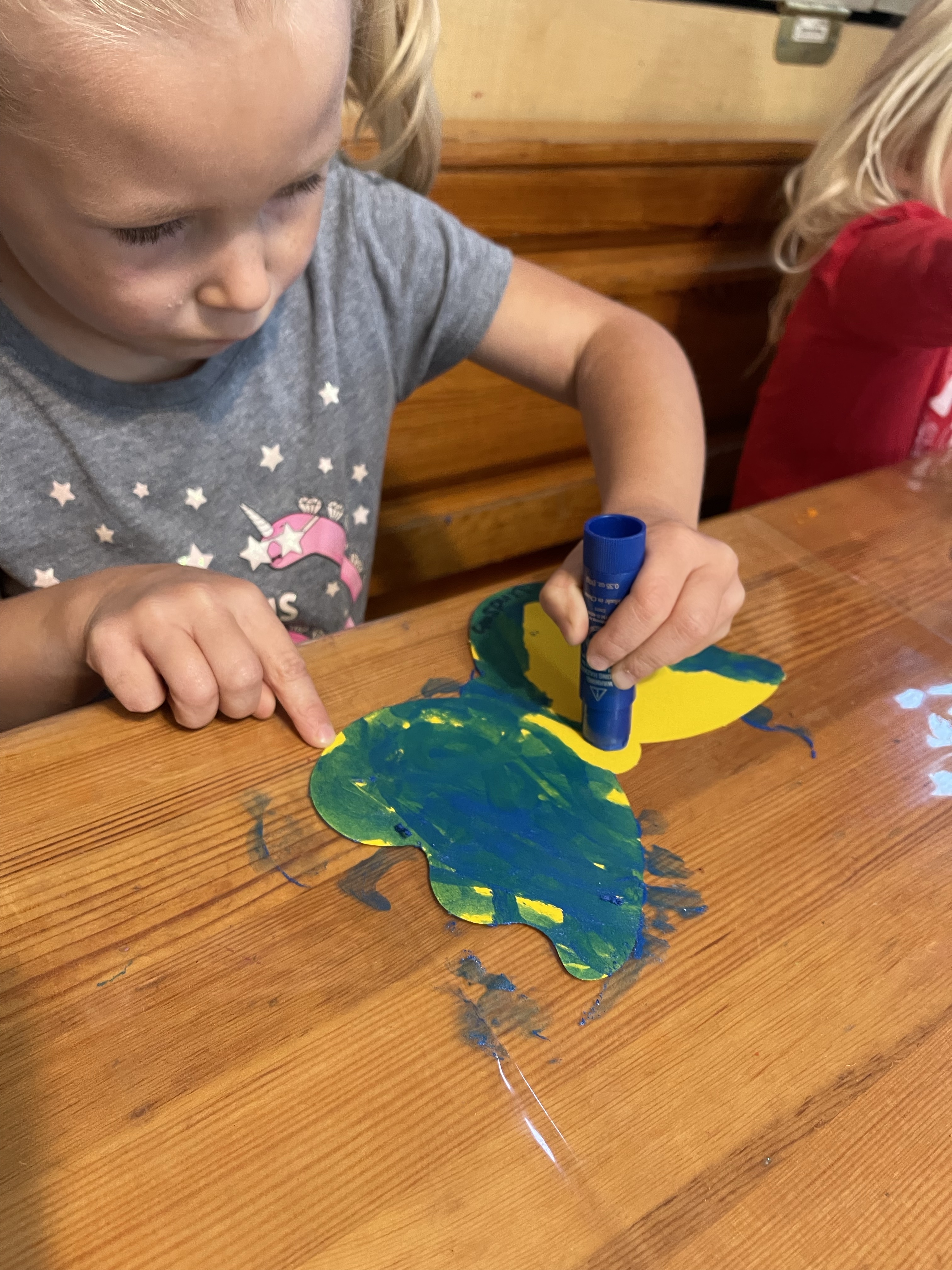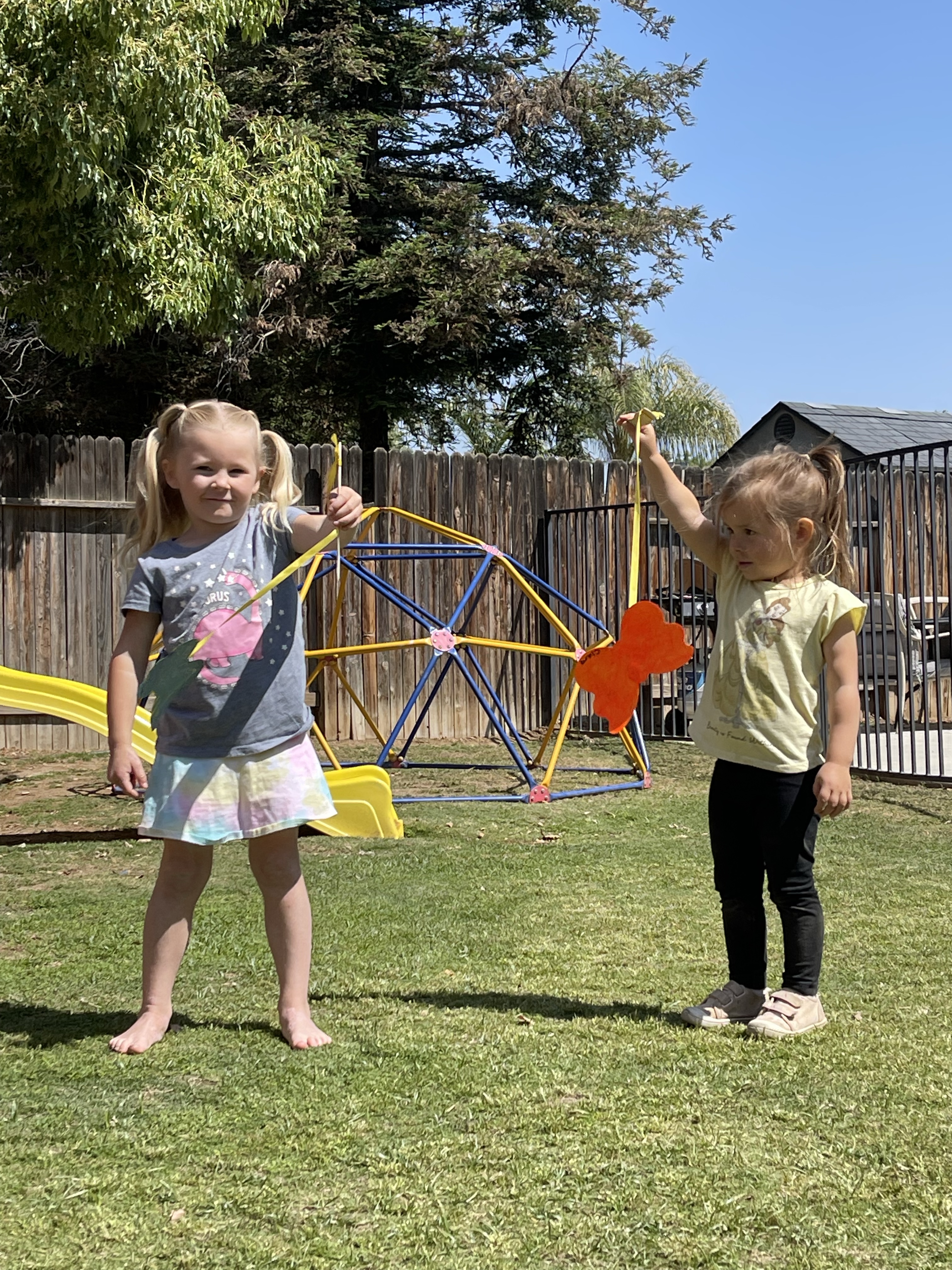 In this activity, we worked on dance and movement. We talked about if we were a butterfly where would we like to fly? We invited the children to decorate their paper butterflies then after attaching them to the ribbon we took them to the backyard to fly them like a kite.