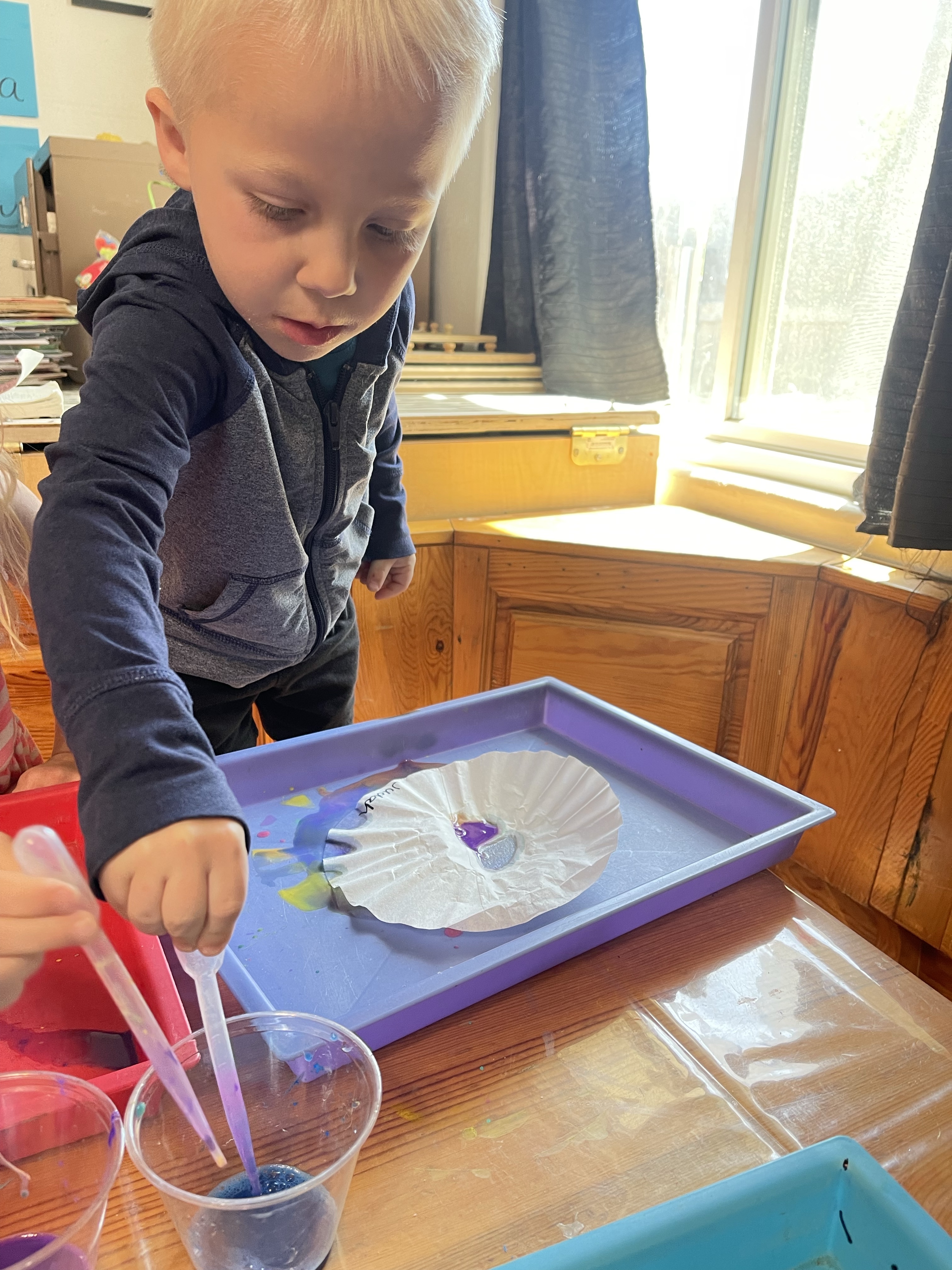 We used eye droppers to pretend we were butterflies drinking up water. Then squeeze it into our coffee filters to make our butterflies. Our children did pretty well on controlling and squeezing the eyedropper.